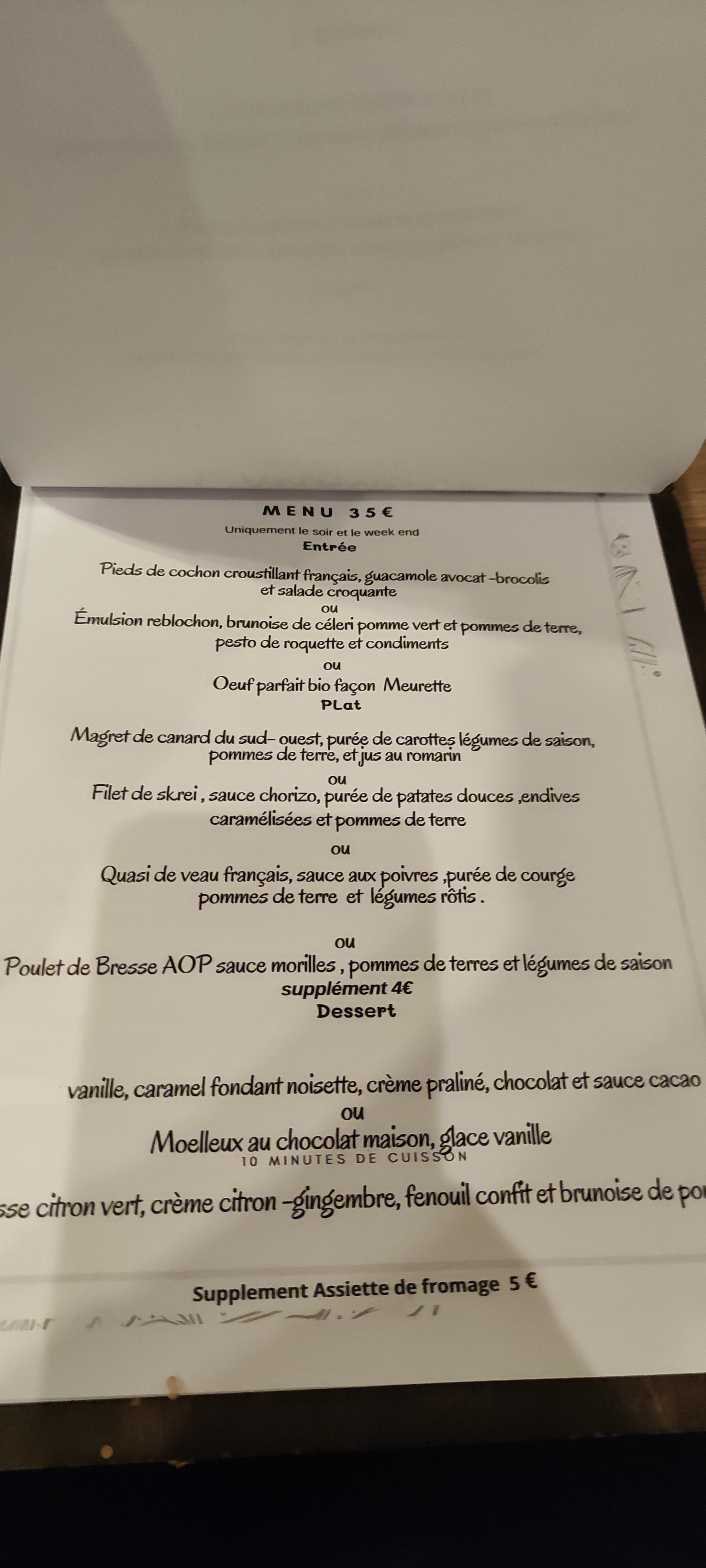 Une carte proposant des produits frais et de saison fait avec un grand soin et fait maison. Un service simple et efficace. Un très bon rapport qualité prix. Je vous conseille de réserver car il est souvent complet Les tables sont espacées entre elle, ce qui est vraiment très agréable