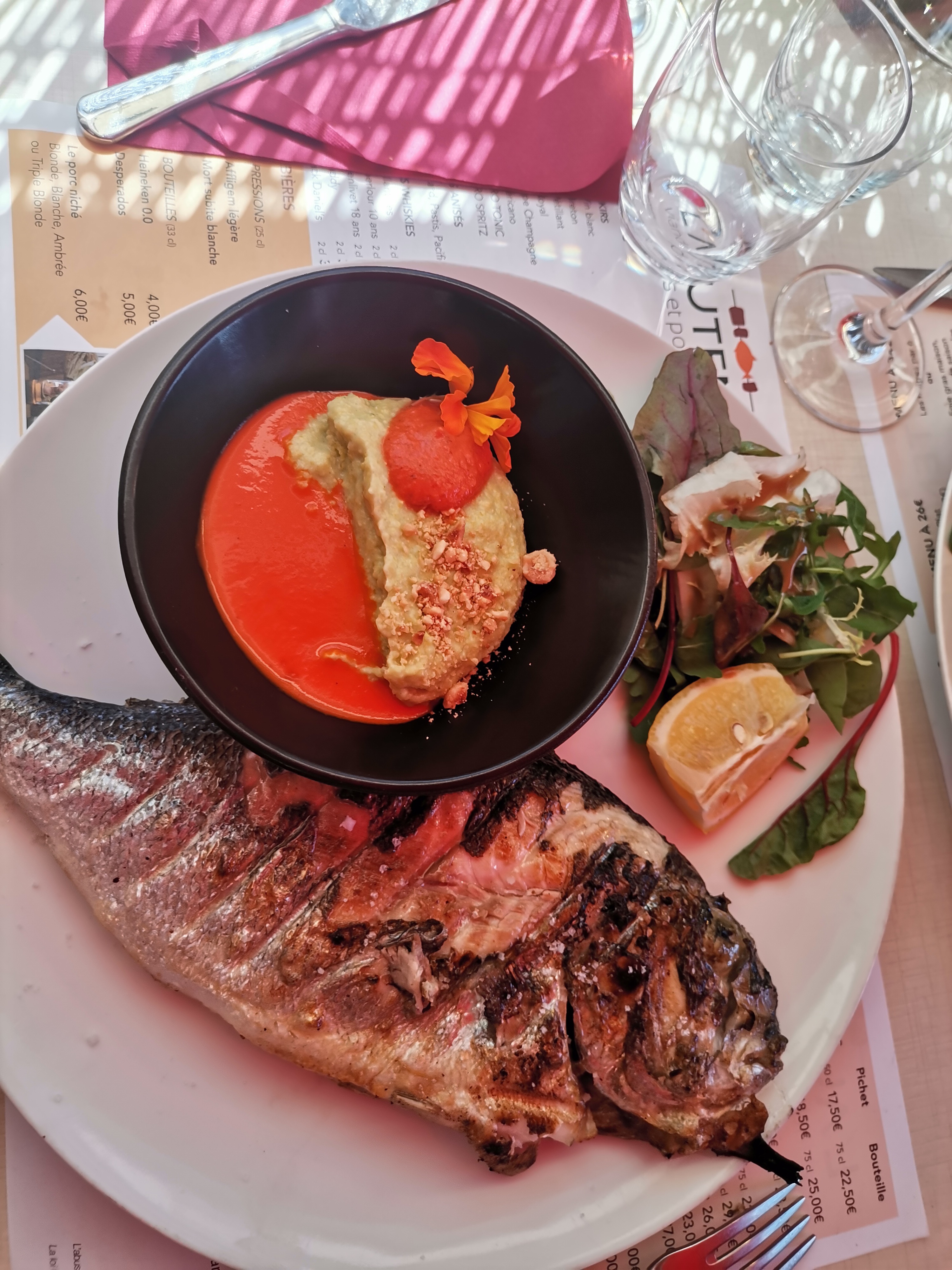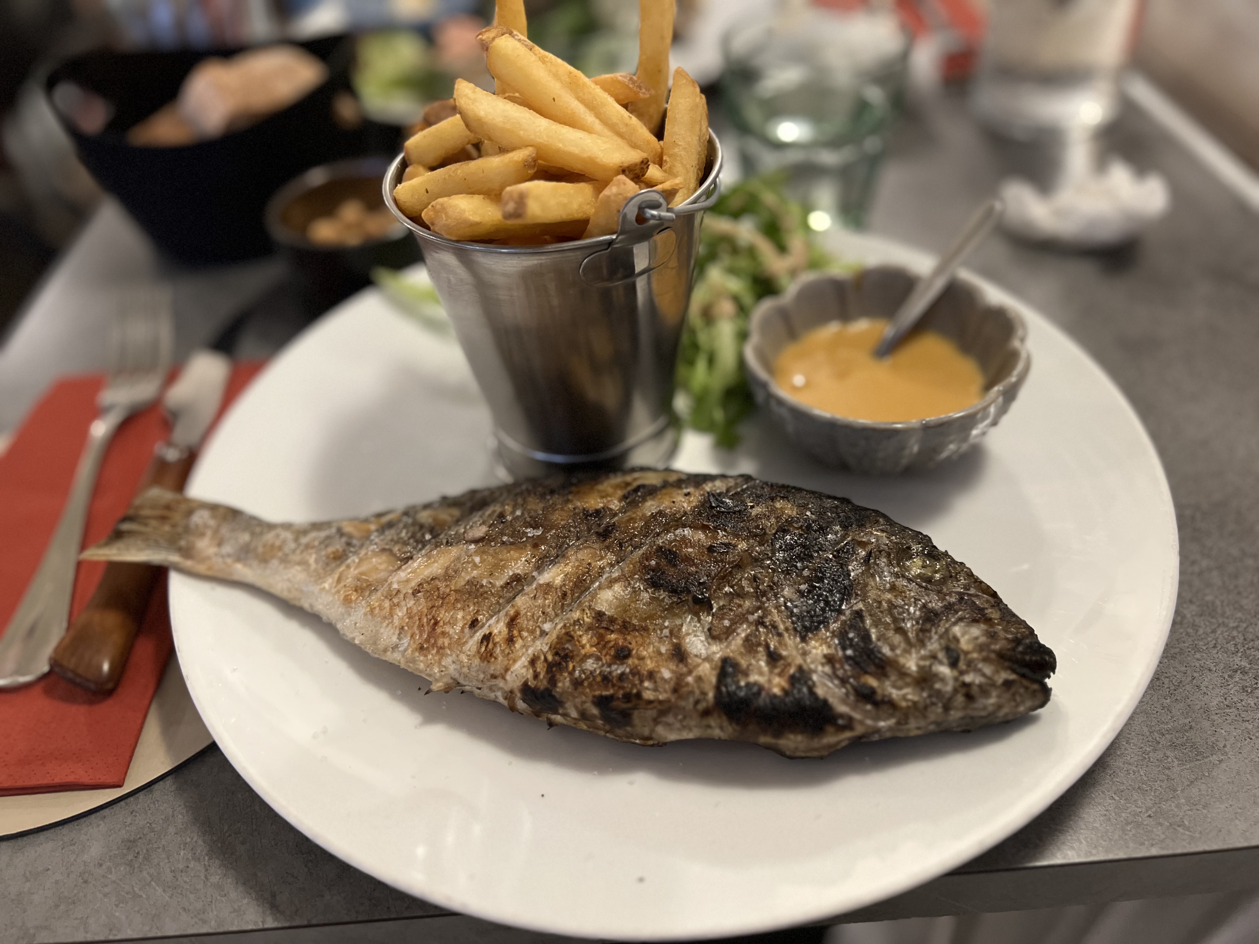 Déjà une belle ambiance conviviale, une équipe chaleureuse et…. Une dorade ainsi que des sardines grillées exquises ! Allez-y les yeux fermés.