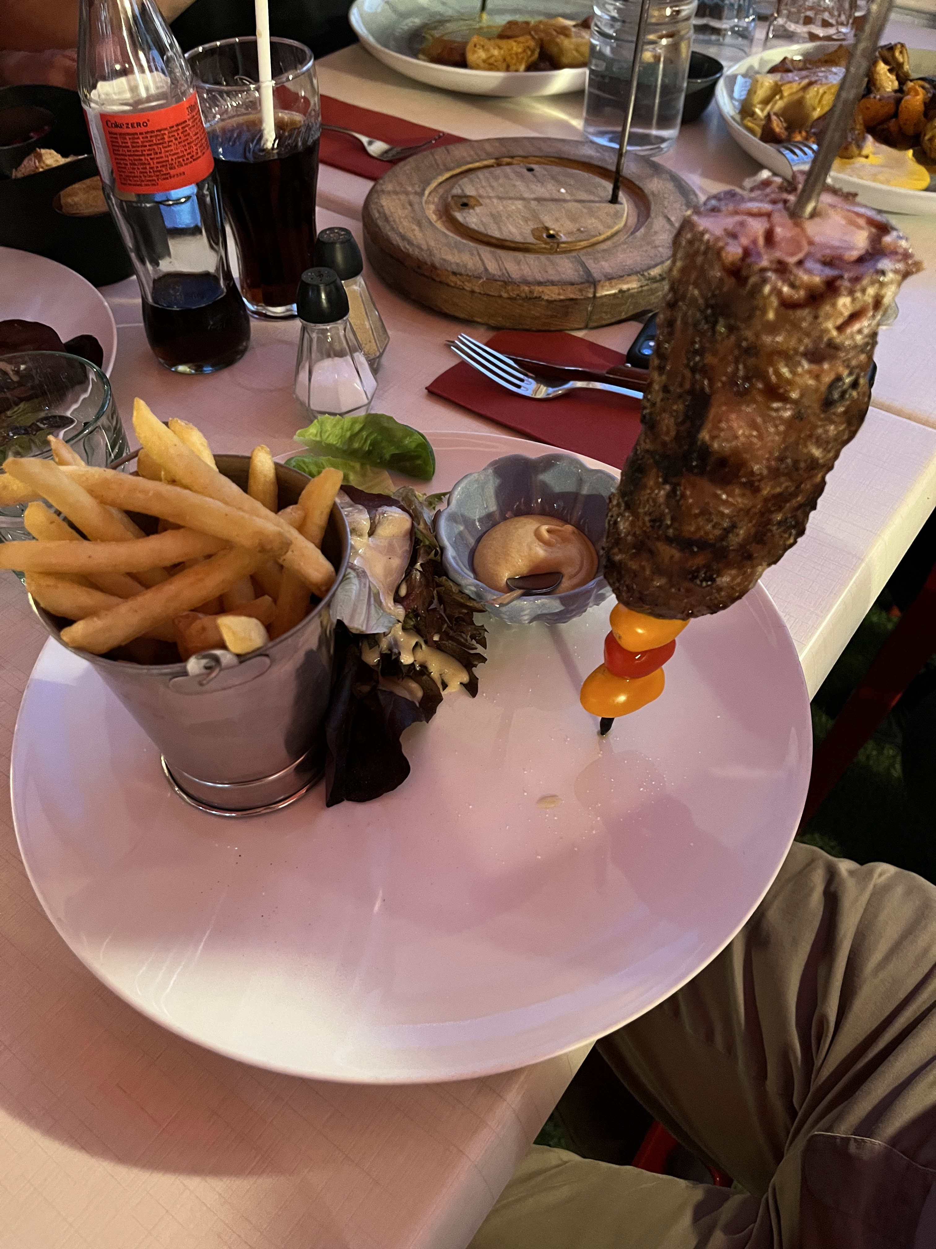 Ne cherchez pas votre viande dans votre assiette, elle est suspendue à une brochette. Les topinambours sont un régal avec le petit écrasé de pomme de terre. N'hésitez pas, l'accueil est souriant.