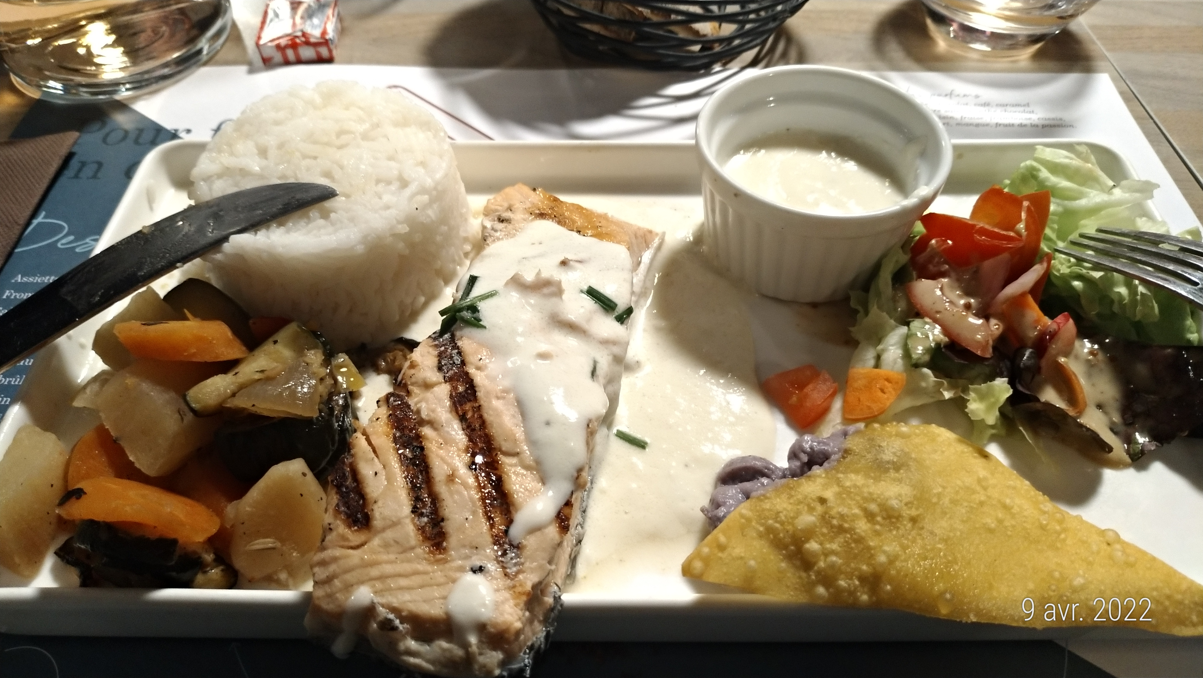 Pas exceptionnel,le repas.Brochette de boeuf avec du nerf, jardinière de légume insipide.