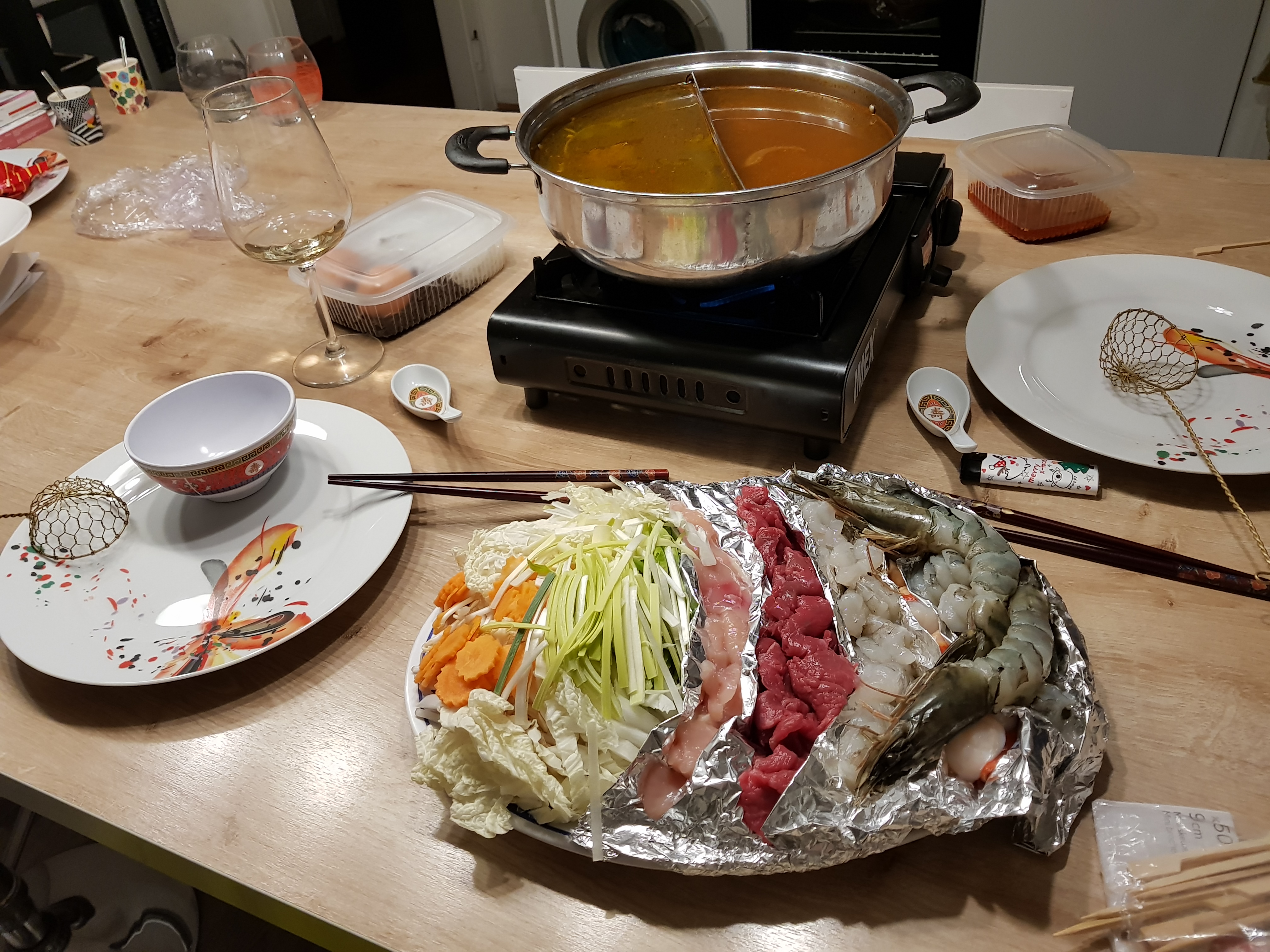 Ce soir nous avons testé la fondue thaï à emporter. Nous avons opté pour la version mixte fruits de mer/viande. Servie avec legumes, vermicelles, champignons noirs, noix de st Jacques, crevettes, gambas, poulet, boeuf. Et tout est fourni : rechaud, bol, baguettes, etc...C'etait excellent et tres tres copieux. Nous pouvons faire un 2eme repas. Merci au chef