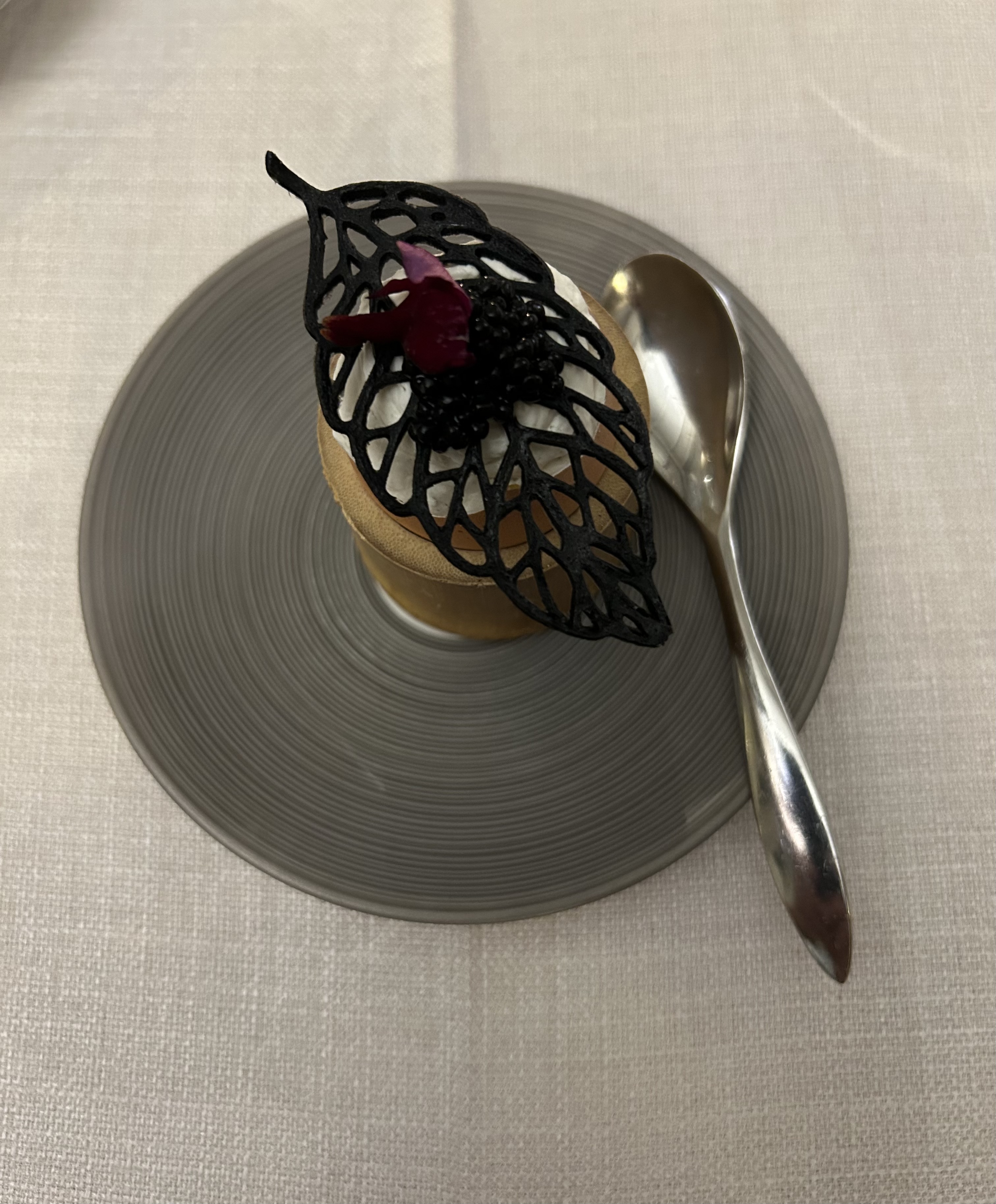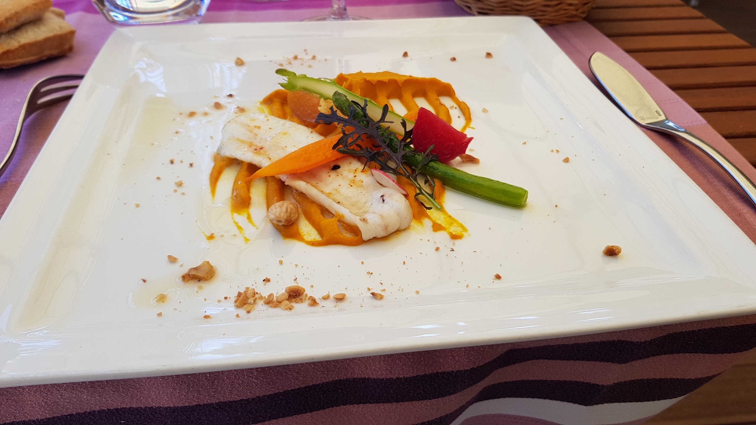 Une atmosphère sereine toute en teintes de gris. Un personnel souriant et affable. A table, de vraies réussites mêlant les saveurs et les textures. Des produits de toute fraîcheur. Mais une déception pour les médaillons de bœuf dont la tendreté n’était pas au rendez-vous. En dessert le blanc manger aux cerises était un vrai délice.