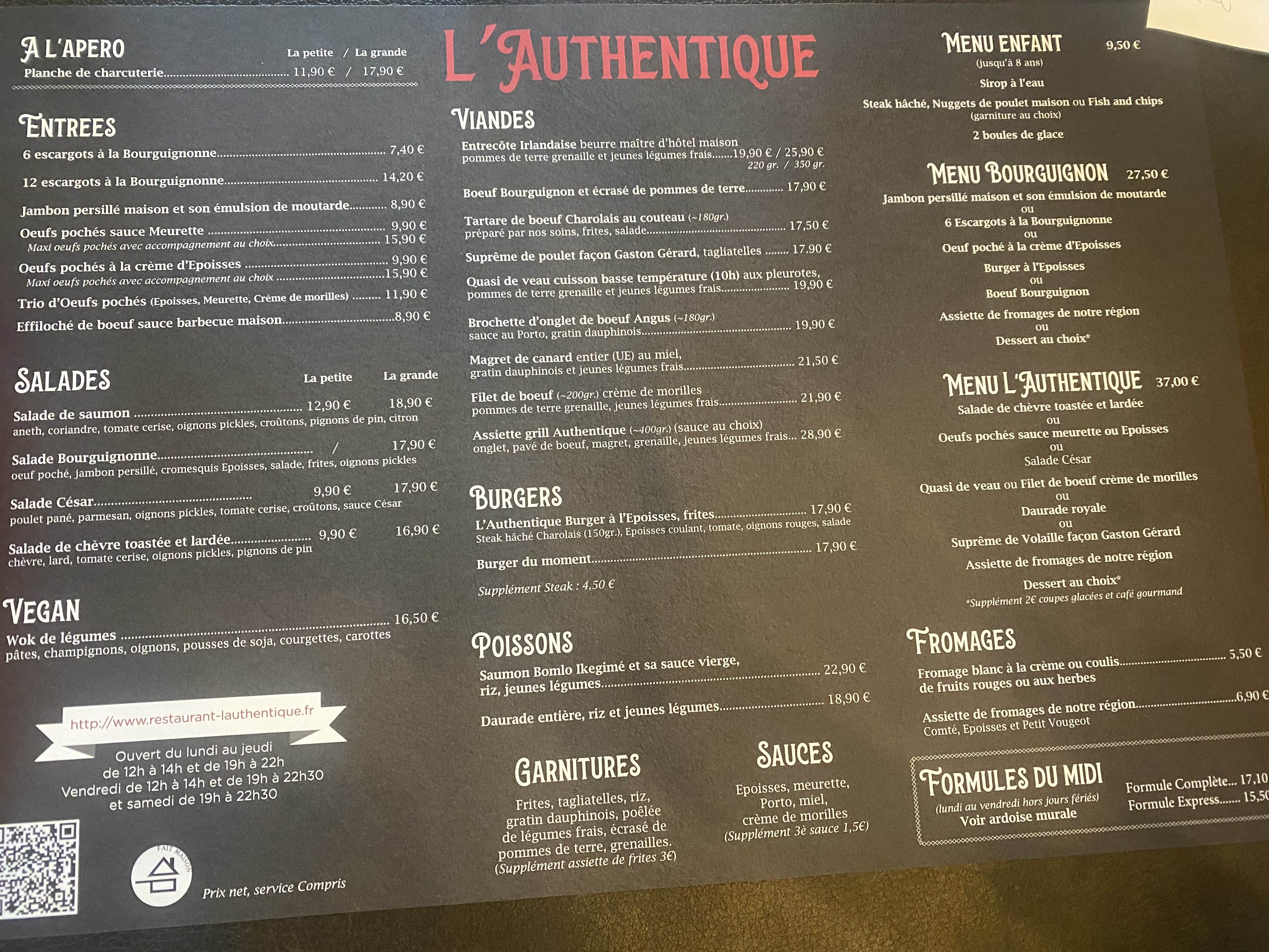 Très bonne cuisine, un service très agréable dans un endroit très sympa. Nous avons passé une nuit à l hôtel Holiday In à côté de l Authentique restaurant, et avions décidé de dîner dans ce restaurant. Vraiment une belle découverte les plats sont très bons et copieux le service excellent. Nous avons opté pour les oeufs pochés ds une crème à l époisse accompagné de petits légumes frais, un REGAL. Merci pour ce bon moment. Même les glaces étaient excellentes. Nous reviendrons certainement. Nous vous souhaitons tout le meilleur pour que votre restaurant connaisse le succès qu il mérite.