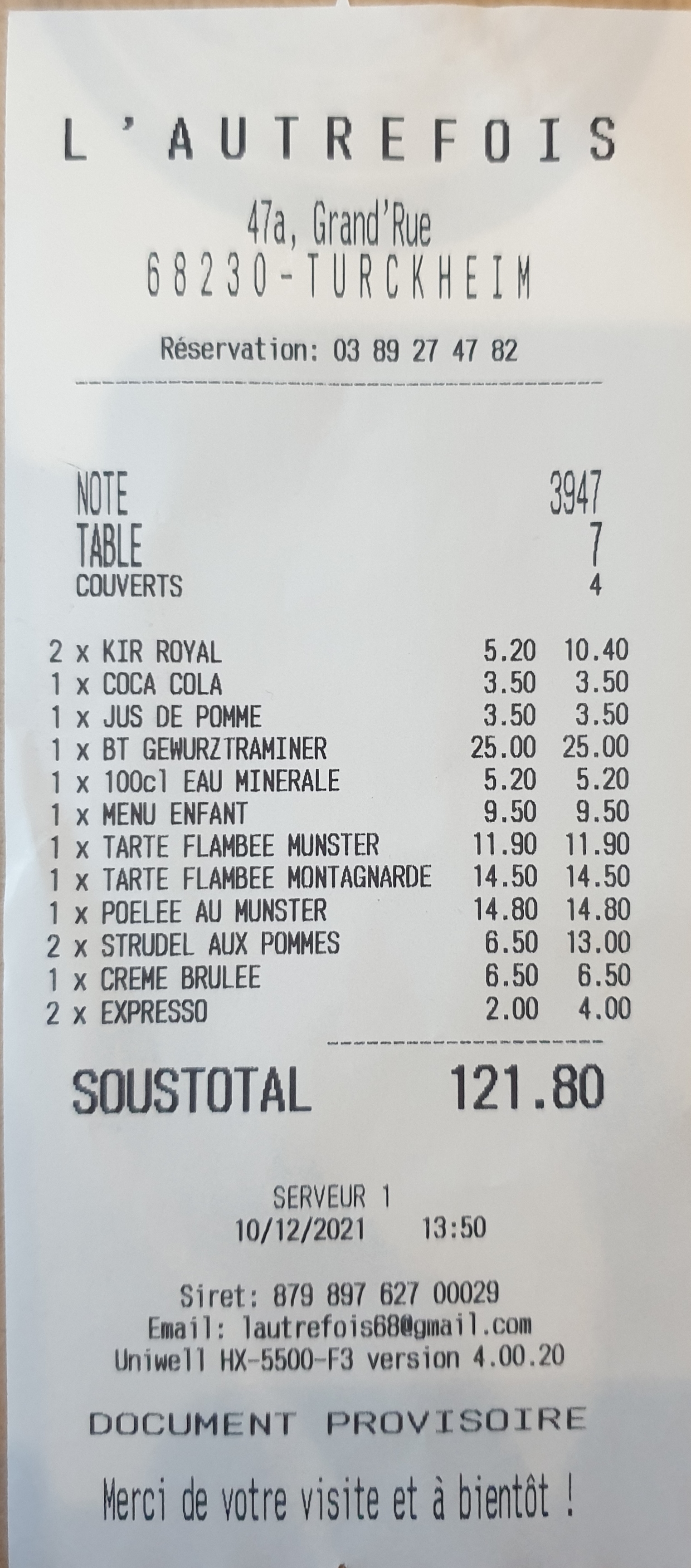 Si vous passez par Turckeim, une adresse , l Autrefois. Très bon restaurant, tout mignon où on mange de la cuisine d autrefois et où l accueil est fantastique. Si vous voulez passer un bon moment et allez-y! Josette et Marcel de Mons