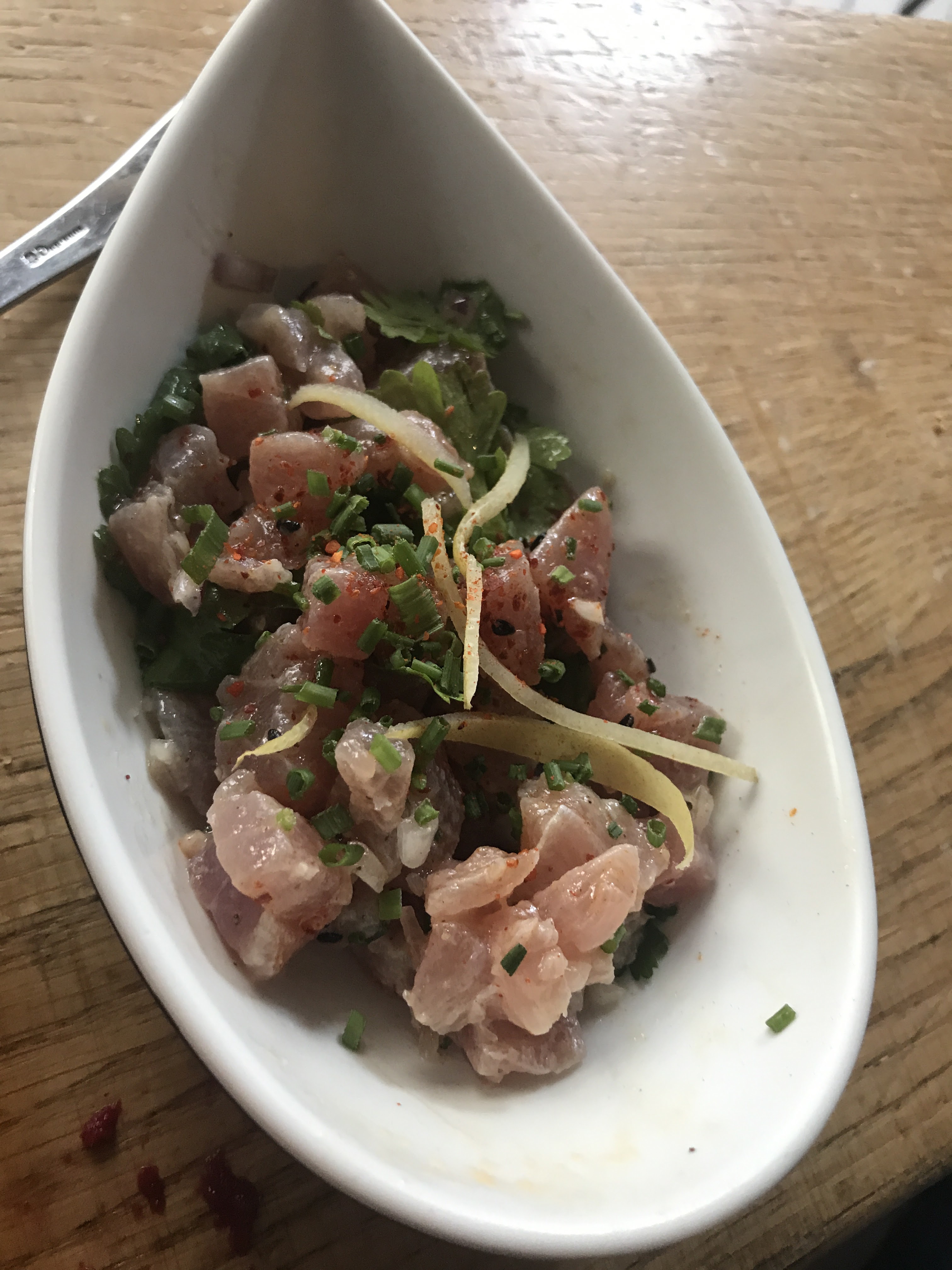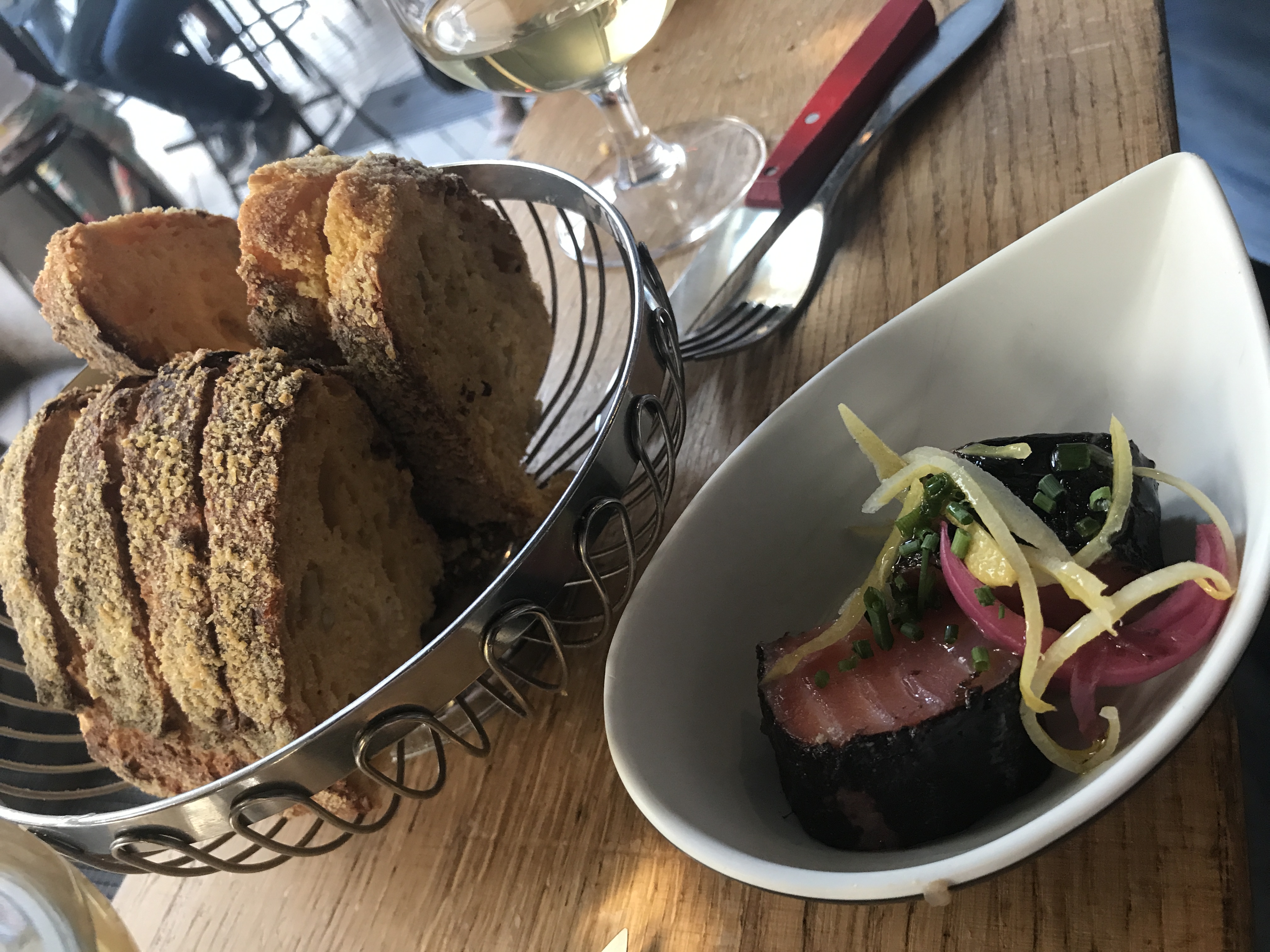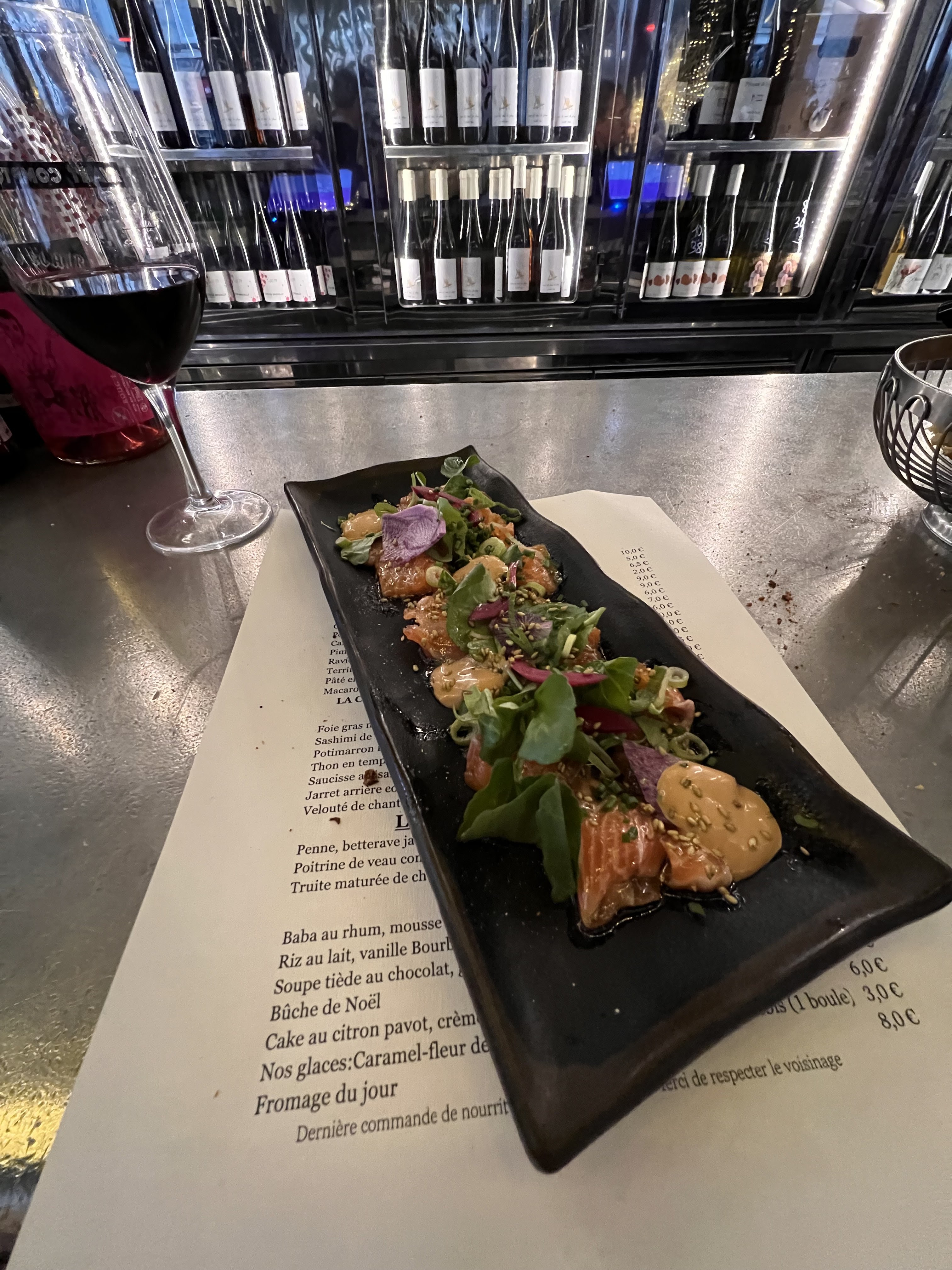Certaines de mes bouchées préférées à Paris étaient dans ce joli bar à vins — j'ai laissé le serveur commander pour moi et il m'a apporté un plat de sashimi, des croquettes et de la poitrine de porc. Le sashimi était mon préféré. Il m'a également servi deux verres d'un délicieux vin biodynamique appelé Cyprès de Toi.