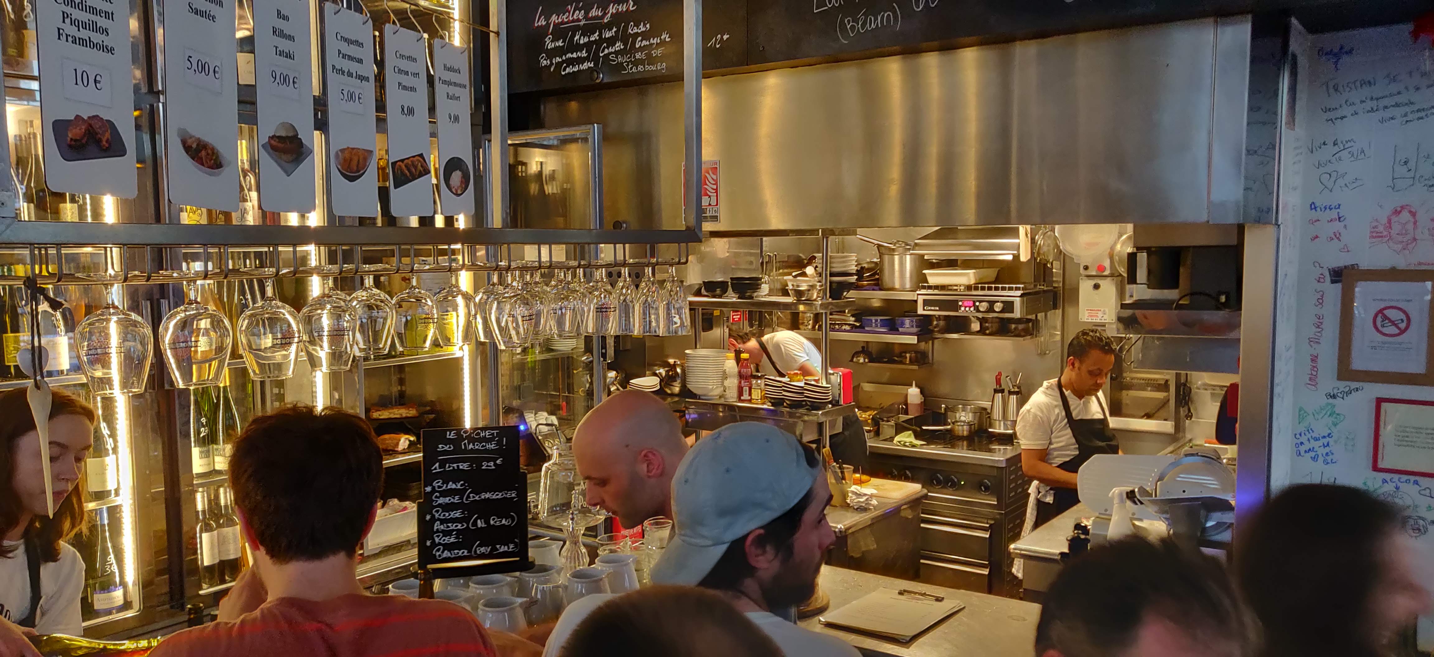 cuisine authentique, bons vins. J'ai essayé le sandwich au porc et la poitrine de porc, tous deux incroyables. C'est un peu cher, attendez-vous à dépenser entre 60 et 80 par couple, mais c'est un endroit et une expérience formidables à Paris.