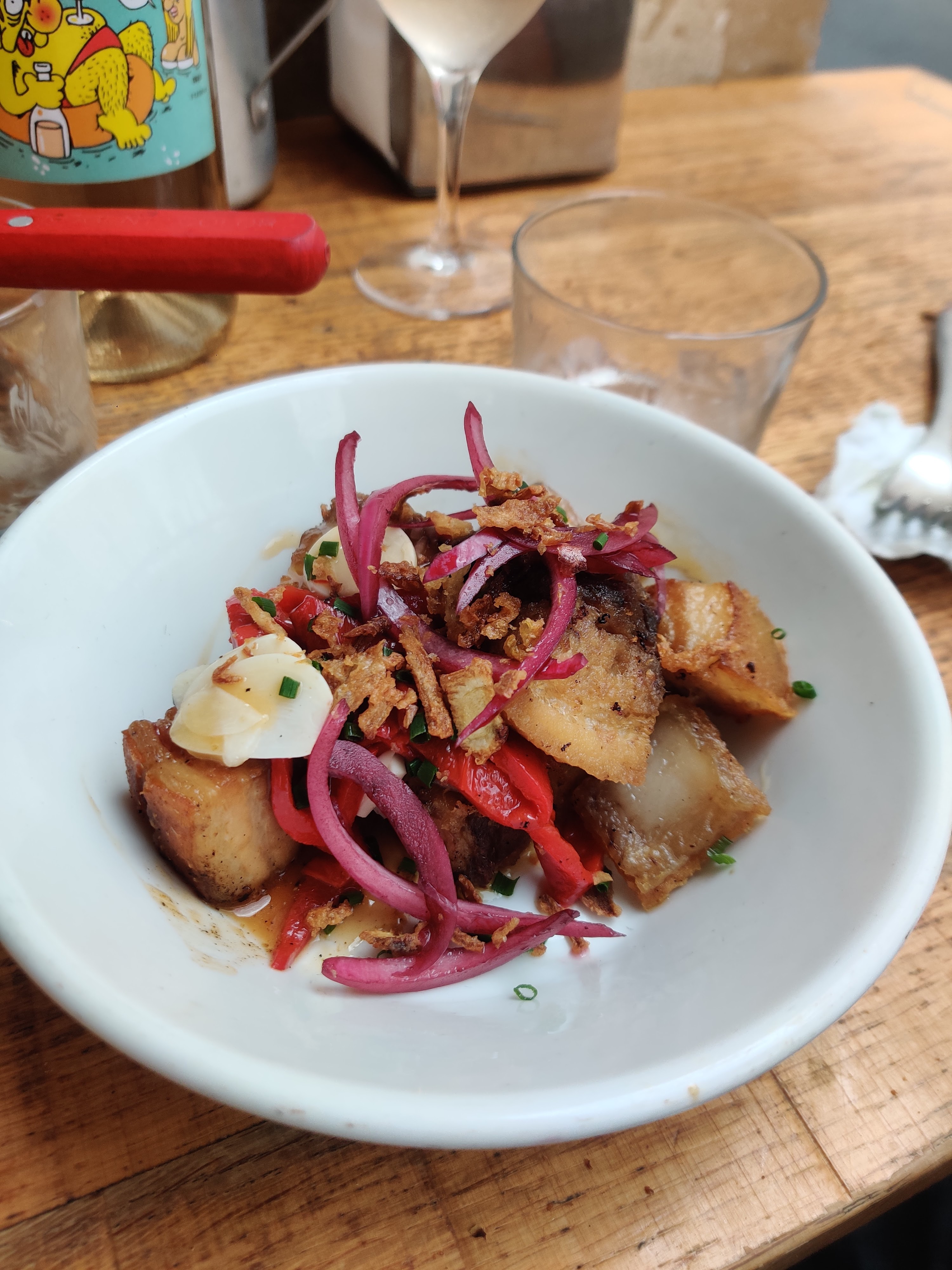 Avant j’aimais l’endroit. Je n’y avais pas mis les pieds depuis au moins 2 ans. Quel changement. Musique pourrie à fond la caisse. Étonnant de briser les oreilles avec des trucs à la JUL alors qu’on revendique des produits de qualité. Les serveurs( et serveuses) qui te parlent avec une folle élégance «allez dis tu veux quoi toi ». Les comptoirs jonchés d assiettes pas ramassées, de tâches de gras et de miettes de pain. Sans parler de l’augmentation des prix. Bien sûr les tapas sont sympas mais bon les verres riquiquis à minimum 10 euros… ça fait bcp tout ça.