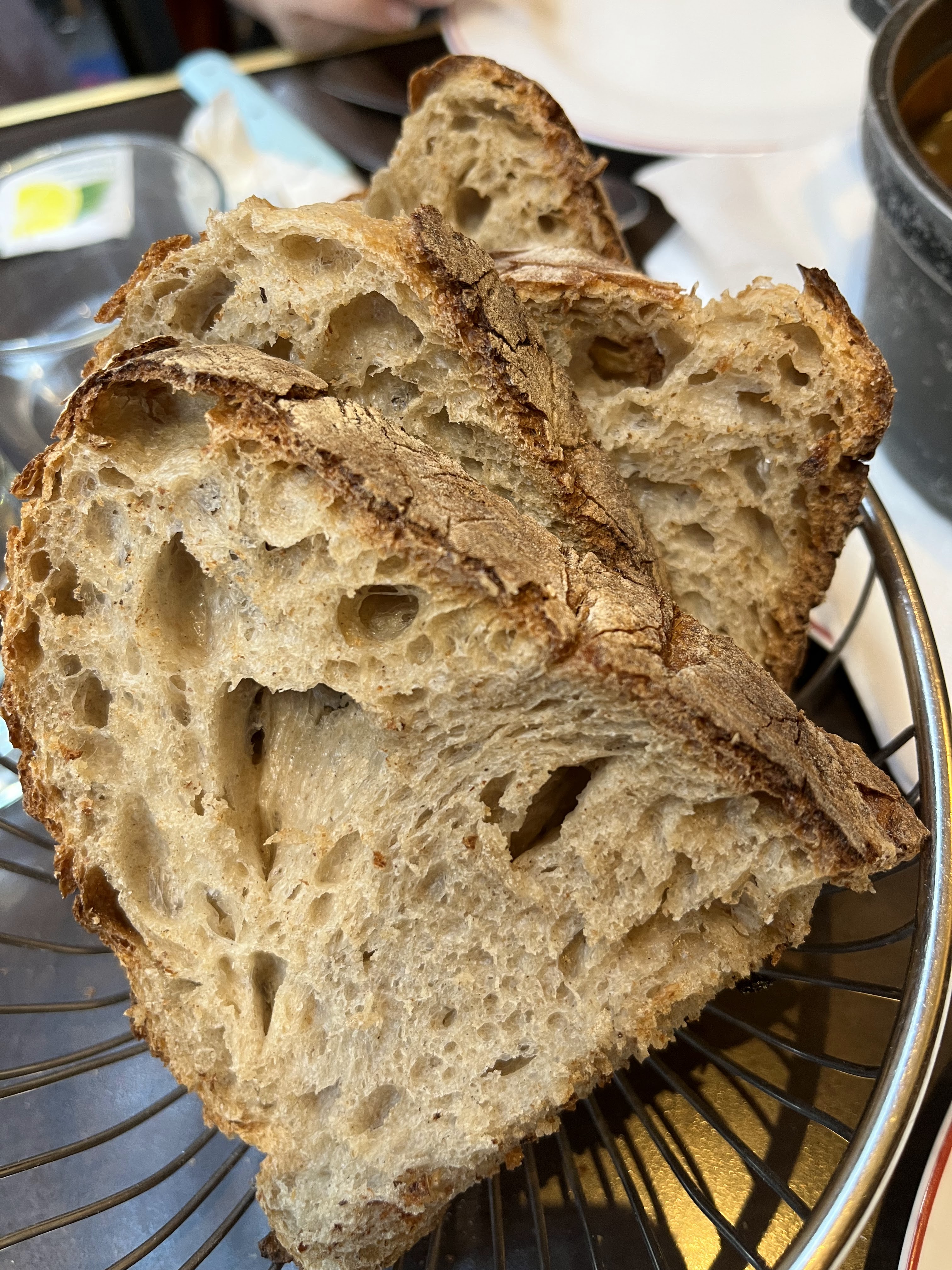 La nourriture était bonne mais je ne dirais pas que c'est incroyable. Pour la France, c'est assez standard. Et c'est cher pour ce que c'est. C'est beaucoup de charcuterie avec des fritures occasionnelles. La morue était bonne, très simple et savoureuse. Il n'y a pas d'option pour interrompre votre repas avec un peu de verdure fraîche. C'est citation grasse (je comprends que le chef est basque). La sélection de vins était bonne. Le pain était vraiment intéressant, c'était du pain de maïs je pense. Vous vous servez du beurre au comptoir à partir d'une énorme pile. C'est vraiment décontracté. La raison des 3 étoiles est que le service était à la fois excellent et horrible. La fille et le moustachu qui nous ont servi étaient vraiment gentils et aux petits soins. Ils nous ont remplis quand nous étions vides, ils étaient adorables. Mais l'un des serveurs masculins (celui auquel nous avons dû faire face malheureusement) ne semblait tout simplement pas s'en soucier du tout. Il était tellement nonchalant. Chaque fois que nous lui parlions, il avait l'air ennuyé et nous ignorait, oubliant certains ordres. Il semblait plus intéressé à passer du temps avec ses amis à l'autre table. Incroyable. Je suis français et ce genre d'attitude me gêne. C'est à cause de ces gens-là que notre service de restauration a une si mauvaise réputation. Sans cela, ce serait définitivement un 4 étoiles.