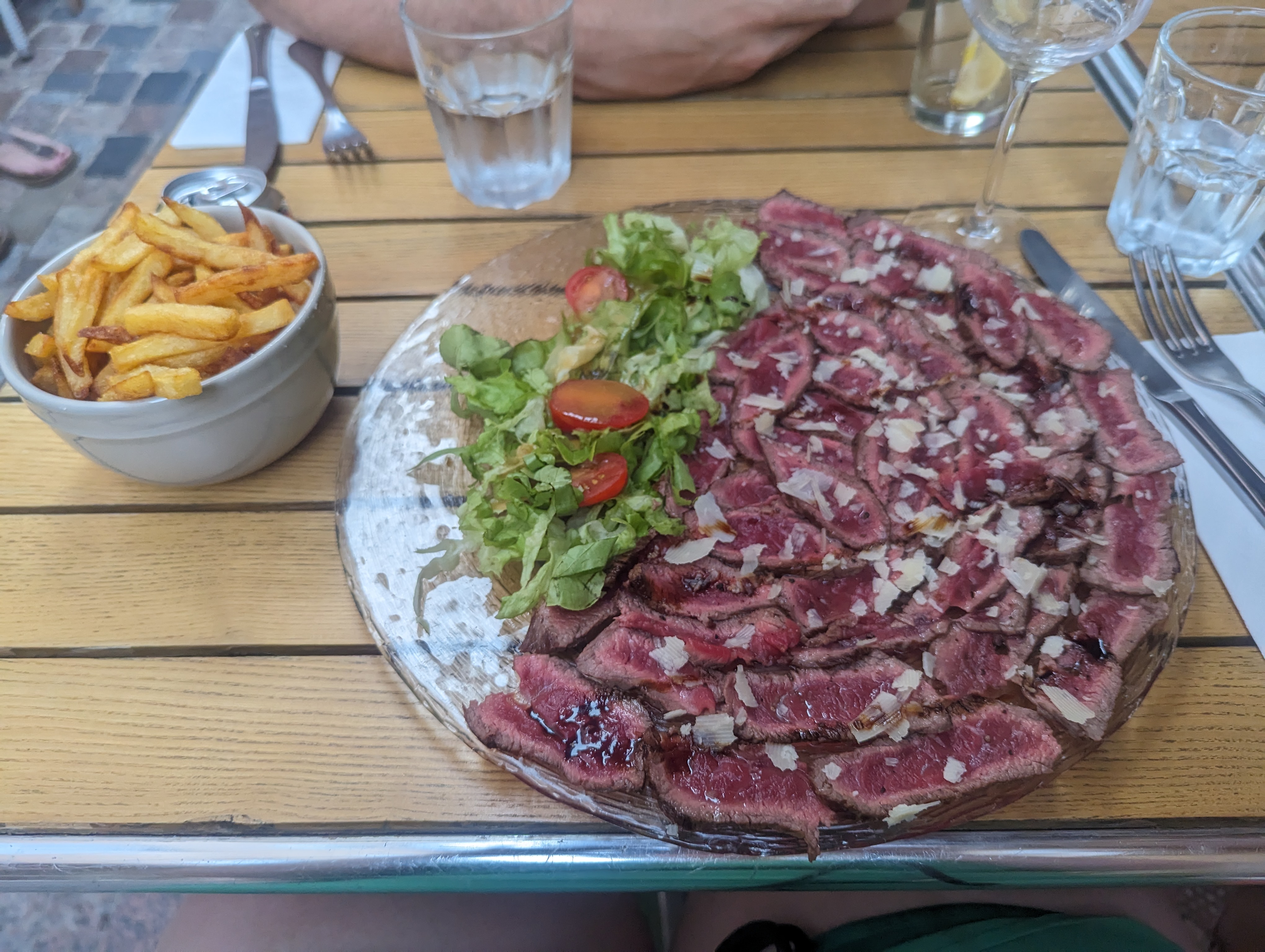 Petit restaurant dans une ruelle a l écart Une vrais pépite. La tagliata de boeuf a l huile de truffe est divine et parfaitement maîtrisée. Les frites maison sont excellentes. Le camembert rôti avec sa charcuterie très bon et le saucisson coupé fin comme on l aime. Le menu enfant nickel avec un vrais steak haché délicieux. Serveur très gentil qui explique bien la carte.