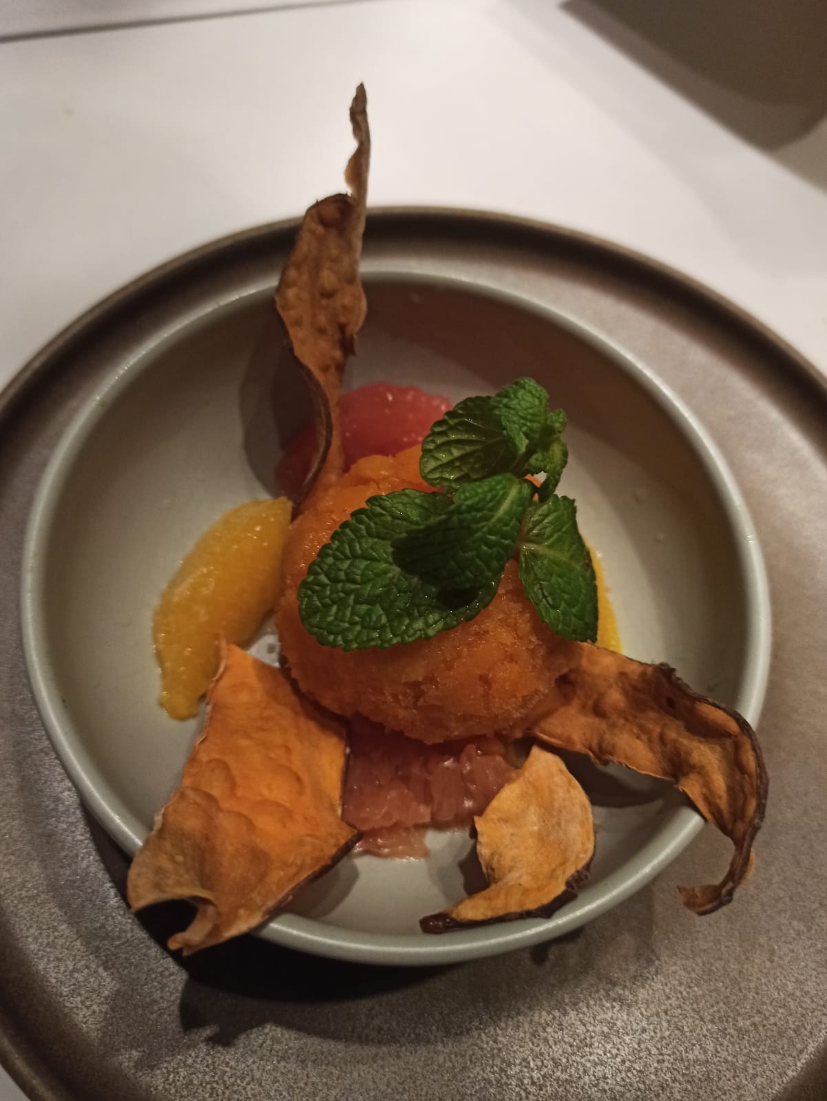 Très bien ! Prix abordables Sphère de chèvre/ tartare d'espadon ( un peu trop de poivron ) / brioche perdue caramel beurre salé