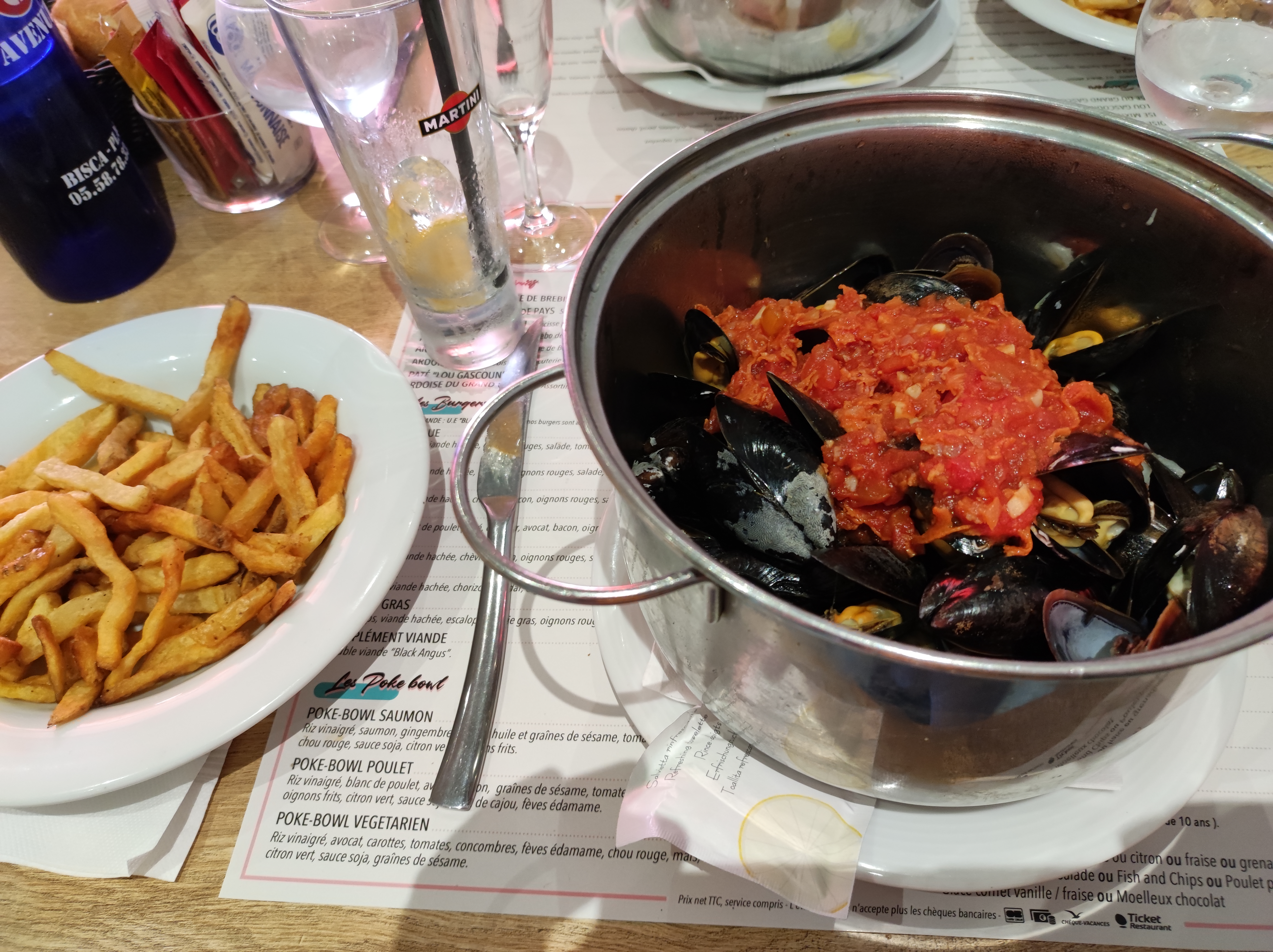 Accueil sympathique. Cela se gâte par la suite. Toilettes sales. Serveur non avenant et complètement désintéressé. Moules pas top. Frites molles. Rapport qualité prix du poke bowl très moyen. Très déçu par cette première impression de biscarosse.