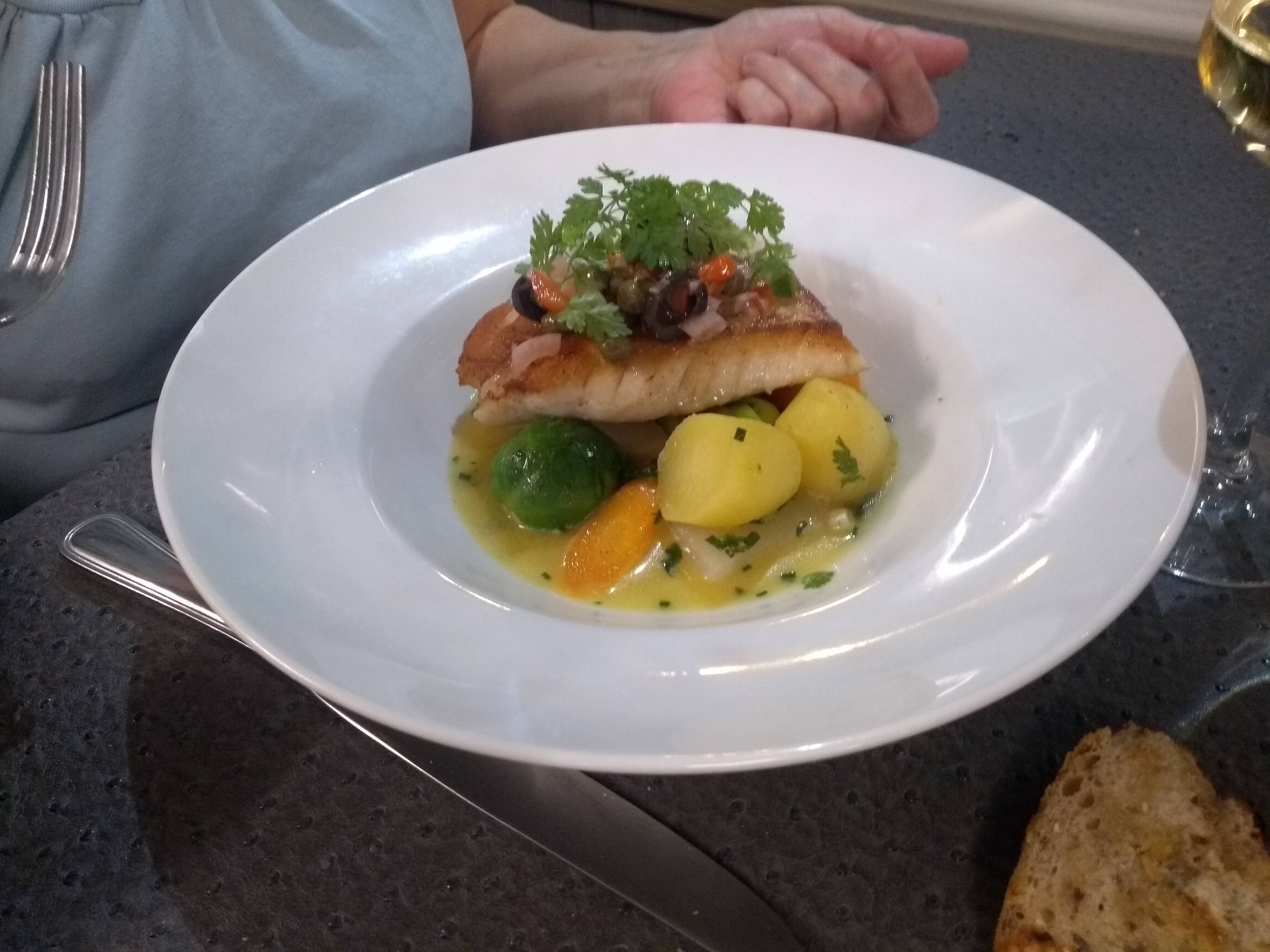 Ce soir là, j'ai pris un plat et un dessert.filet de bar sur un écrasé de pomme de terre accompagné d'une sauce chorizo et une tarte au citron. Le poisson etait parfaitement cuit. La tarte au citron était de belle facture.