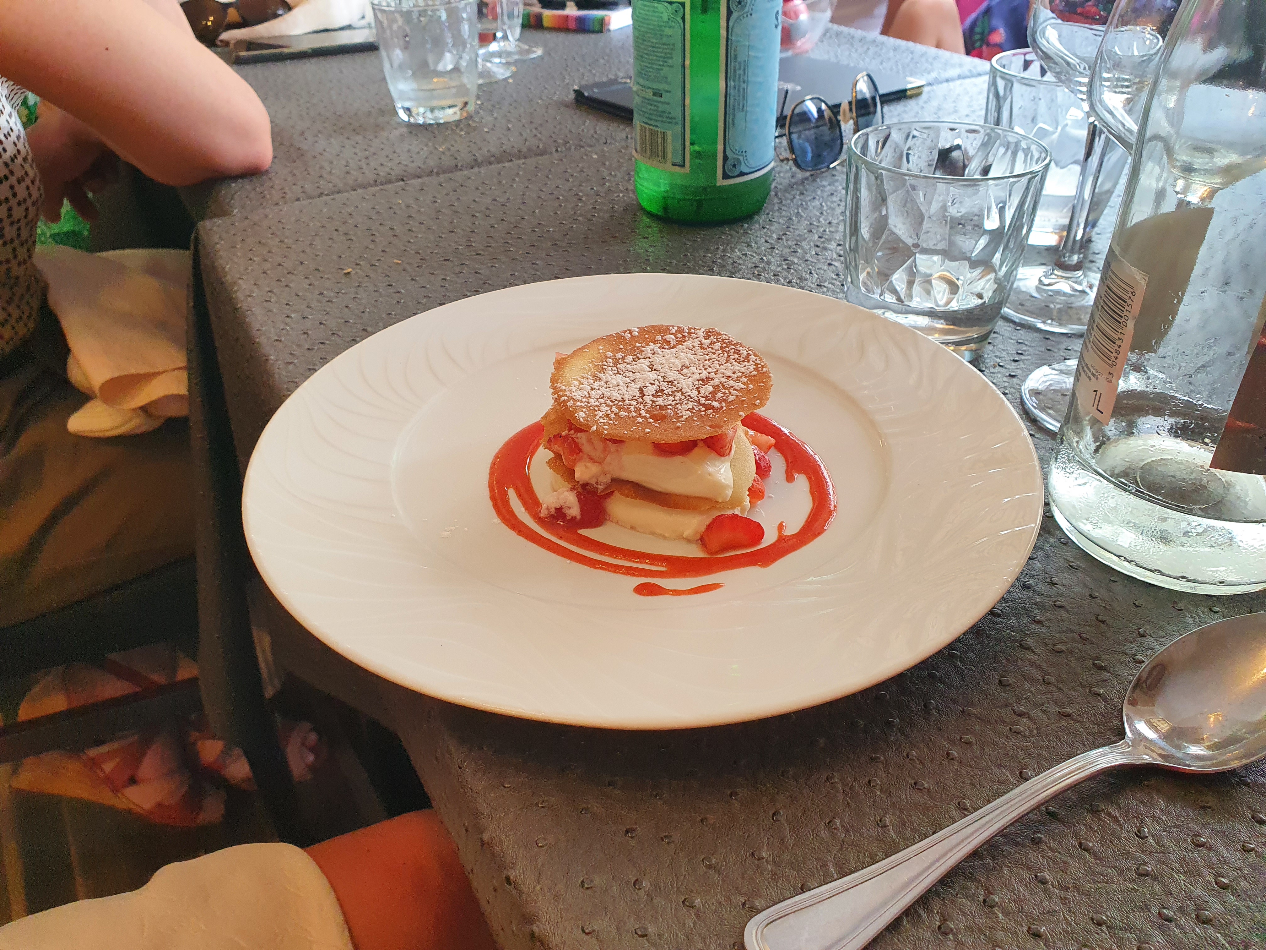 Pas le temps de déguster l'apéritif, l'entrée arrive!! Filet bar , la sauce crustacés n,apporte rien. Millefeuille aux fraises, très bon. Bonne cave. Marie