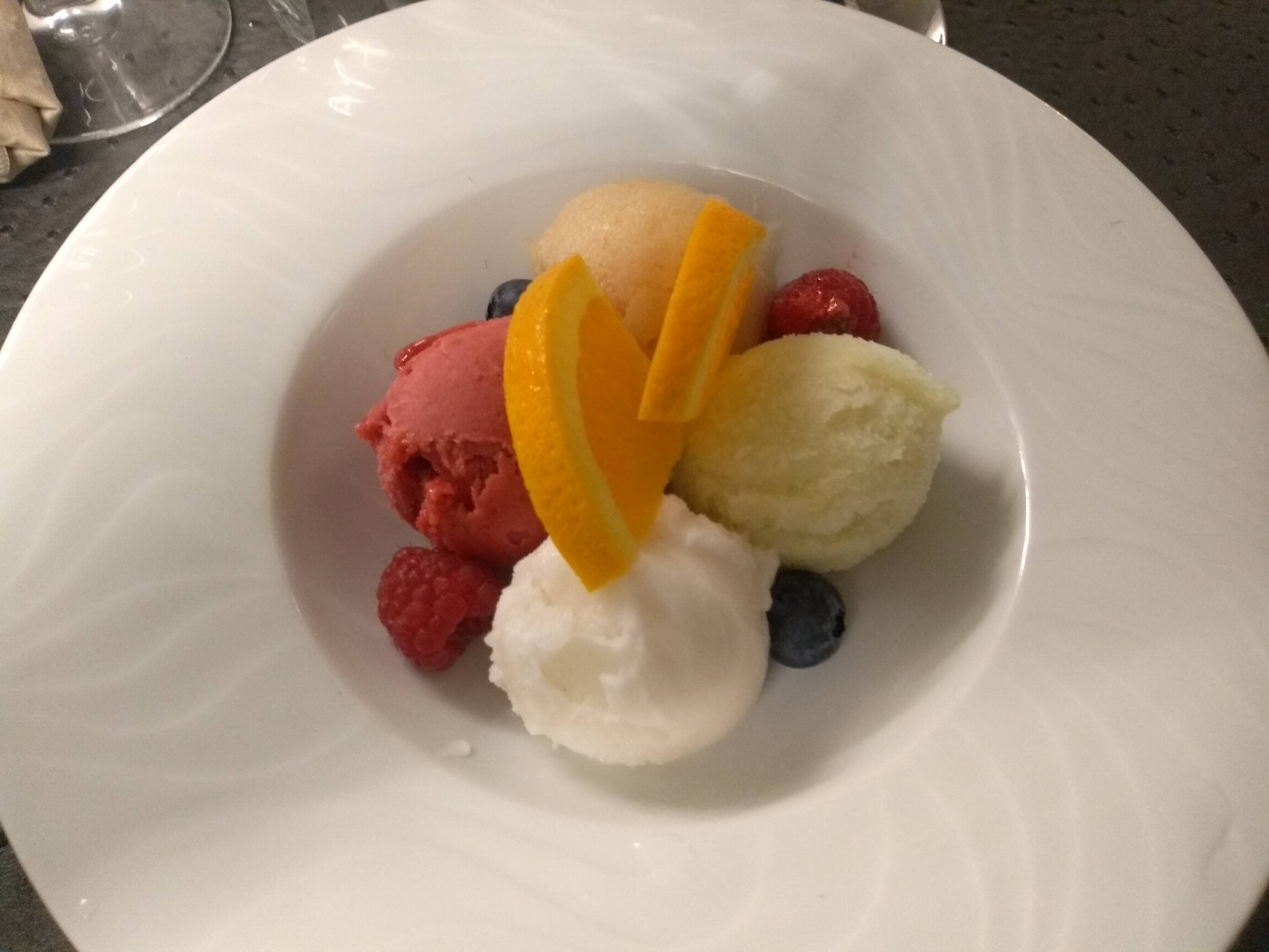 Entrée saumon frais pain de mis grillé filet d huile d'olive Plat suprême de pintade purée patate douce et petits légumes de saison Dessert Glace vanille Bourbon coulit passion biscuit tendre au milieu et fruits frais La facture Bien raisonnable on peut se faire plaisir A faire absolument il vaut le déplacement, personnel agréable très attentionné