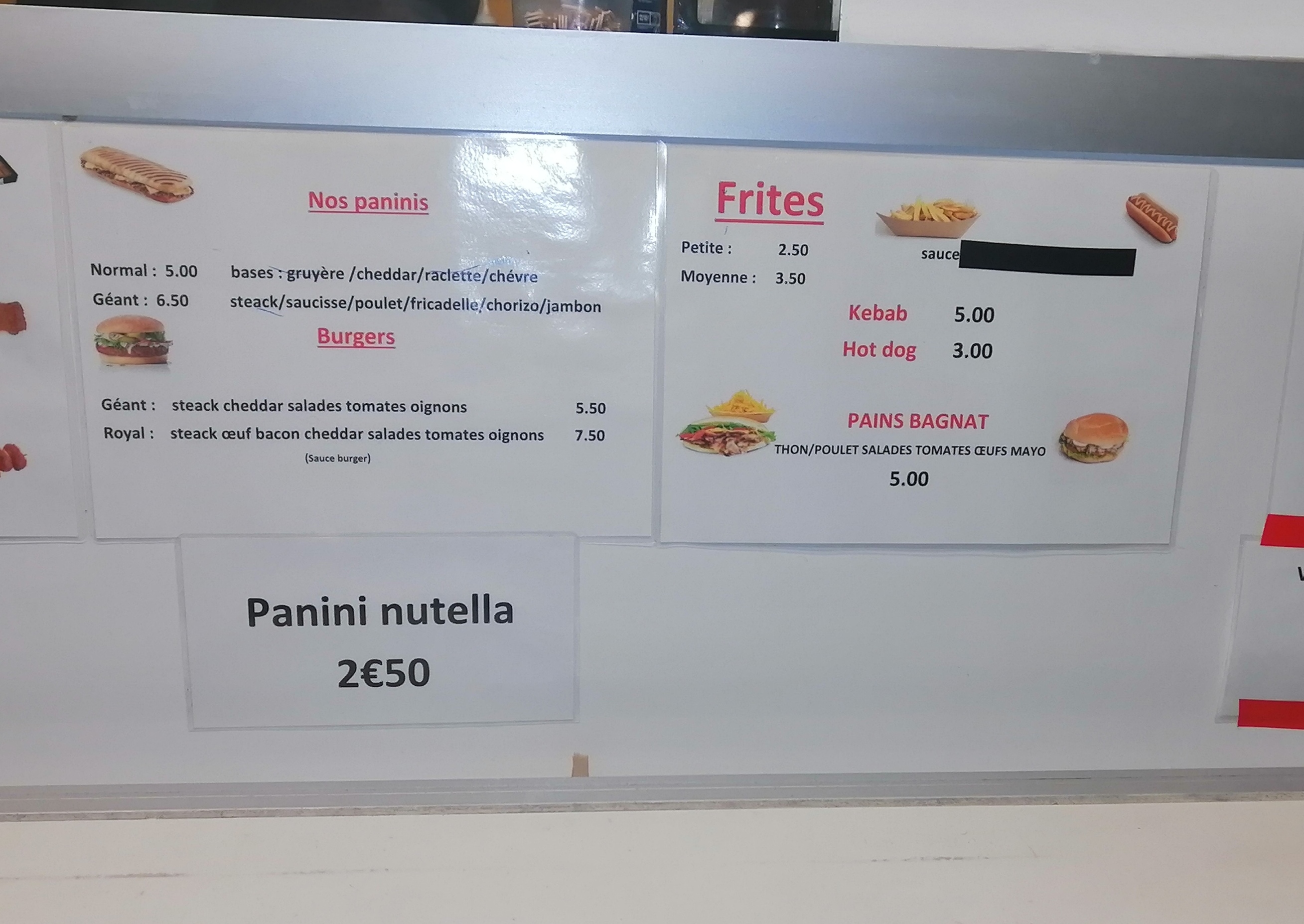 Je n ai pas aimé les frites et l ambiance. Placé devant le collège et école Saint paul, pauvres enfants... Grosse trace de graisse sur le sol... Pas de masque ni de gant entre faire un sandwich et rendre la monnaie... A éviter
