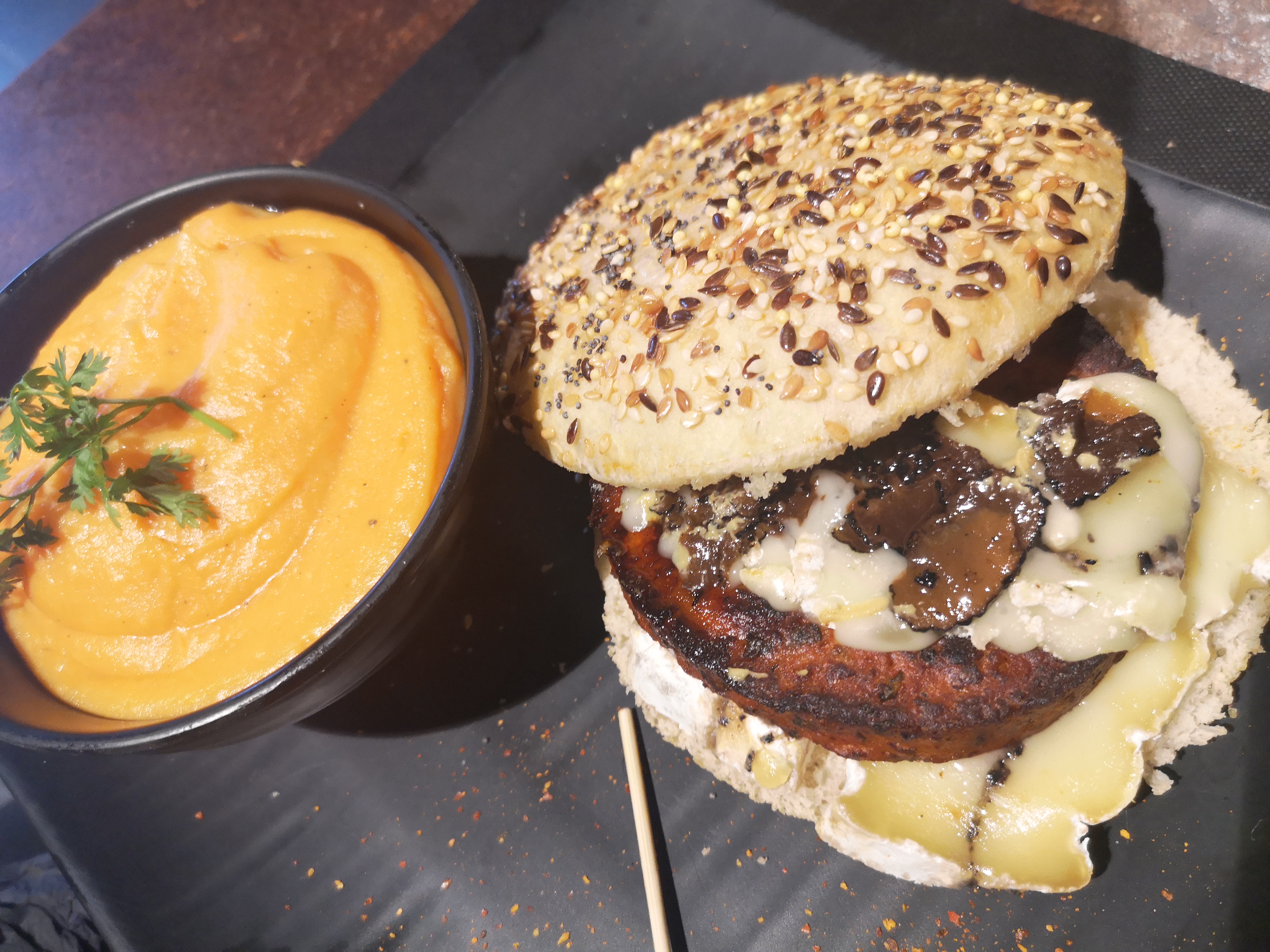 [Des burgers et plats commandés sur le site internet, dont 1 burger avec un steak veggie pour moi... Grande déception: j'ai découvert, au moment de la dégustation, que j'ai eu droit à un steak haché ! J'ai contacté la boutique au moment de la découverte: la dame s'est excusée, et compte tenue de l'heure de fermeture, elle s'est engagée à me dédommager avec un burger offert sur la prochaine commande. Dommage pour cette première prestation commandée, car l'ensemble est de qualité. Je rehausse la note lorsque j'aurai goûté le burger végétarien offert.] MAJ: j'ai bien eu droit à mon burger végétarien offert: TRÈS BON! Et en dehors de ce plat, tout est de qualité, aussi bien au niveau des pâtisseries (Chenille passion, ou chou à la crème) que des viennoiseries (et les muffins).