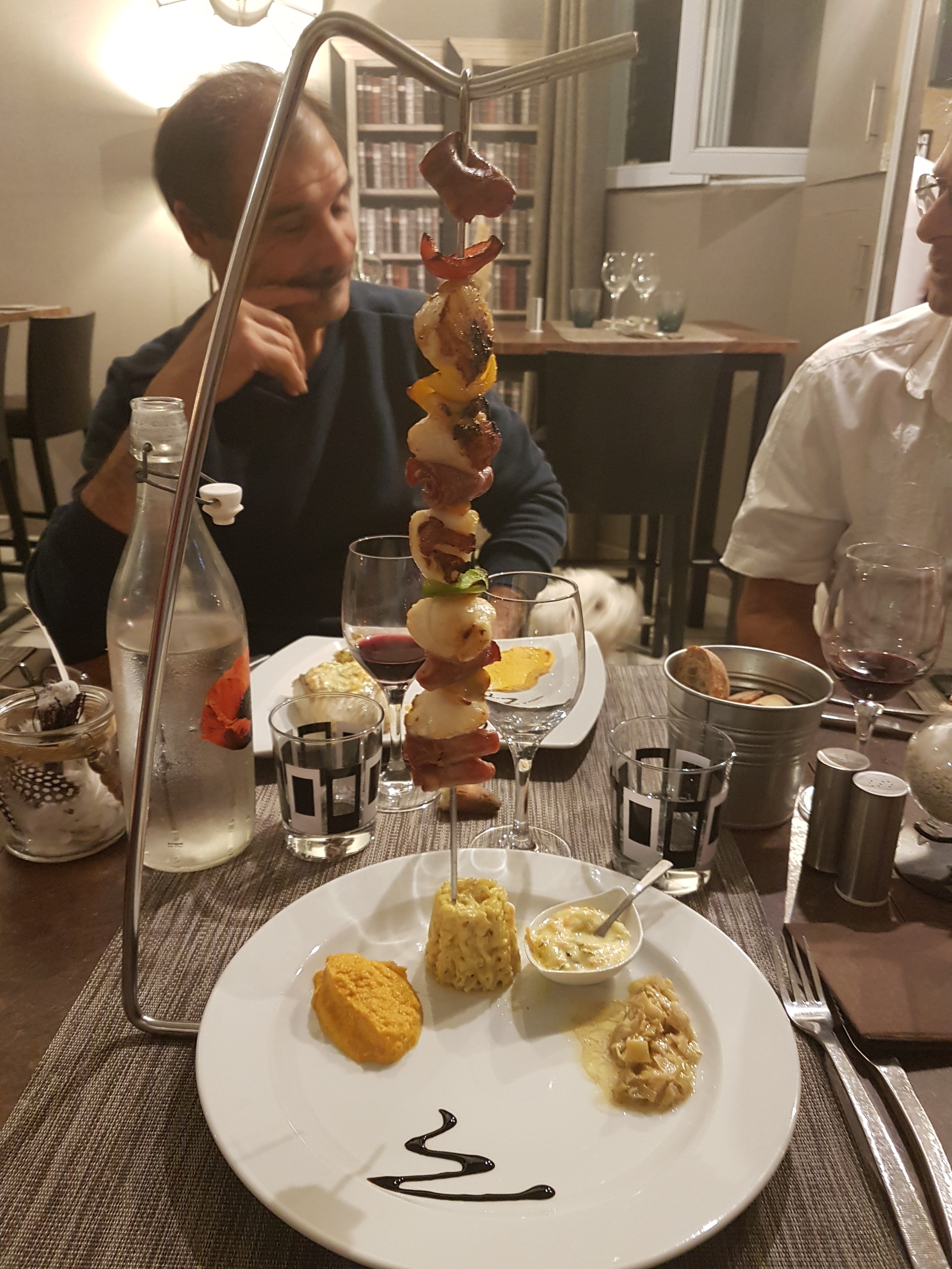 Premier jour pour tester la nouvelle carte. Déjeuner à deux : la brochette de St Jacques et le foie de veau...comme d'habitude et comme à chaque fois très comblée et un régal. Merci et à très vite pour satisfaire mes papilles.