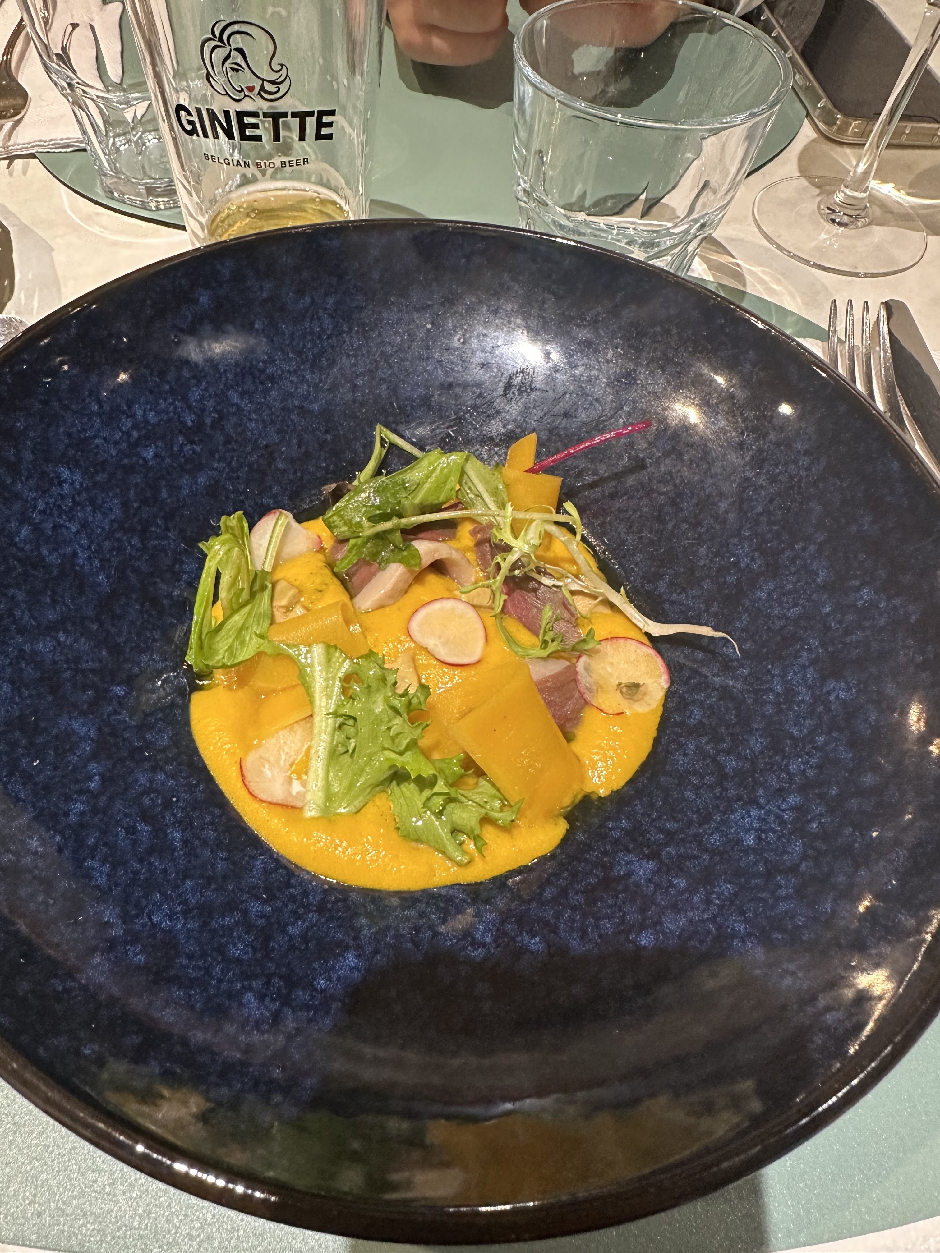 Une évaluation compliquée. Une jolie salle aux belles peintures. Un service agréable. Pour le gaspacho trop de présence de l ail, affaire de goût me direz vous ? Ensuite le tataki de boeuf, une jolie présentation avec de la recherche, mais il m a manqué un twist pour booster ce tataki, tout était bon mais ensemble il me manquait cela. Pour la côte de cochon aux racines, une très belle assiette où tout était bon individuellement et où là encore il m a manqué un liant entre la viande et les légumes. Mon épouse a eu la même appréciation pour sa lotte bardée. Par contre j' ai aimé le dessert autour du café, la glace amenant juste ce que il faut de sucre et de goût à la crème légère au café sur laquelle était déposés de fin copeaux de betterave. Donc un bon moment de passé mais une très légère déception mais là encore tout est affaire d appréciation personnelle.