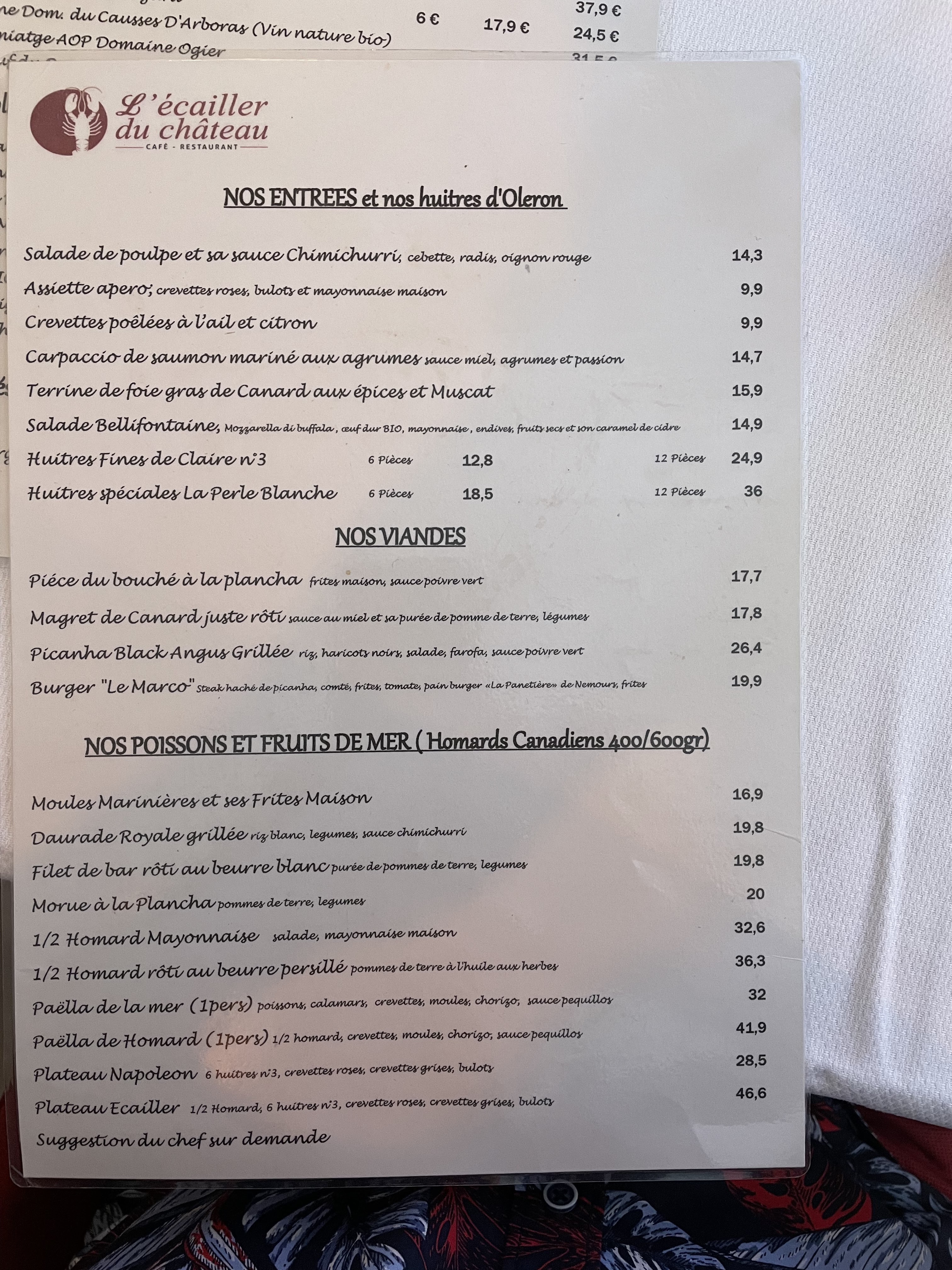 Déjeuner ce midi en couple Établissement très bien situé en face du château Pour ma part Entrée une douzaine d’huîtres fraîches et goûteuses Morue sur lit de légumes excellent plat Désert soufflé à la vanille très bien Choix de plat très appétissant Seul petit reproche le personnel un serveur très très mou et une serveuse se refaisant sa queue de cheval devant une glace du restaurant entre les tables pas très pro. Néanmoins je recommande cet établissement et nous ne manquerons pas de passer encore un bon moment