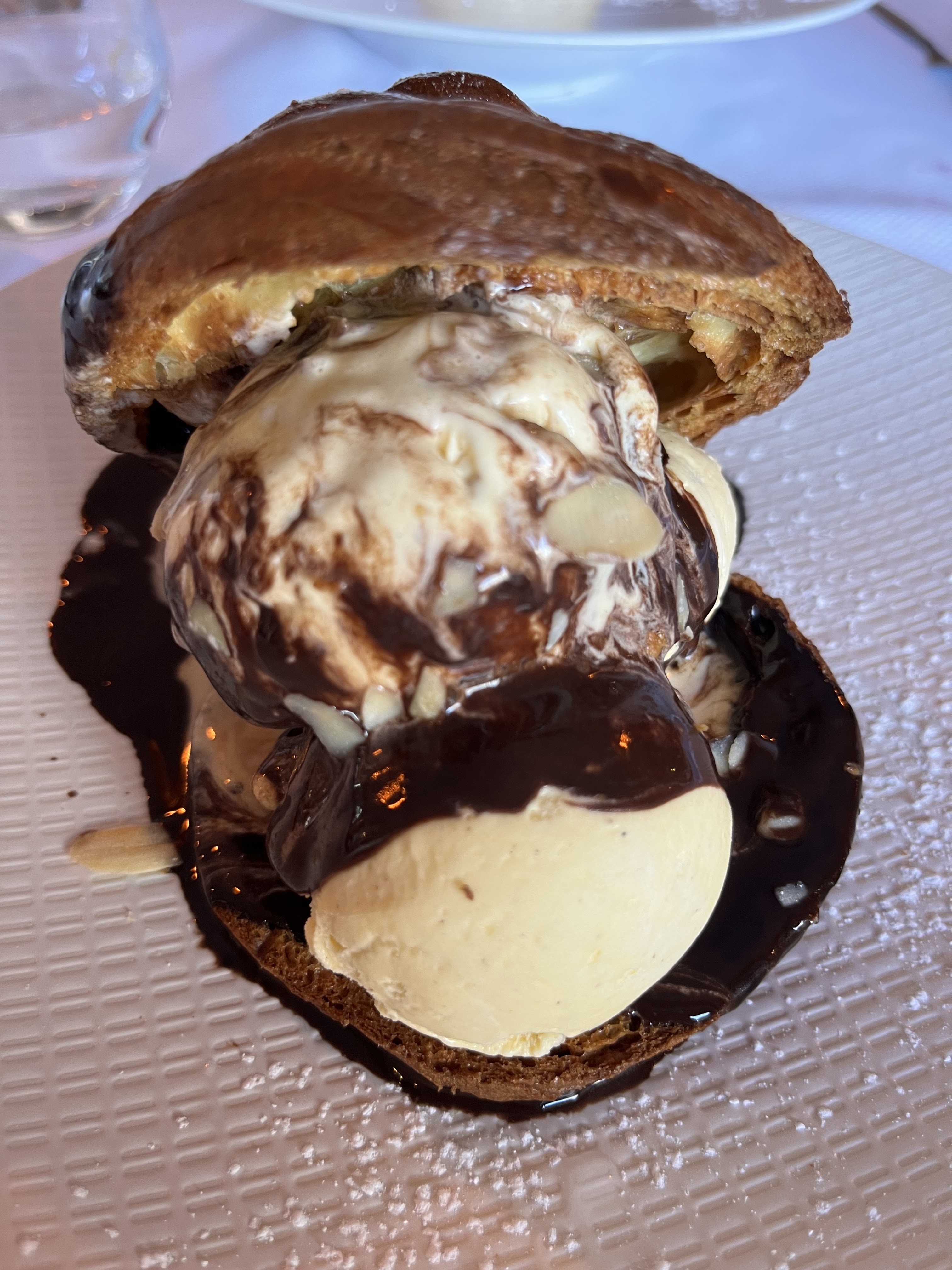 Accueil sympathique Paella homard 18/20 Profiterole 16/20 très bon chou, glace Tb, du chocolat chaud tablette fondu aurait permis le 20/20 Une table sympa devant le château