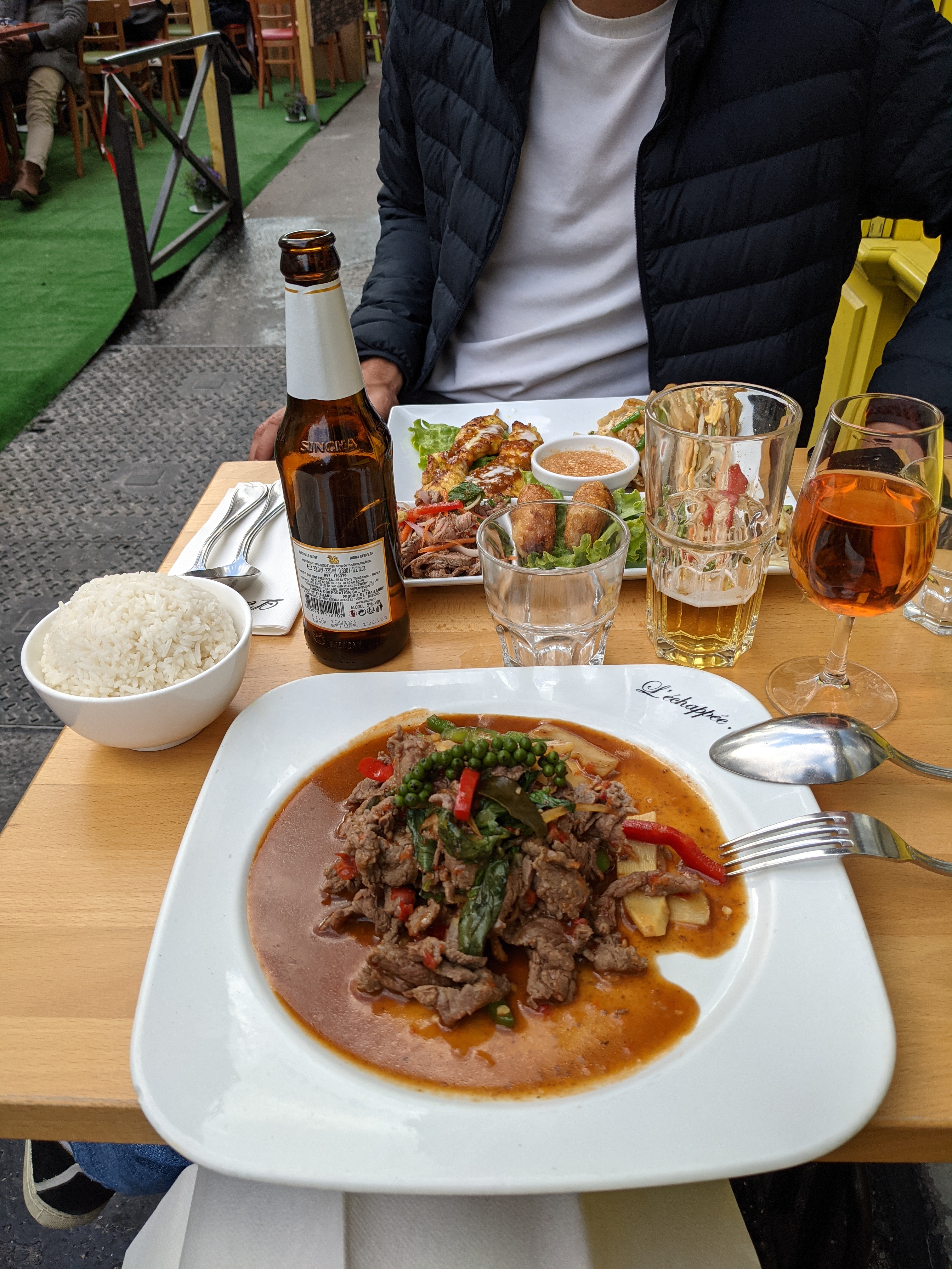 Nous avons tous les deux eu un déjeuner vraiment agréable ici et nous le recommandons vivement. J'avais du curry vert avec du poulet et du lait de coco, P avait du curry rouge avec un filet de saumon entier. Les deux étaient délicieux, l'ambiance était détendue et le personnel était sympathique et attentionné, ce qui a rendu cette expérience très agréable. Merci!