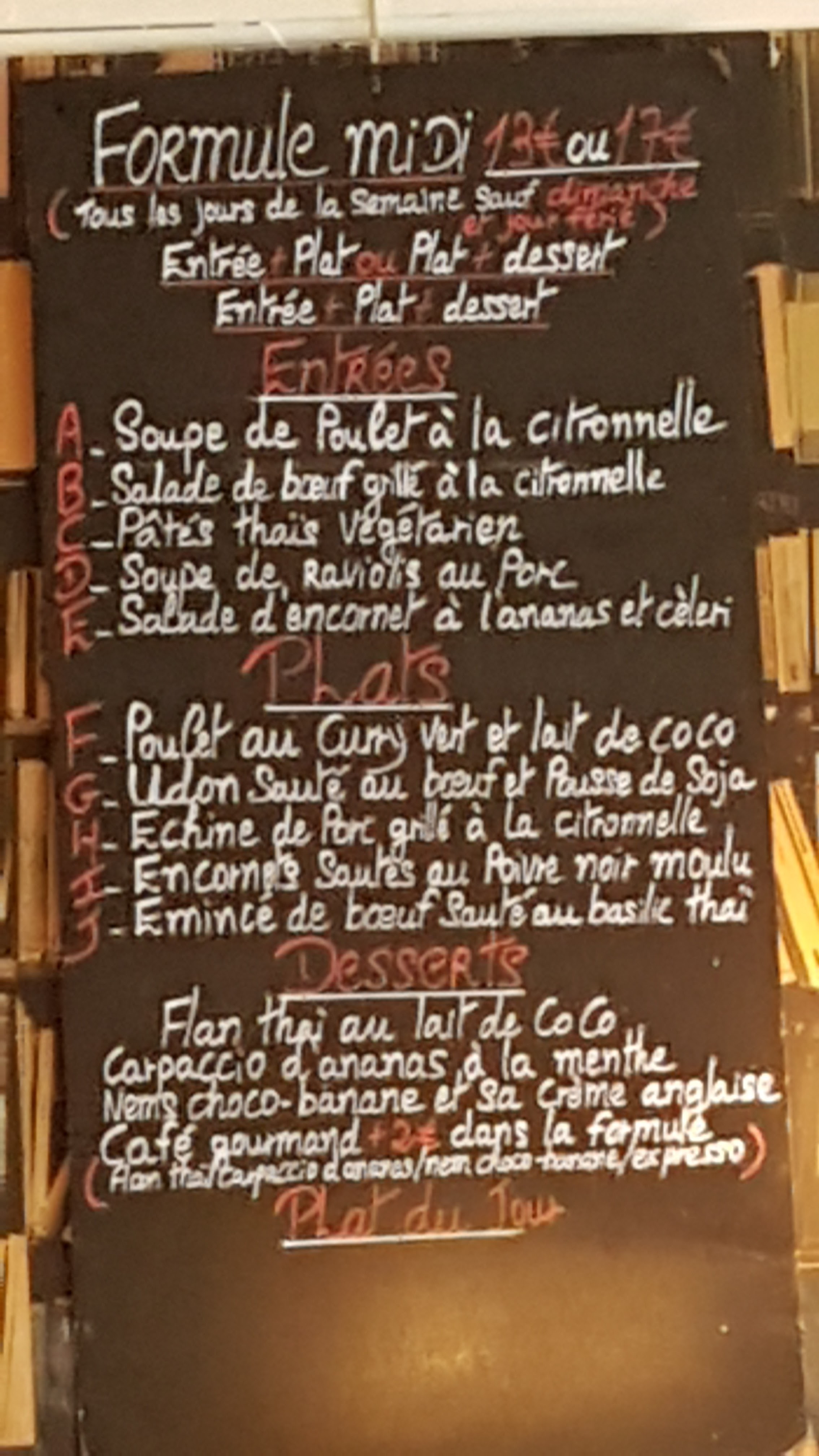 Service un peu long. Plat pad thaï crevettes, un plat de pâtes de riz 5 crevettes 13.5€ Bon le rapport qualité prix n y est pas. Manque un peu de convialité. Faites vous les -10% sur les repas à emporter ? Formule le midi entrée plat dessert 19€.