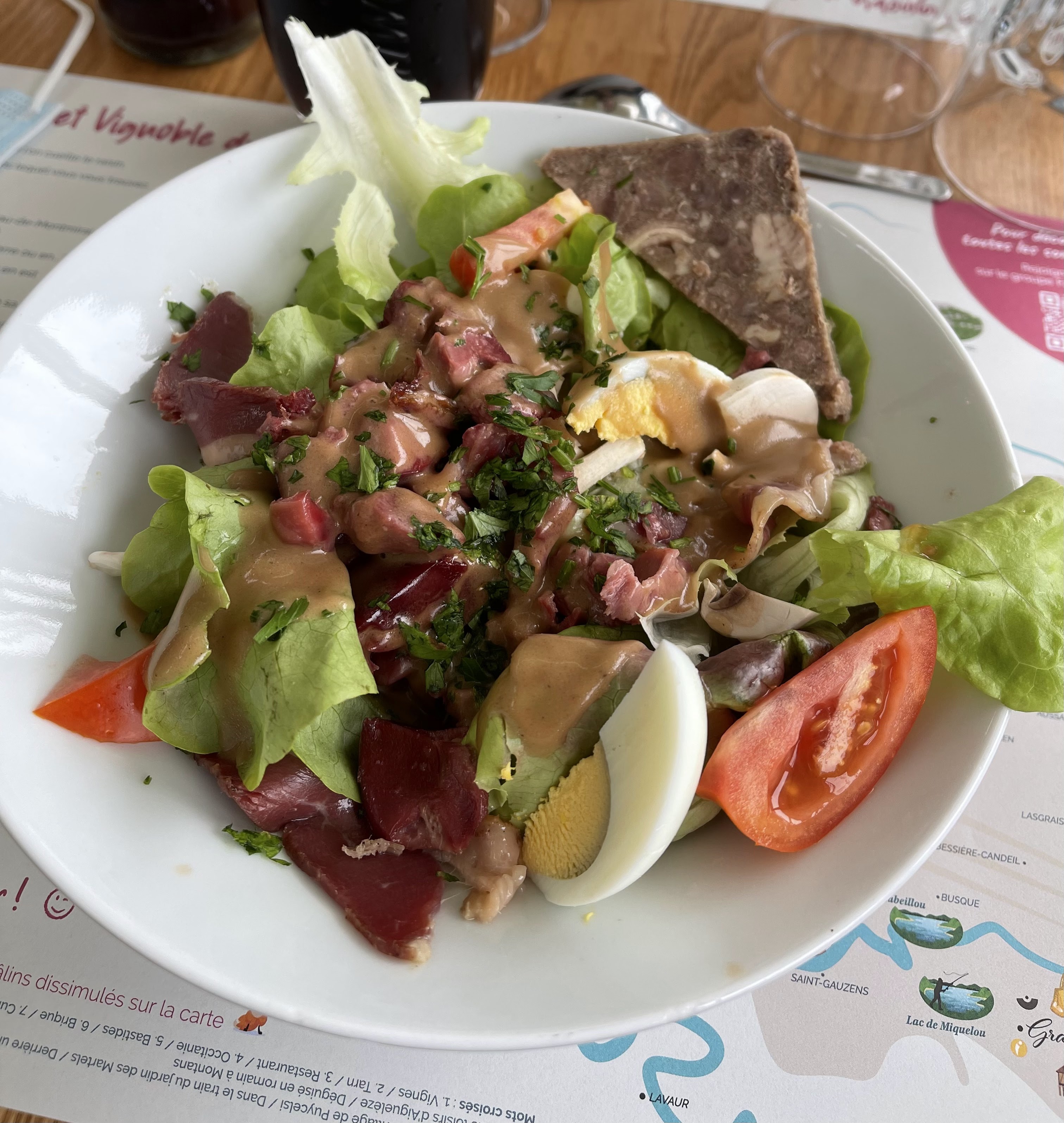 Excellente table, convivialité et qualité de l’accueil, du service aux petits oignons… Des entrées variées, du cassoulet à la hauteur de la réputation de la région, aux desserts, tarte au citron ou tatin, tout était délice ! Et pour ne rien gâter, une vue magnifique sur la vallée de l’Agout.