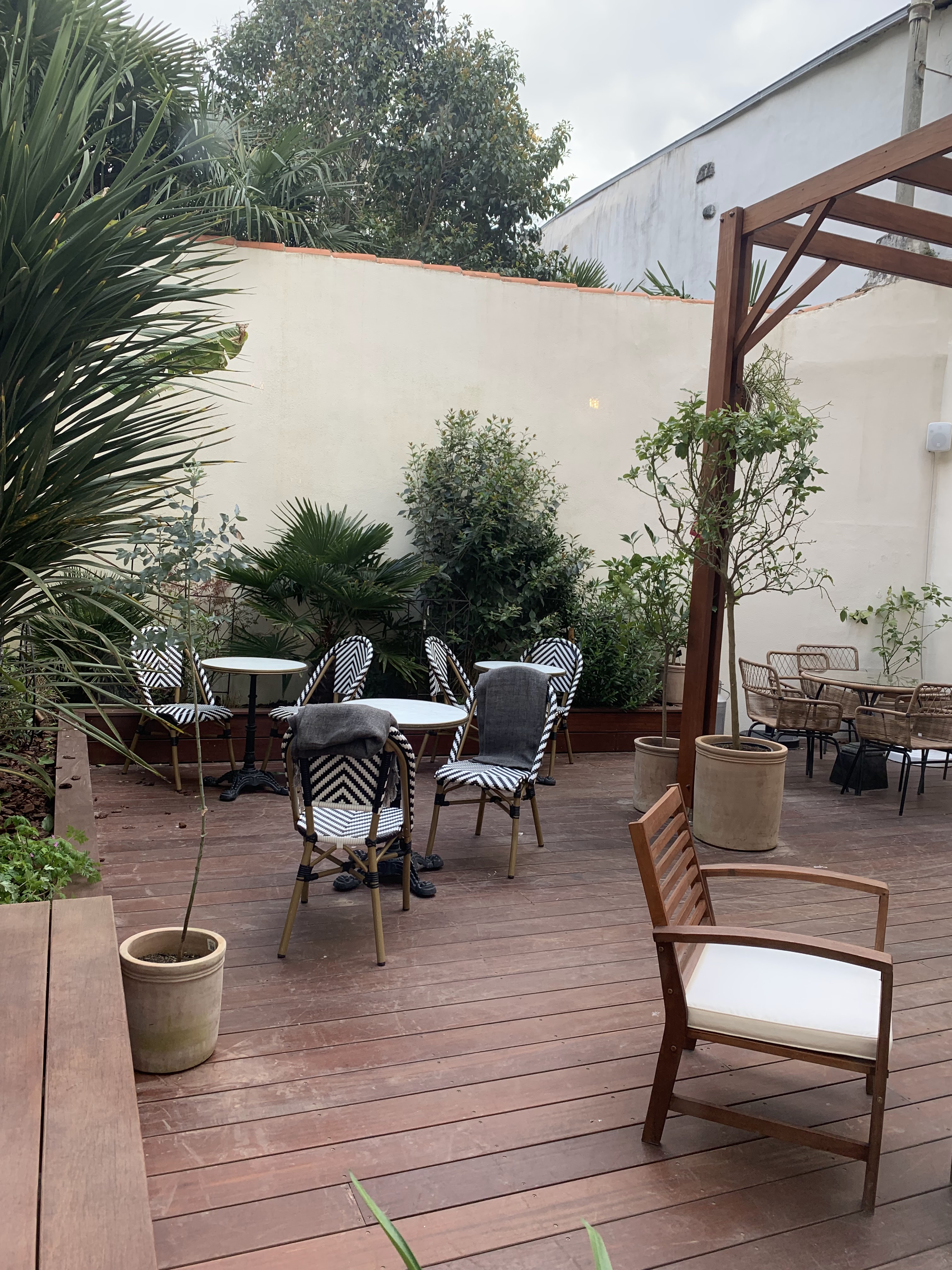 Petite patio a l'arrière au top ! La cuisine est légère et fraiche. Spot stylé ! Le café est excellent.