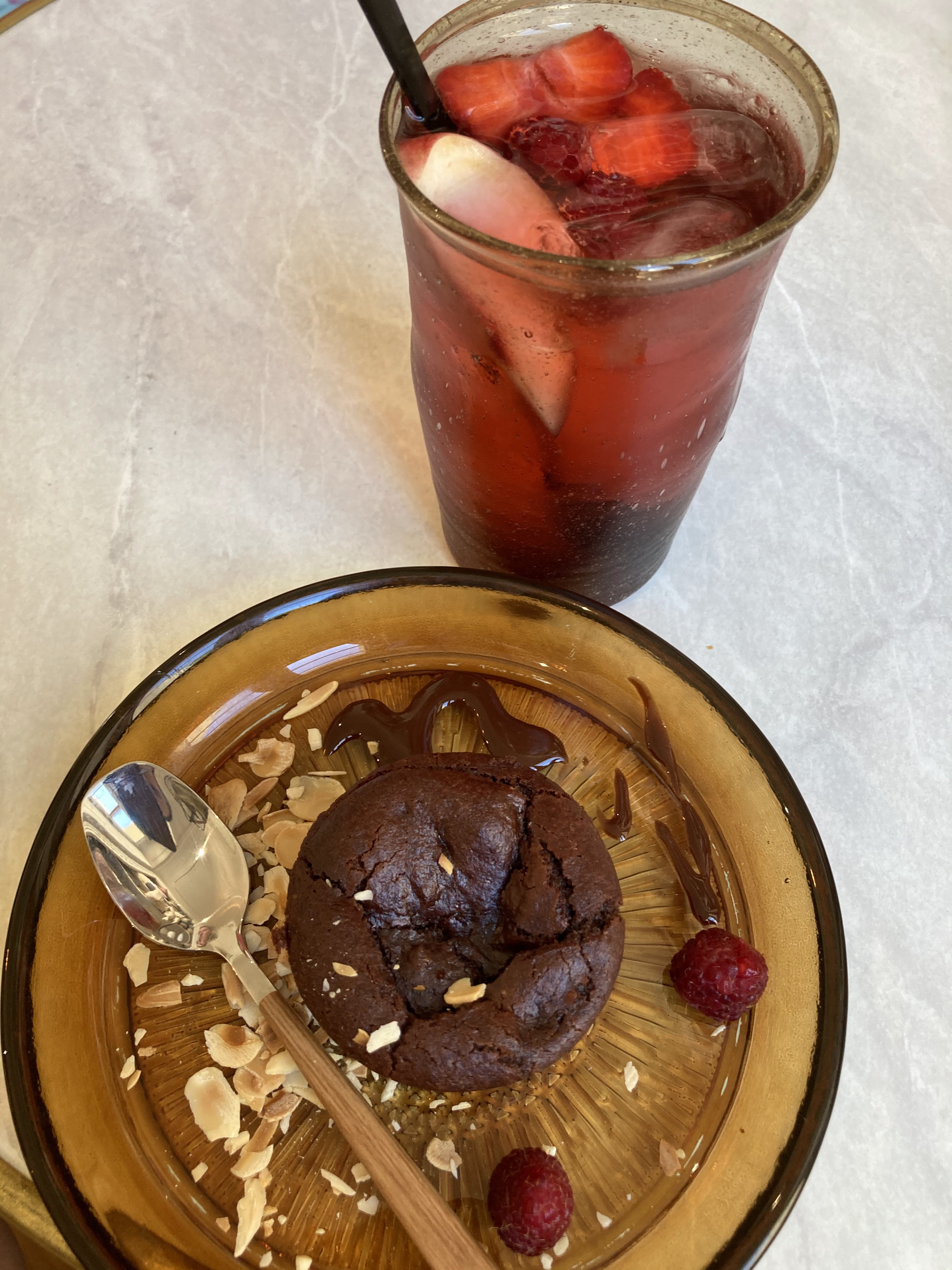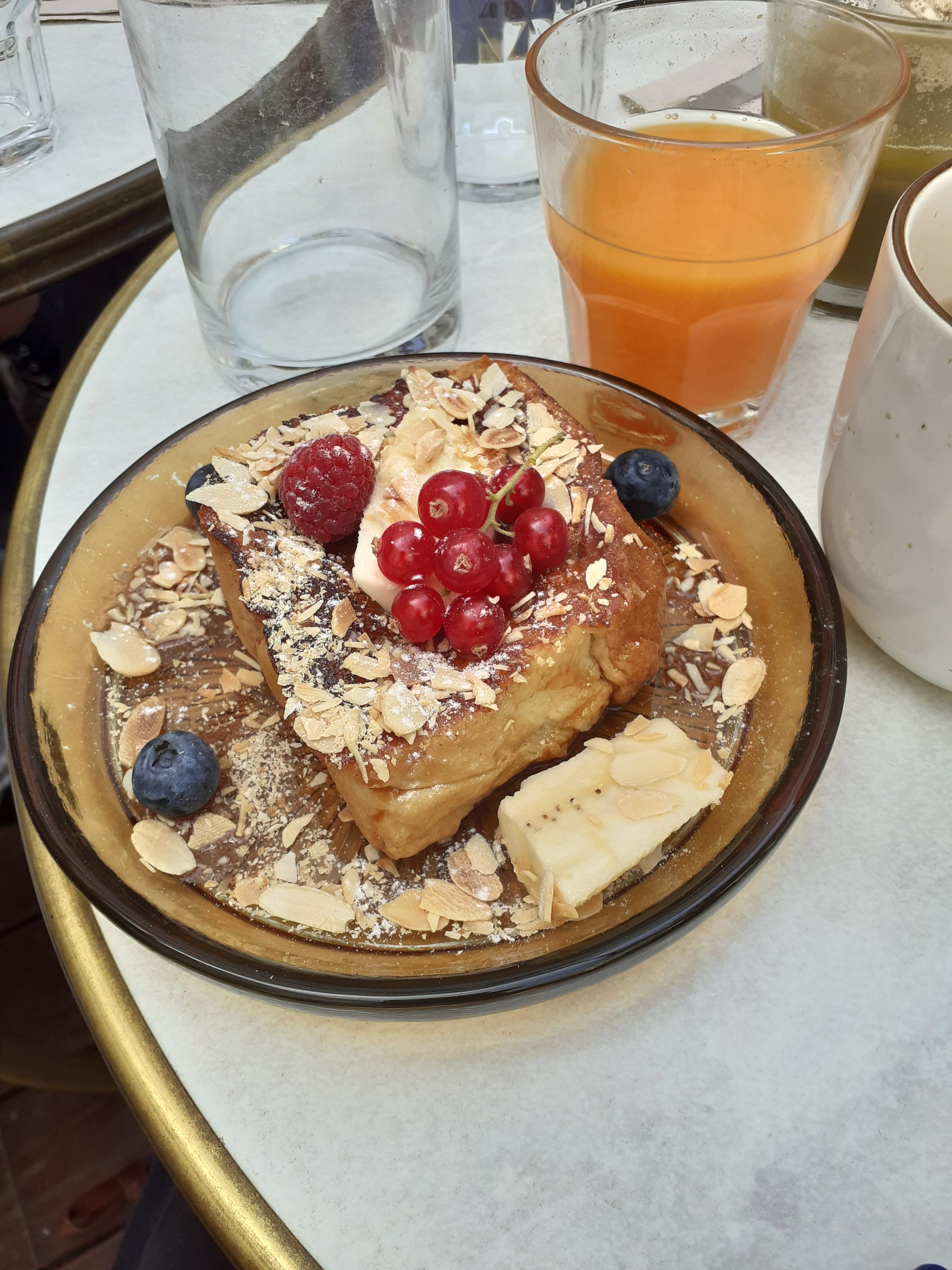 Pause goûter dans un charmant patio ombragé. La brioche façon pain perdue au caramel beurre salé, accompagnée de fruits frais est une tuerie. Les jus de fruits frais sont originaux et très agréables.