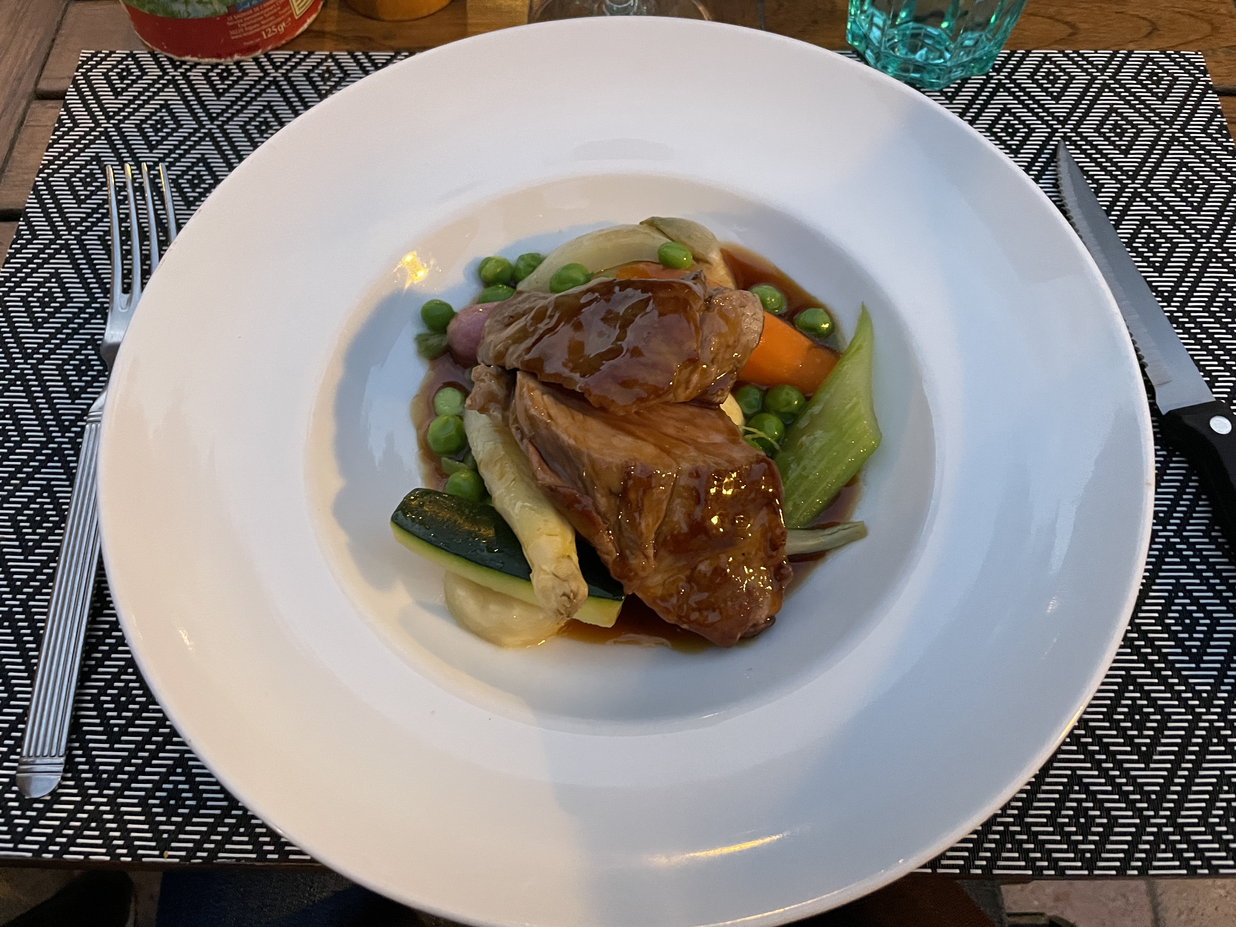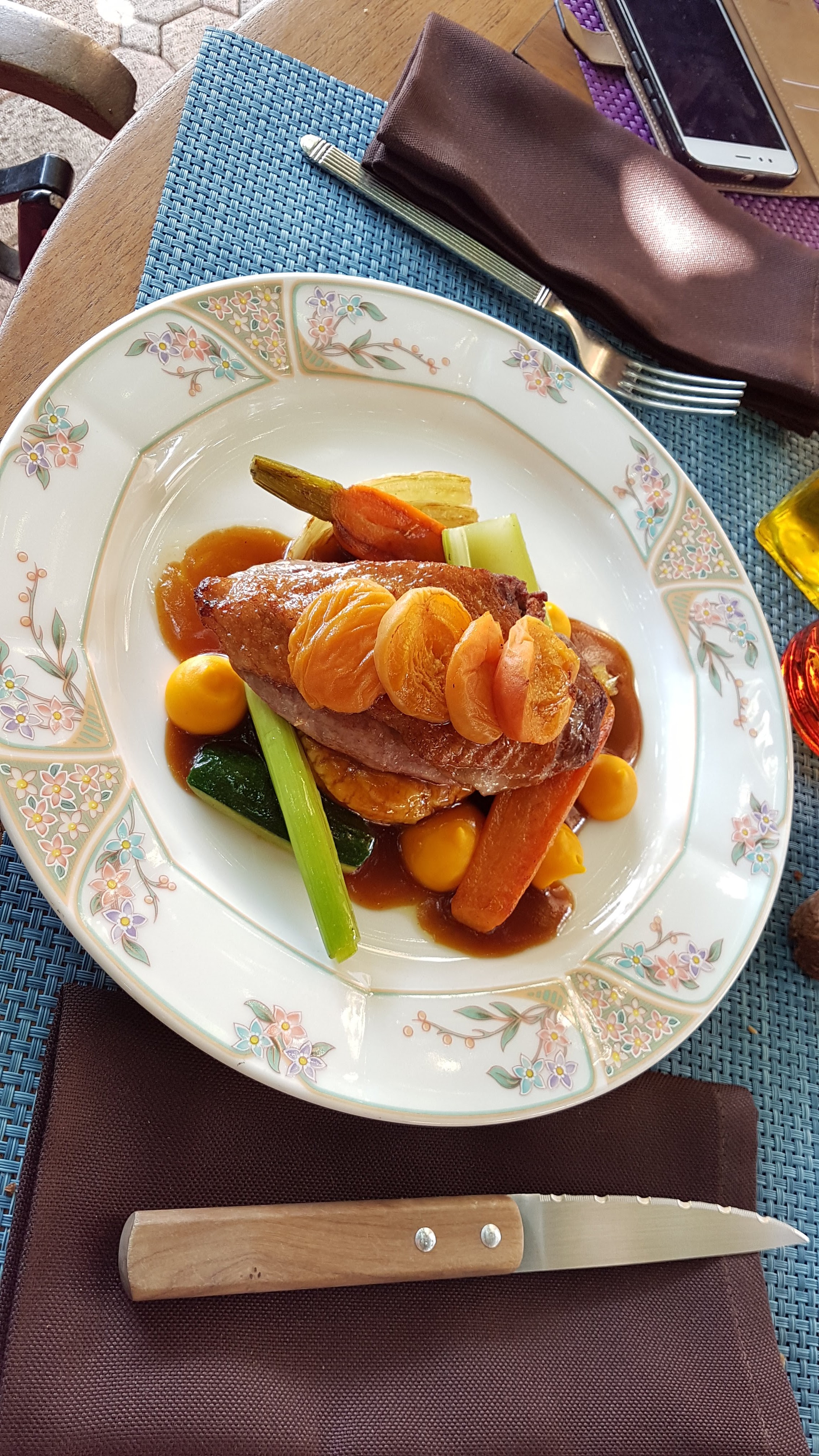 Malgré la chaleur ambiante nous avons déjeuné tranquillement à l’ombre des arbres. Le repas était très bon, la viande bien tendre. Les serveurs étaient très sympathique. Le seul bémol est la proximité avec la route qu’on entend quand même bien à côté de nous.