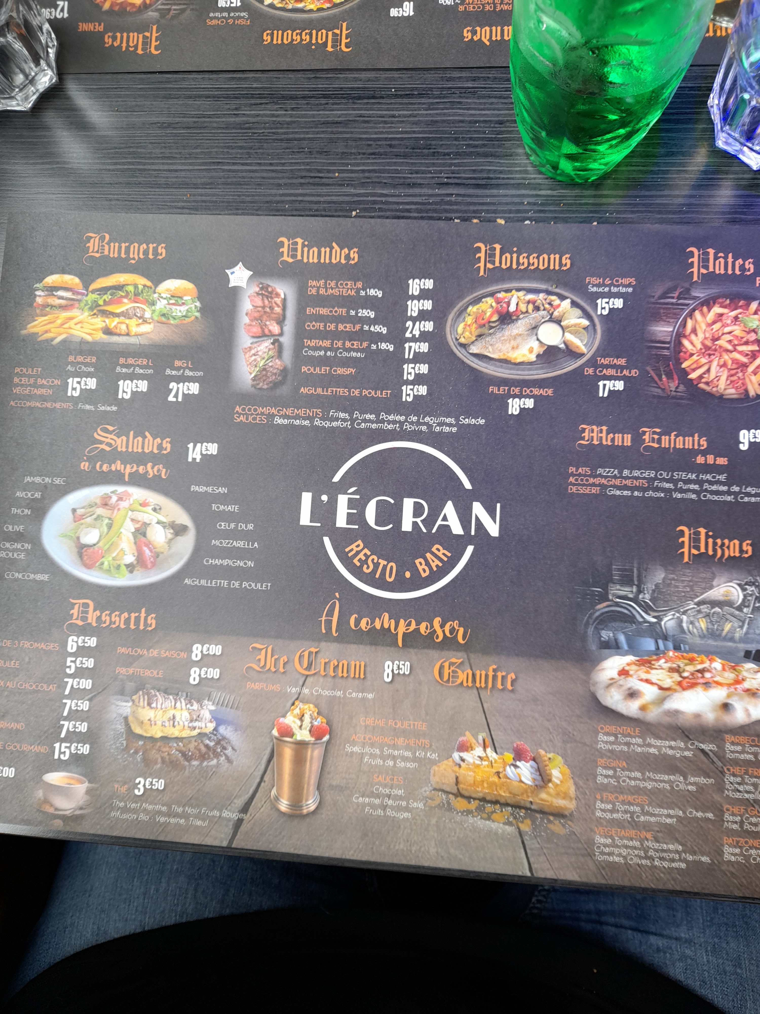 Accueil, service, concept, ambiance, produits locaux et frais bien cuisinés, sono et lumières, franchement l’ensemble est au top👍 Vivement que l’on y retourne 😊 Les avis négatifs sont soit des personnes qui ne sont jamais allées à l’Ecran ou bien des personnes qui ne seront jamais satisfaites 🤔 Il manquait un truc dans le coin, on l’a trouvé. Merci d’avoir osé faire un truc pareil à Bernay. À très bientôt