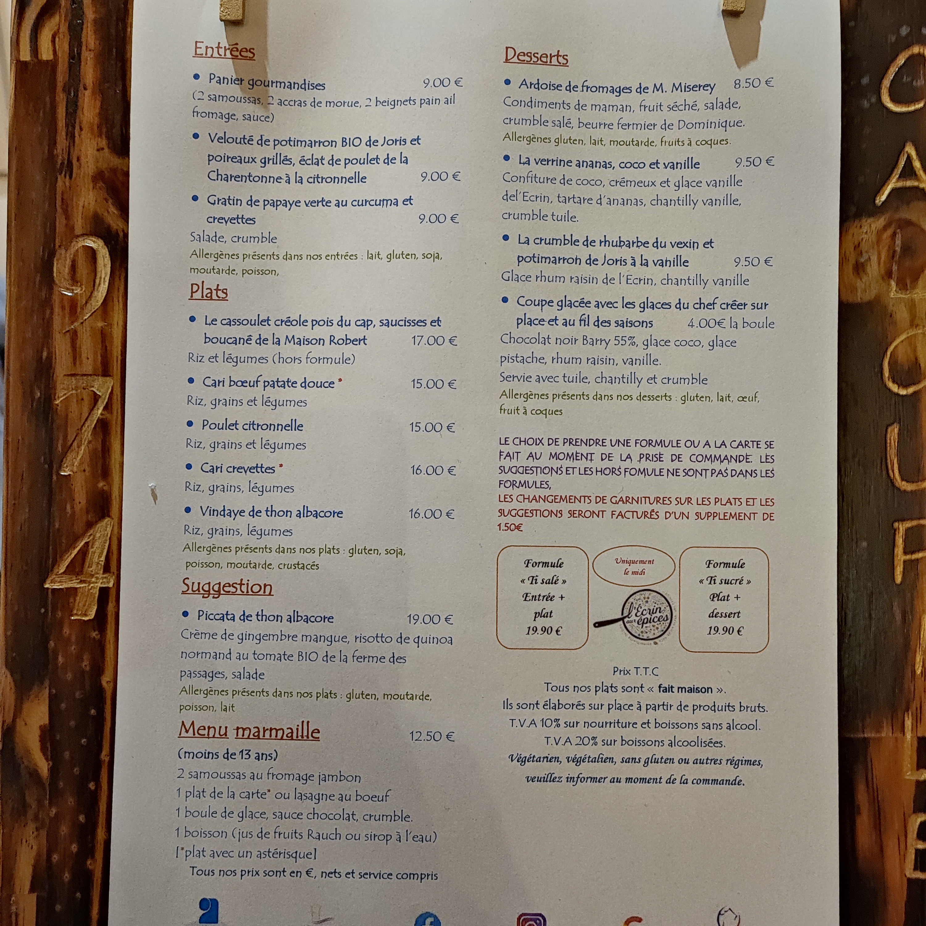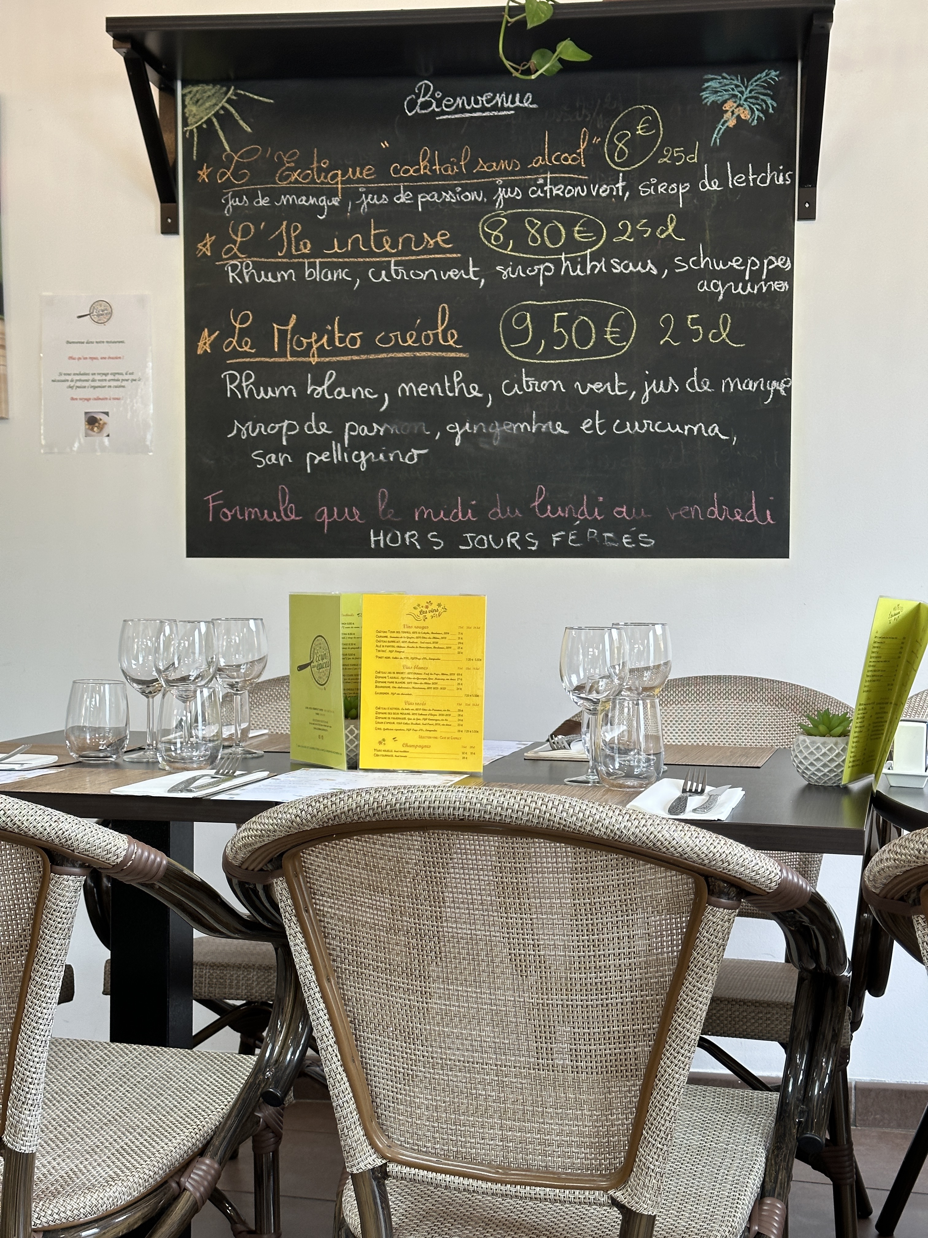 Délicieuse surprise que ce petit restaurant qui sert les plats typiques de la Réunion, savoureux et joliment revisités. Accueil et service sympathiques. Dans la pure tradition Réunionnaise on accepterait volontiers de se voir offrir le petit rhum arrangé. N'hésitez pas à y faire escale, vous ne serez pas déçus.