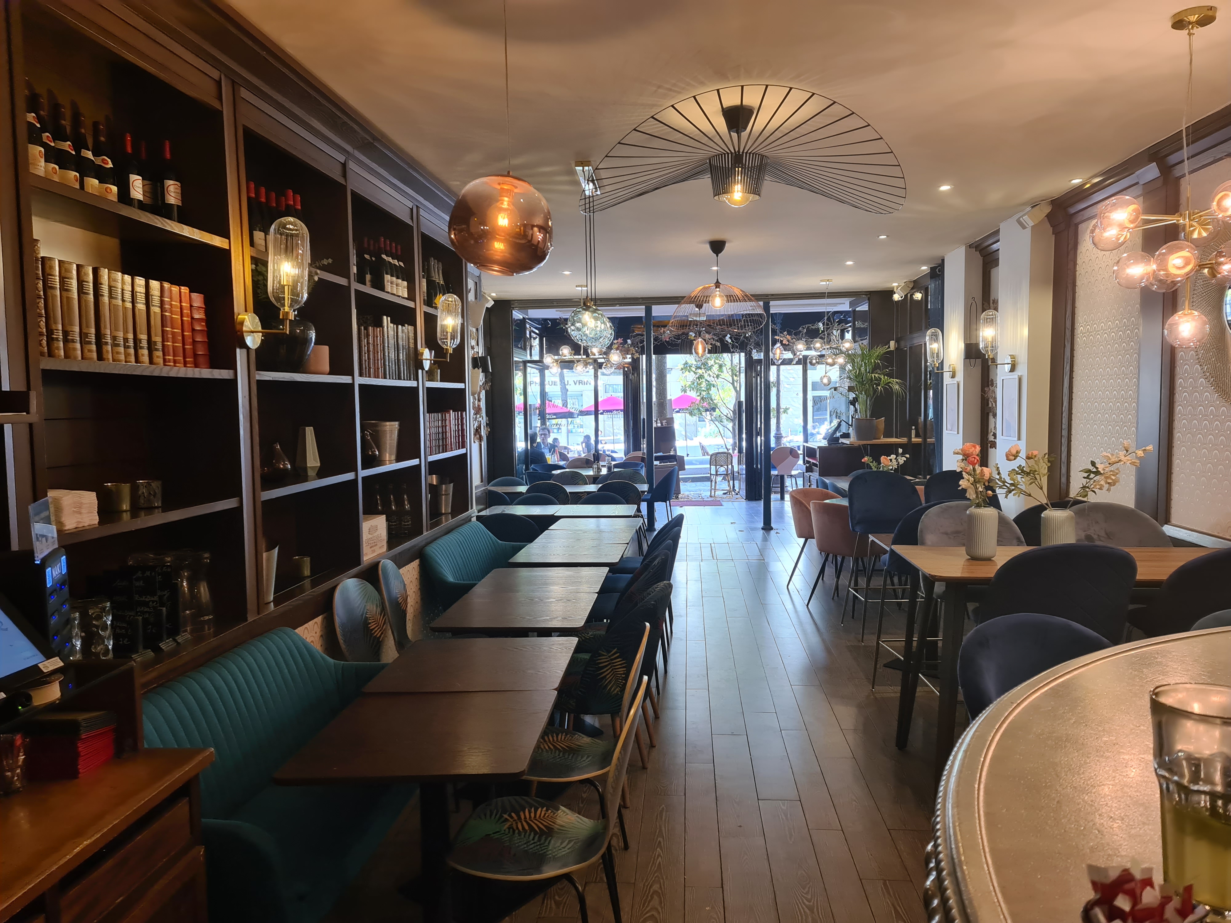 ❝ Café-restaurant français avec terrasse servant une cuisine de bistro dans une salle moderne décorée de livres. ❞