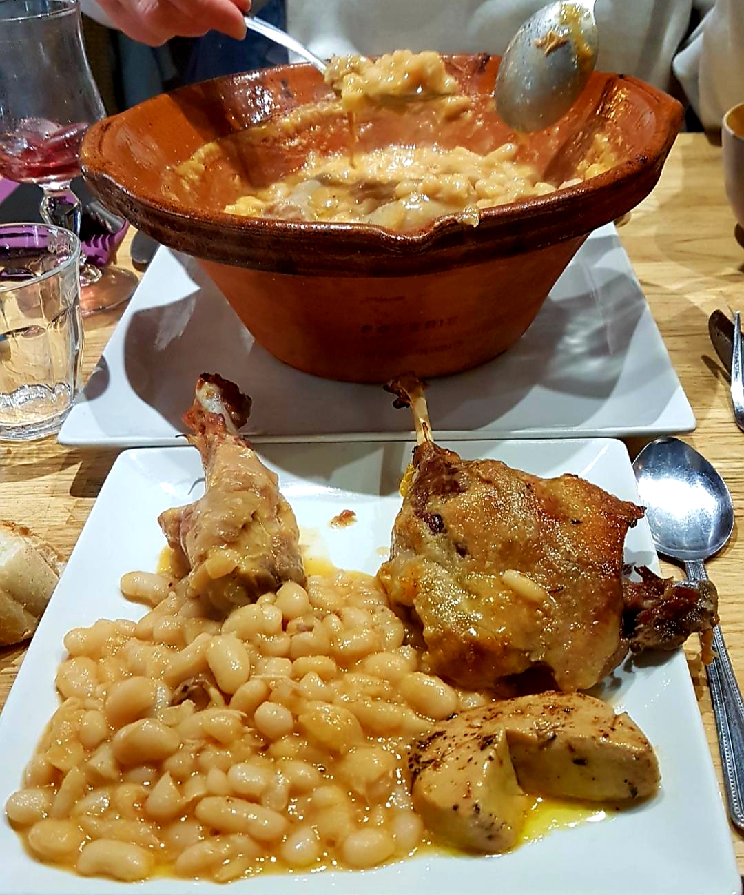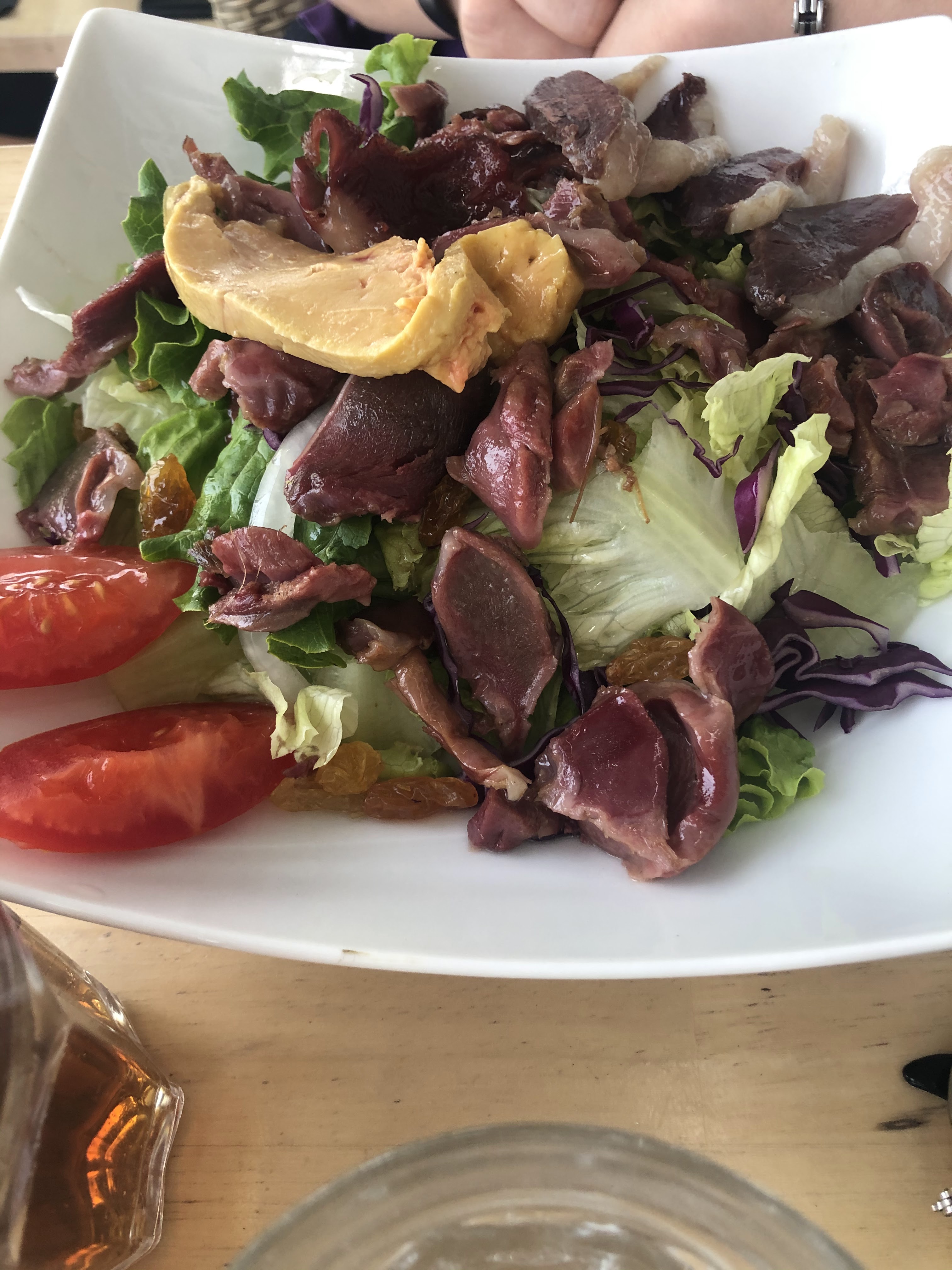 Plutôt contents, nous avons pris le menu du jour ; salade au chèvre et cassoulet maison qui était pour ma part délicieux. Les 2 sont présentés ensemble sur une même assiette ce qui nous a bien arrangé car nous n'avions qu'une heure pour manger (visite guidée prévue)