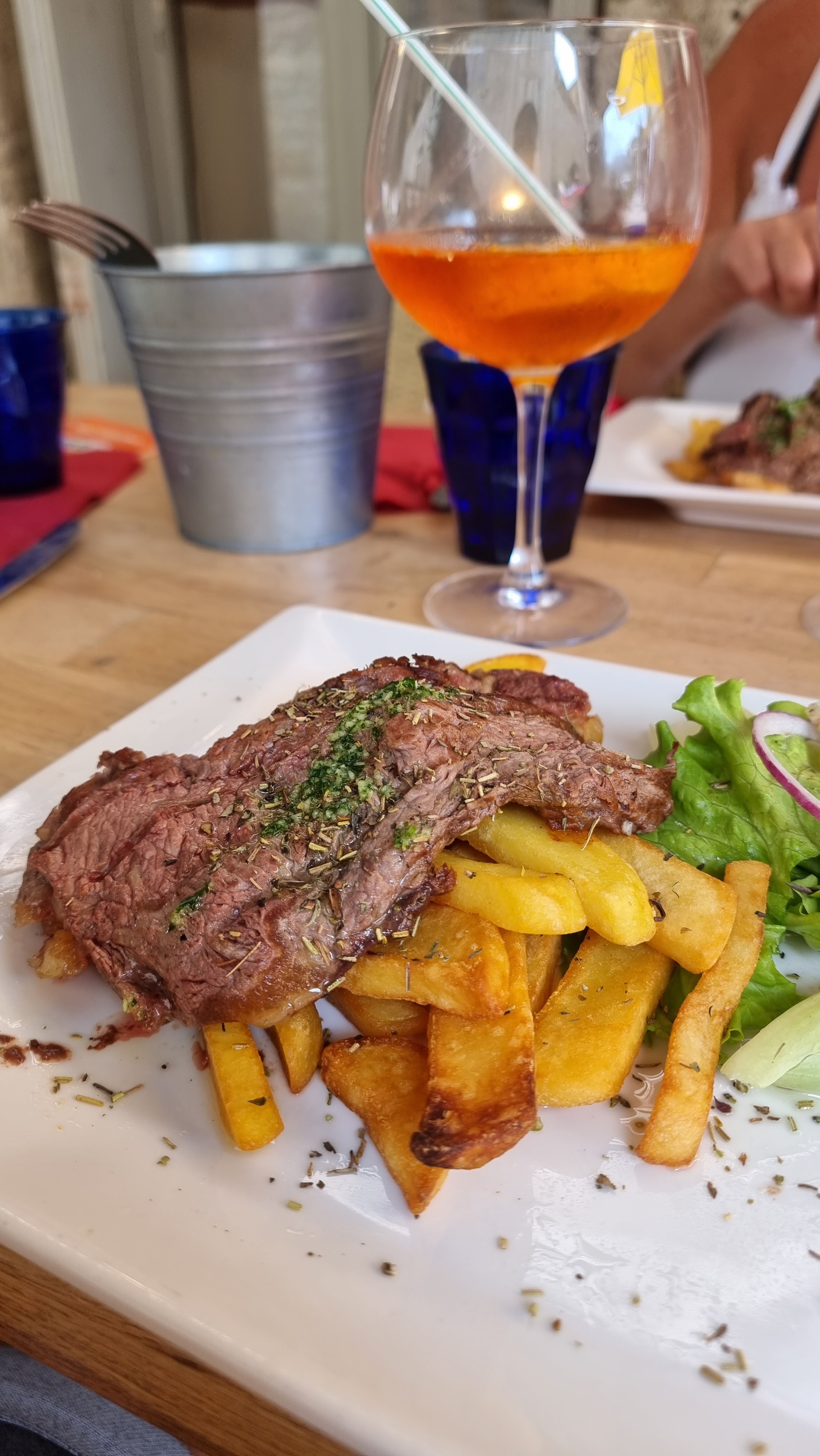 Énorme attrape touriste Menu à 26,50€ Un apérol Spritz noyé dans du Prosecco premier prix. Entrée médiocre : planche avec 2 tranches de jambon pas cher et assez de foie gras que pour tartiner un morceau de pain. Plat plutôt mauvais : faux-filet, qui tient bien son nom car j'ai plutôt senti un morceau de caoutchouc en bouche que de la viande... De plus, le morceau était ridiculement petit. Et pour dessert : une île flottante, où je cherche encore la meringue... Restaurant, si on peut appeller ce établissement comme cela, à éviter. La serveuse passe son temps a faire le gai pour vite venir reprendre les assiettes et envoyer les autres plats. Choisissez plutôt un autre restaurant de la citée que de leur offrire votre argent.