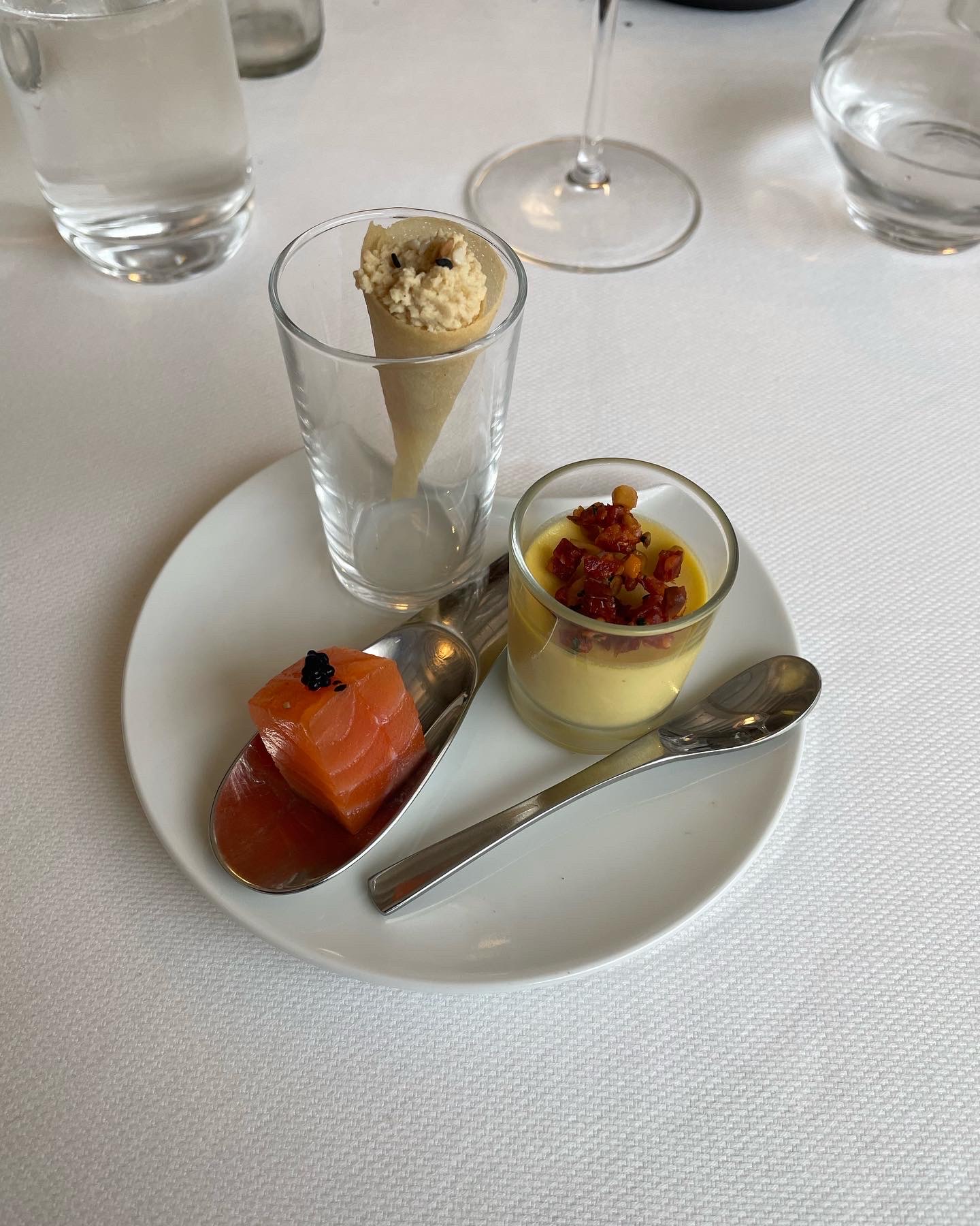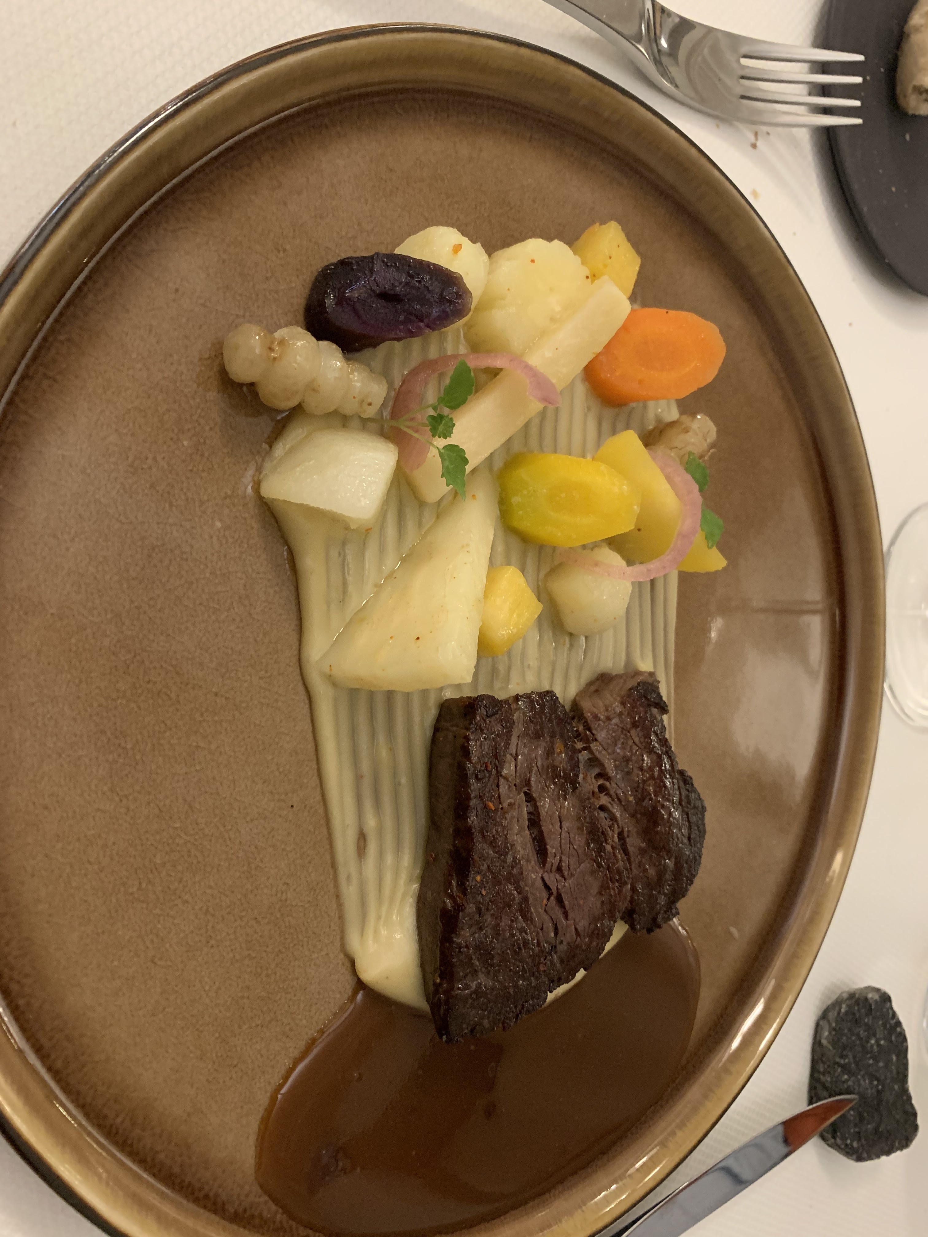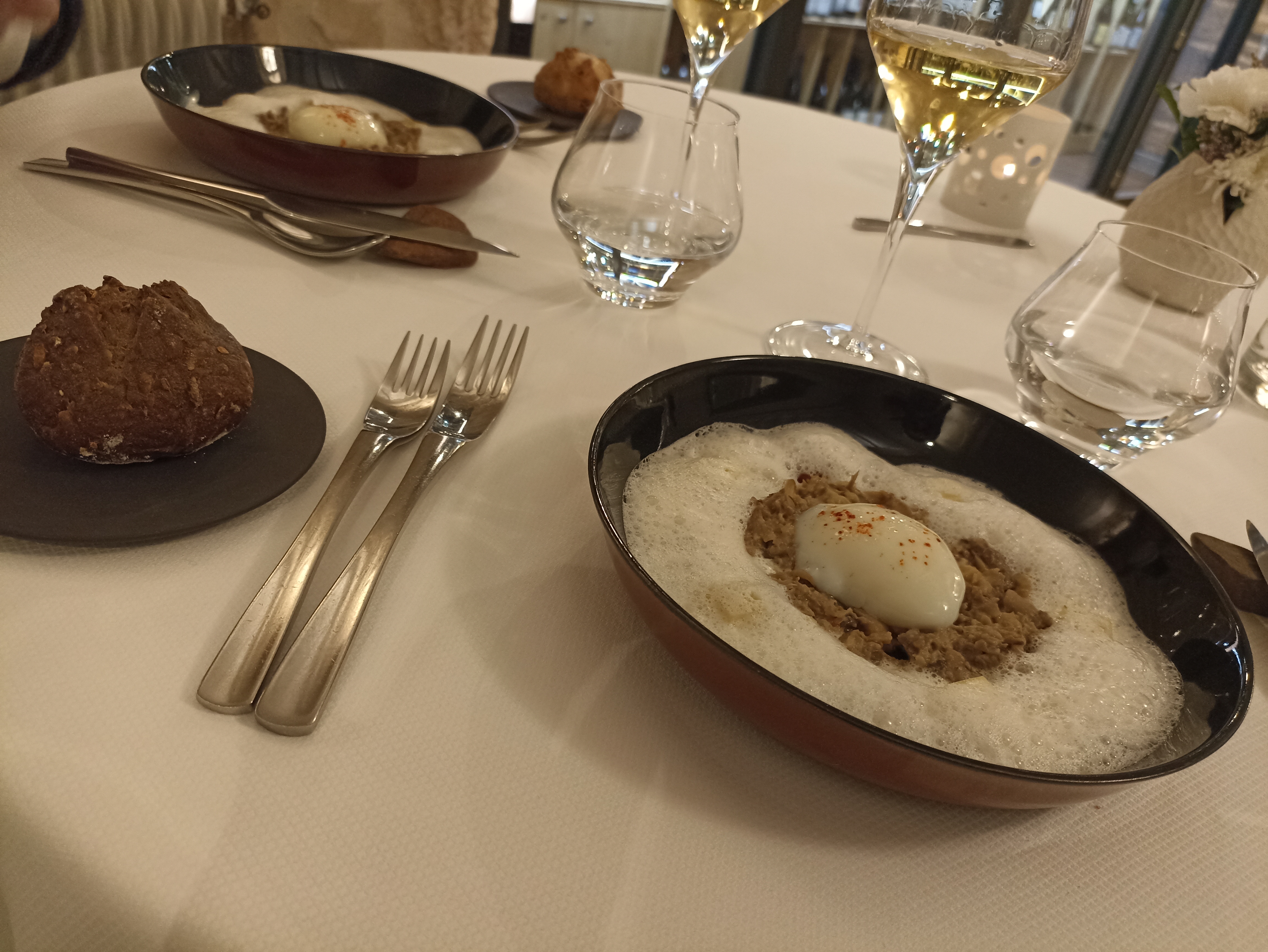 Accueil correct....nous sommes dans un semi gastro... Personnel élégant...belle carte des vins...3 choix de cartes pour les menus Mises en bouche sympathiques... originales... Dommage que les plats chauds soient servis tièdes et les légumes pratiquement crus ( la fourchette ne rentrait pas dedans ) Les ravioles auraient méritées plus de garniture...