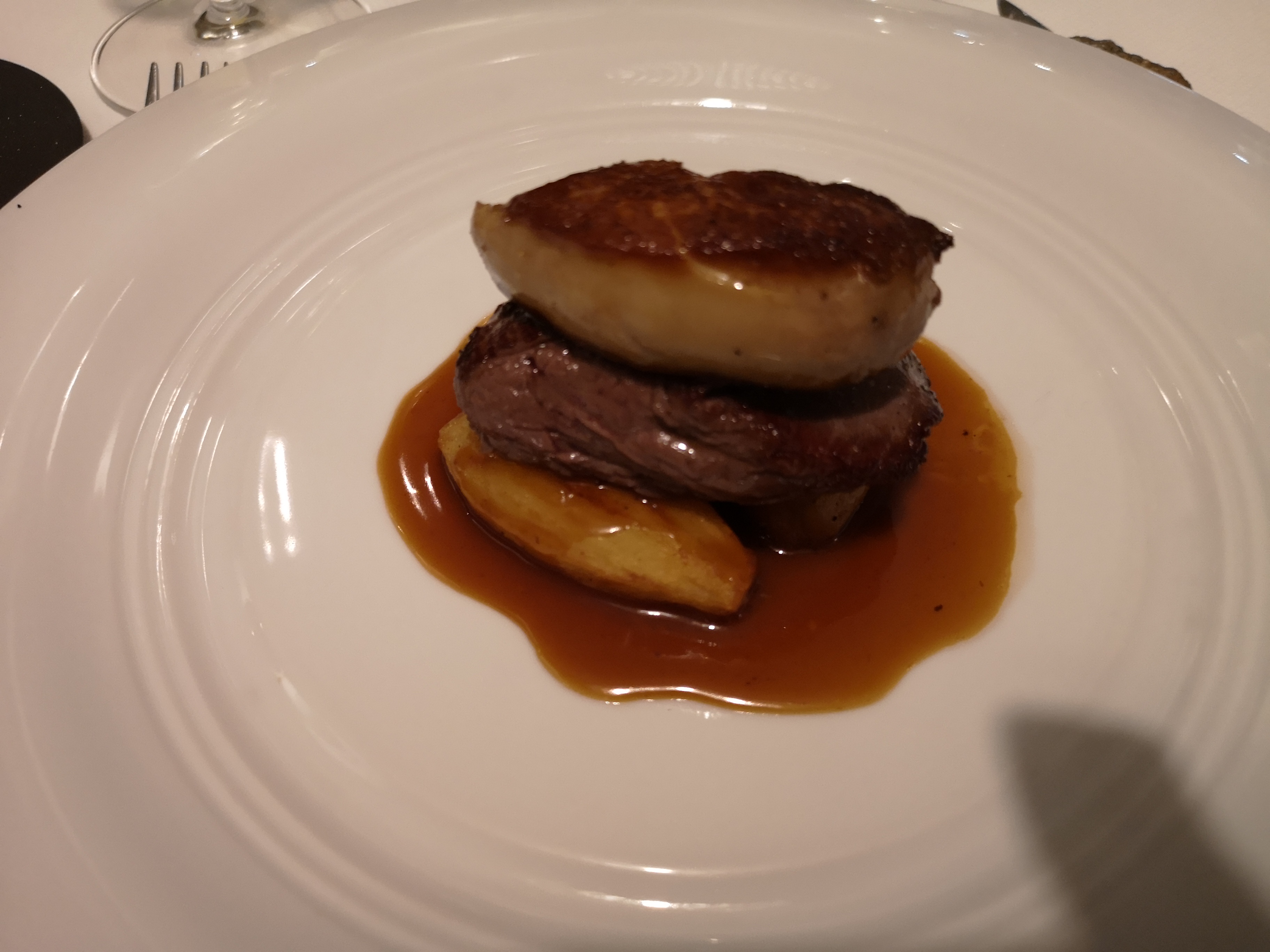 Très table beaux dressage dans de belles assiettes Le service a été parfait, avec des présentations claire pour chaque plats Serveuse agréable et. Avenante. Pour les plats un saumon gravlax bien réussi accompagné d'un ruban de céleri beaucoup trop citroné tournedos Rossini parfait et en dessert un mille feuille de pommes sur une galette sablée un peu trop dense. Très belle carte des vins Bonne adresse je recommande