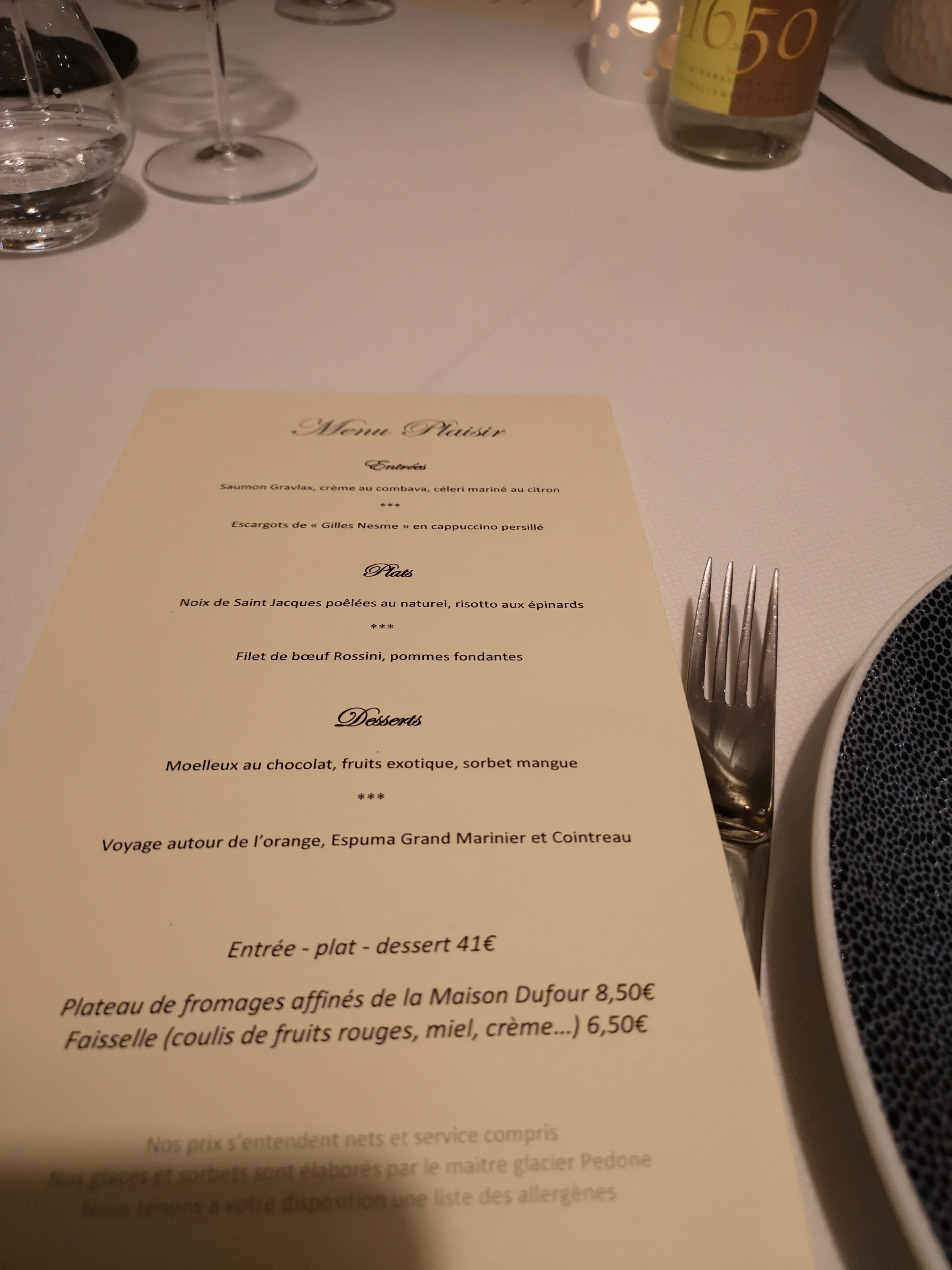 Pas de carte. 3 menus. Très bien même si l'entrée est un peu trop originale pour convenir au plus grand nombre (escargots ou transparence de chou-fleur)