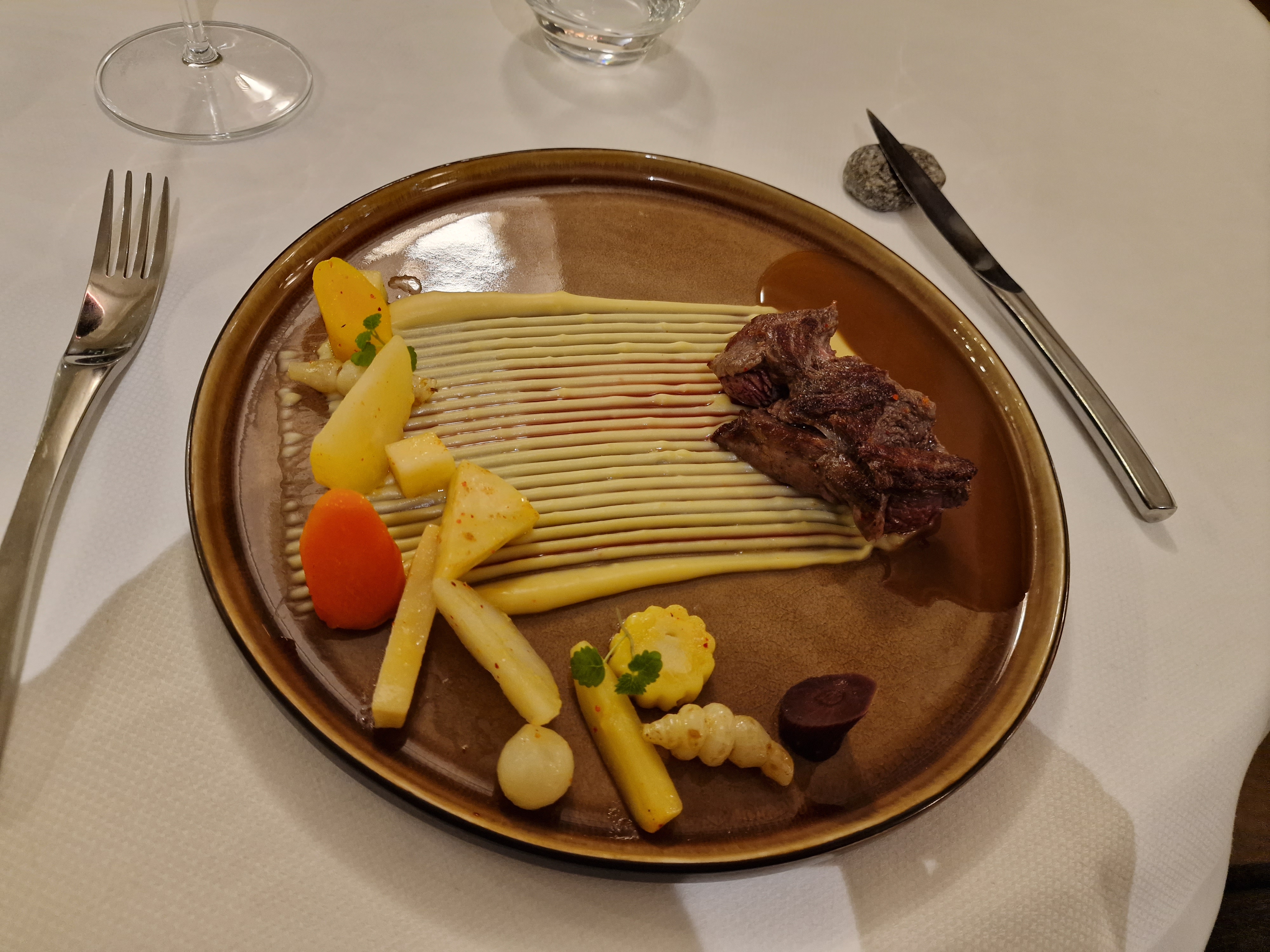Super restaurant avec un très bon accueil et le chef est très sympa. Déco sobre et il y a une magnifique cave à vin. La cuisson de la viande était juste parfaite et la présentation des assiettes est top!