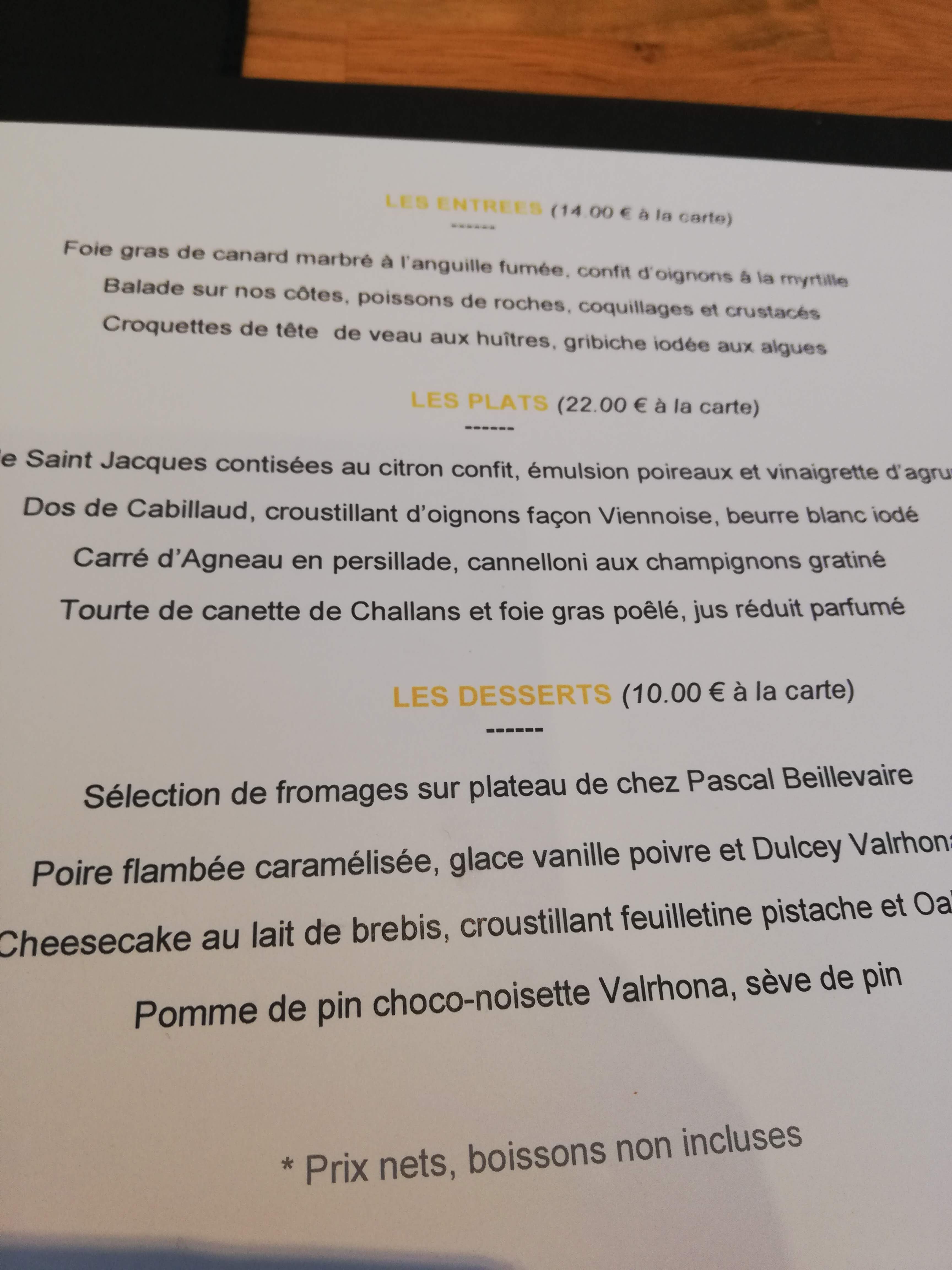 Très bon repas Très bonne expérience. Service agréable Breucoup de petits à côté fort sympathiques (deux mises en bouche, accompagnement du café,, trois beurres avec trois parfums...) Et pour l'essentiel : le carpacio de Daurade était excellent, le cochon avec du choux farci également, et les ravioles de langoustine ont été très appréciés. Idem pour les desserts (Tiramisu avec une présentation très originale et pomme de pin au Chocolat ) Une excellente adresse à ne pas rater sur la route de Noirmoutiers.