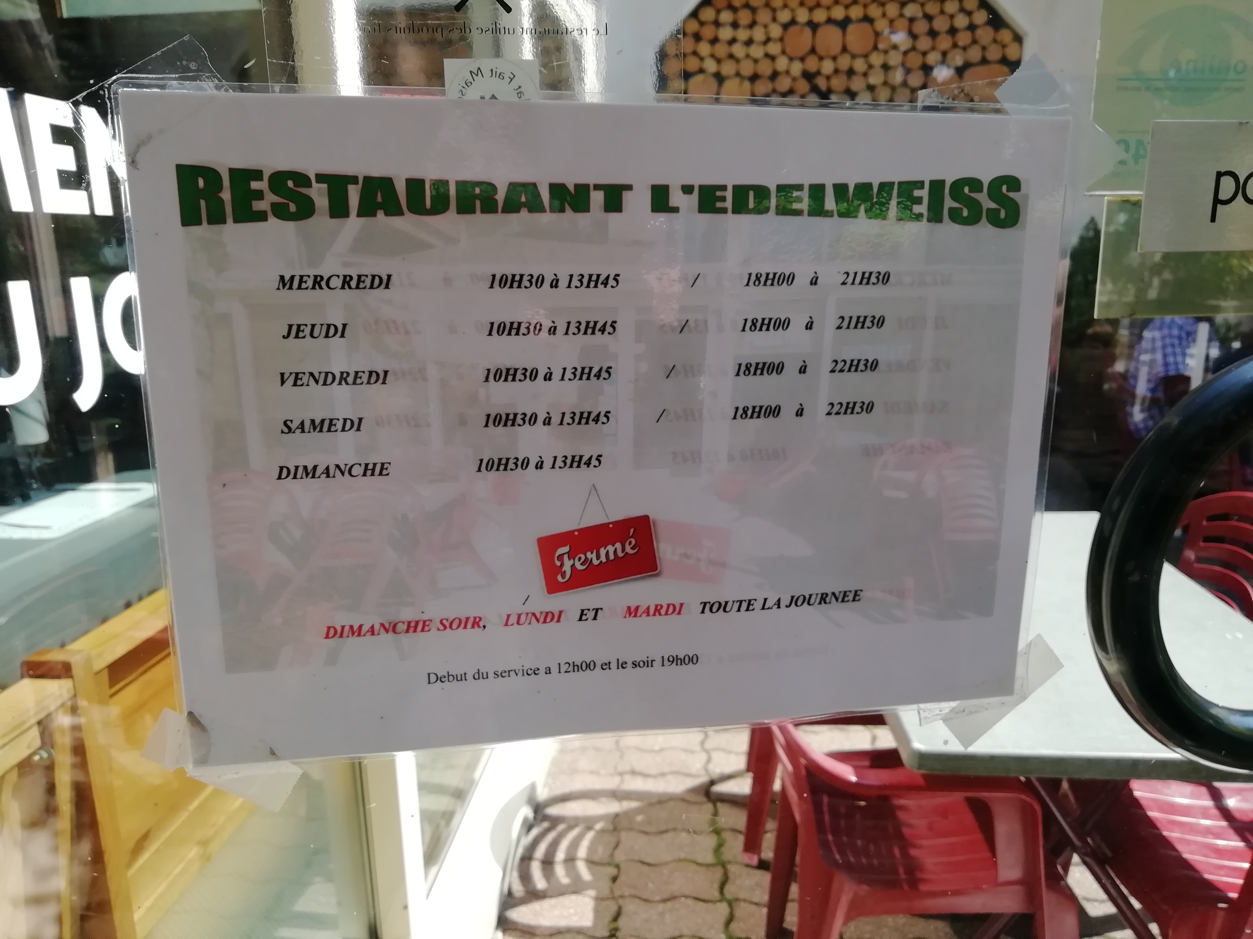 Attente interminable même en commandant les pizzas à l'avance par téléphone. Nous sommes arrivé à 19h, comme convenu par téléphone les pizzas aurait dû être prête à notre arrivé car ne devions repartir à 19h45. Au final elles sont arrivé à 19h30 Même pas de geste de leurs part Vue les tarifs exercé autant aller dans le restaurant d'à côté ''autour du monde'' Ils ne sont pas prêt de nous revoir à l'edelweiss
