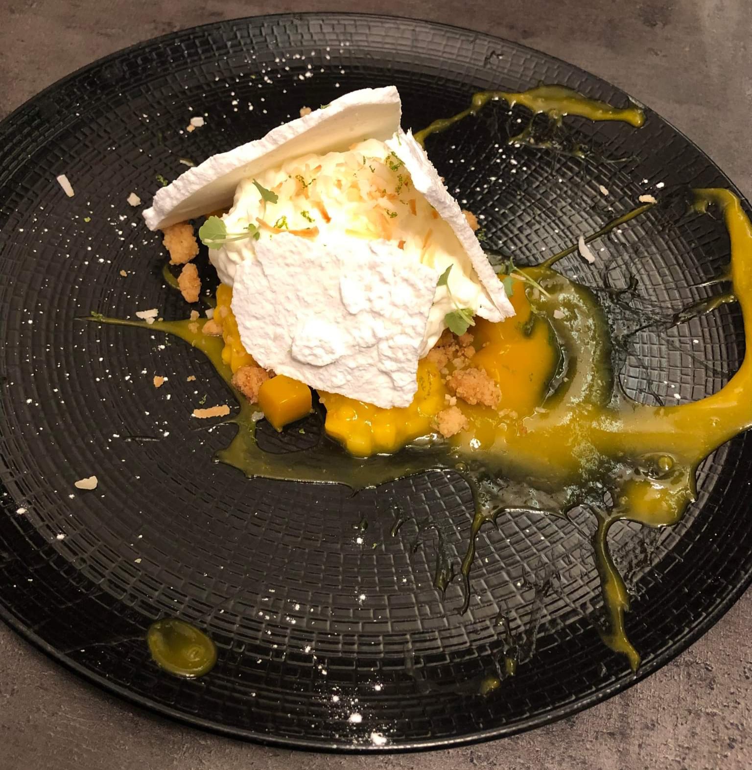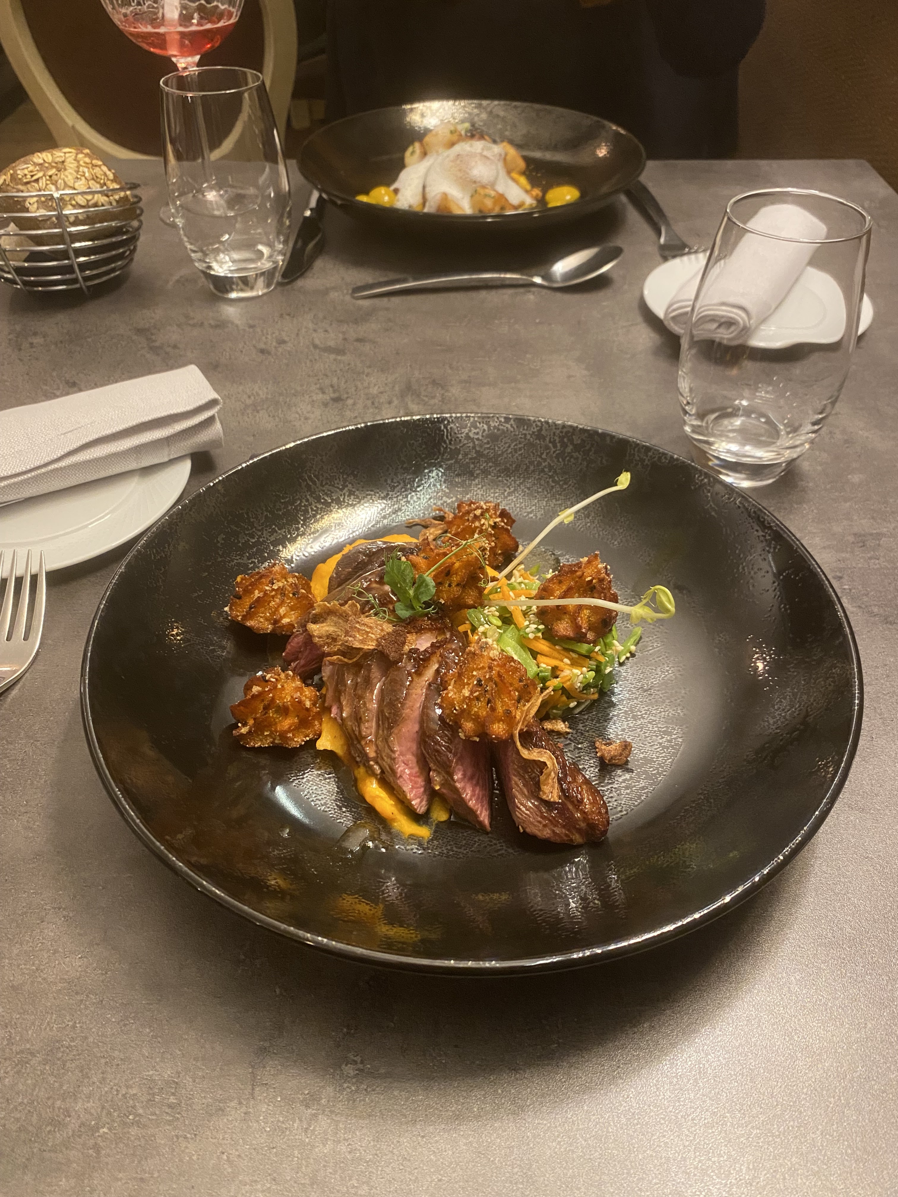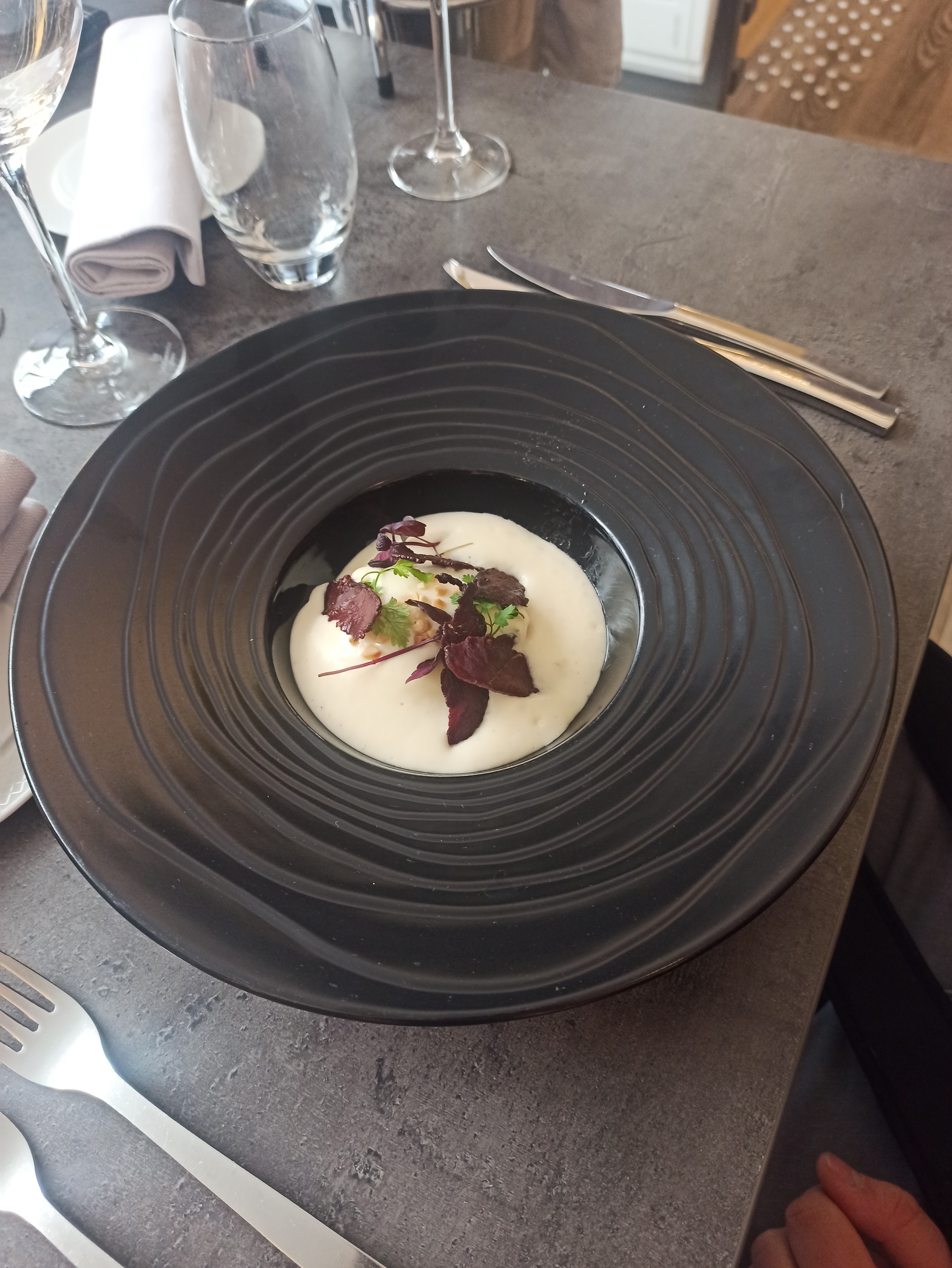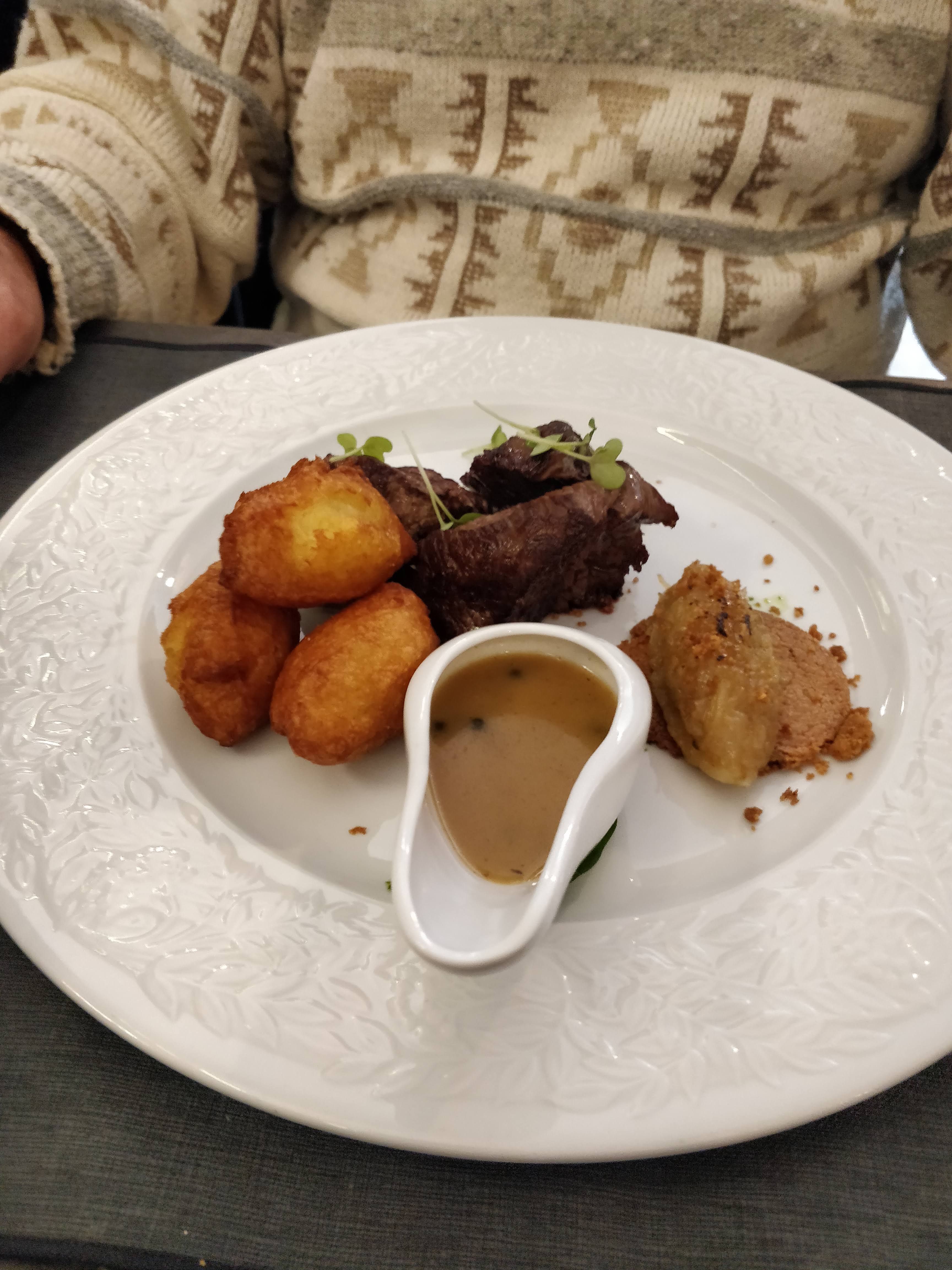 Du début à la fin du repas tout était très bien . De belles mises en bouche pour nous faire patienter ( petites bouchées chèvre et tomates , mini velouté de butternut ) Croustillant de ris de veau en entrée goûteux fin beau mariage des saveurs Pavé de maigre en plat principal poisson fin cuisson parfaite accompagné de sa purée de panais On a passé un très bon moment On reviendra et la prochaine fois on goûtera aux desserts ( ils étaient pas à nôtre goût riz au lait de coco et moelleux au chocolat pas fan)