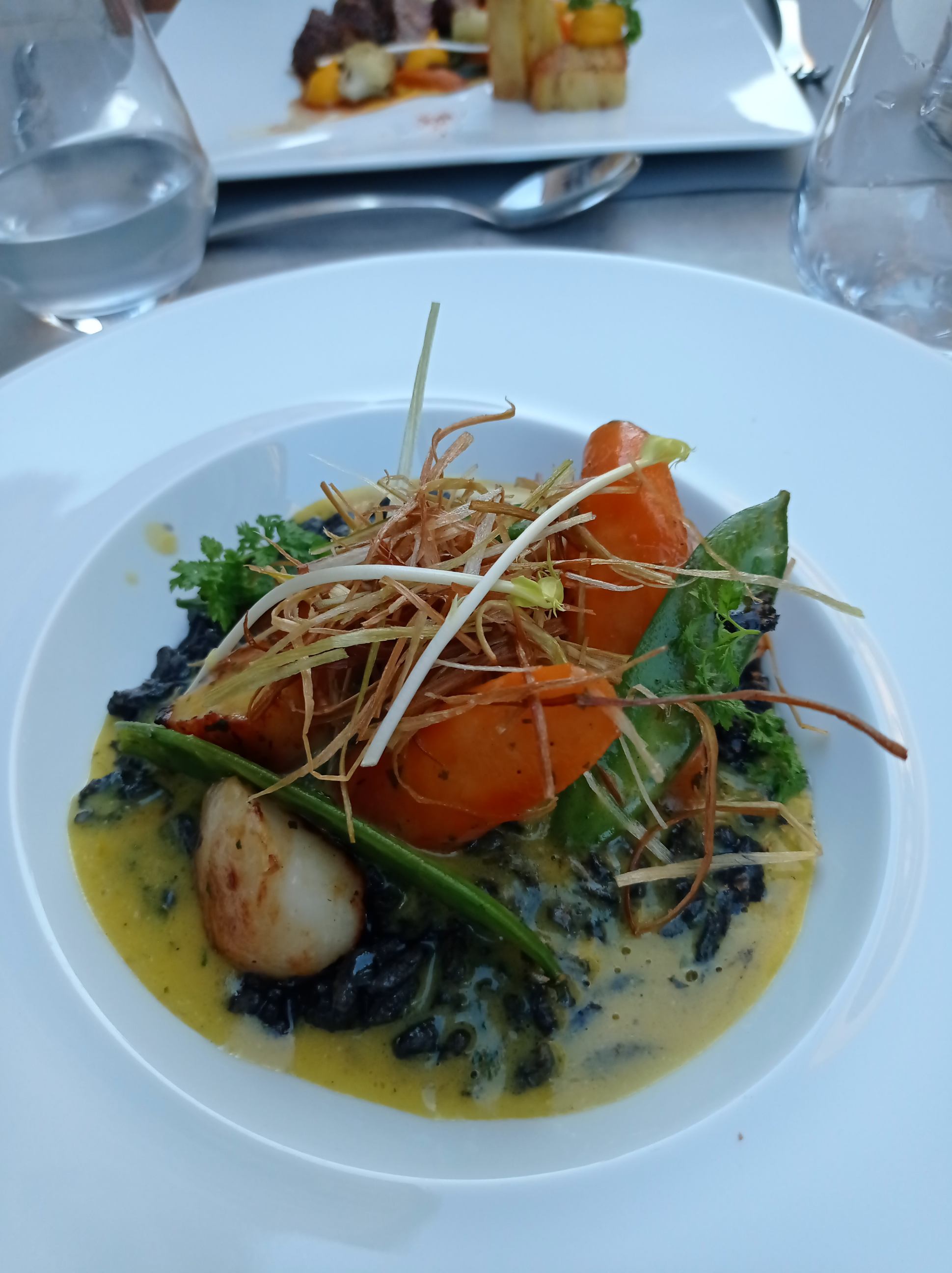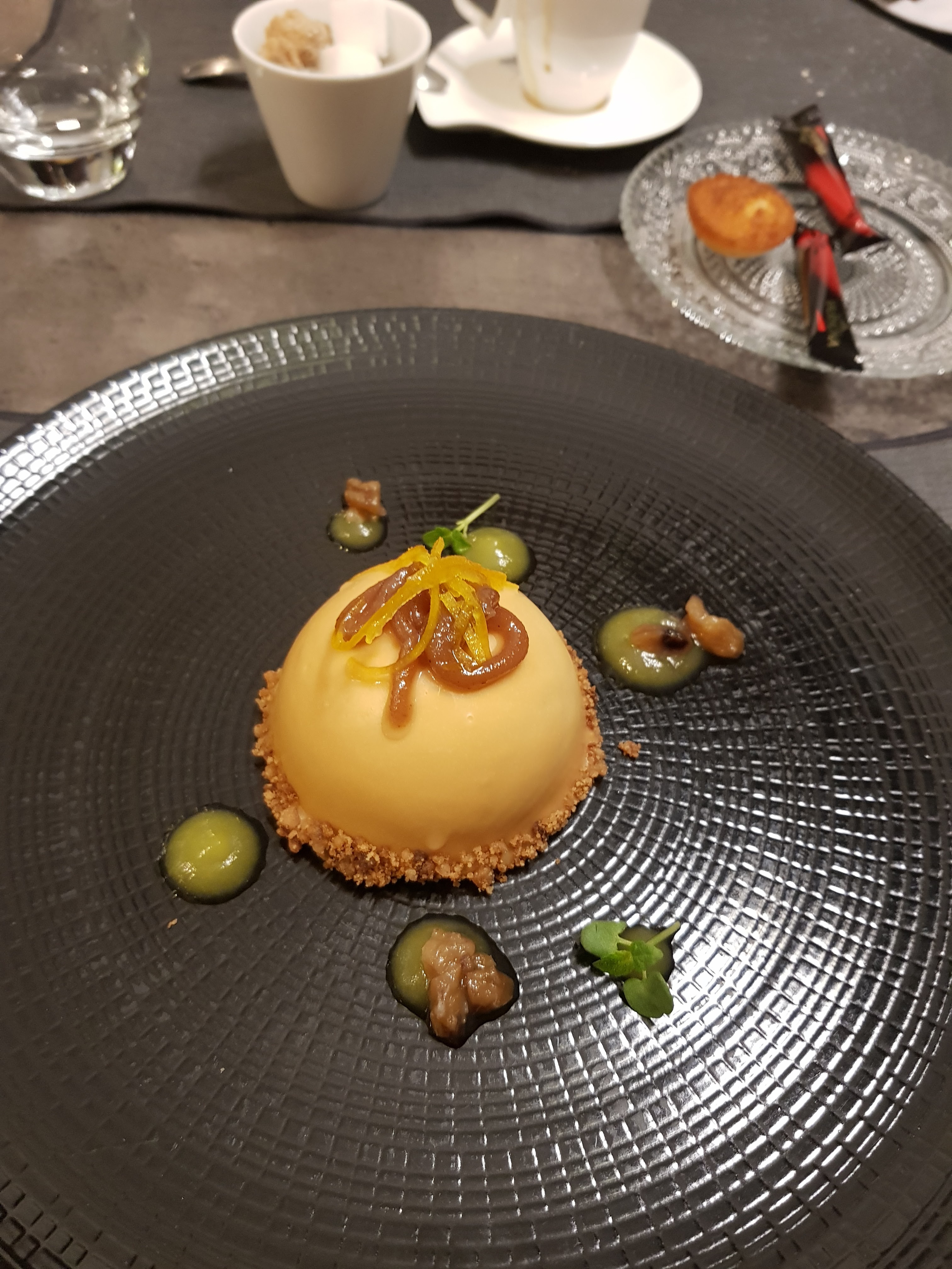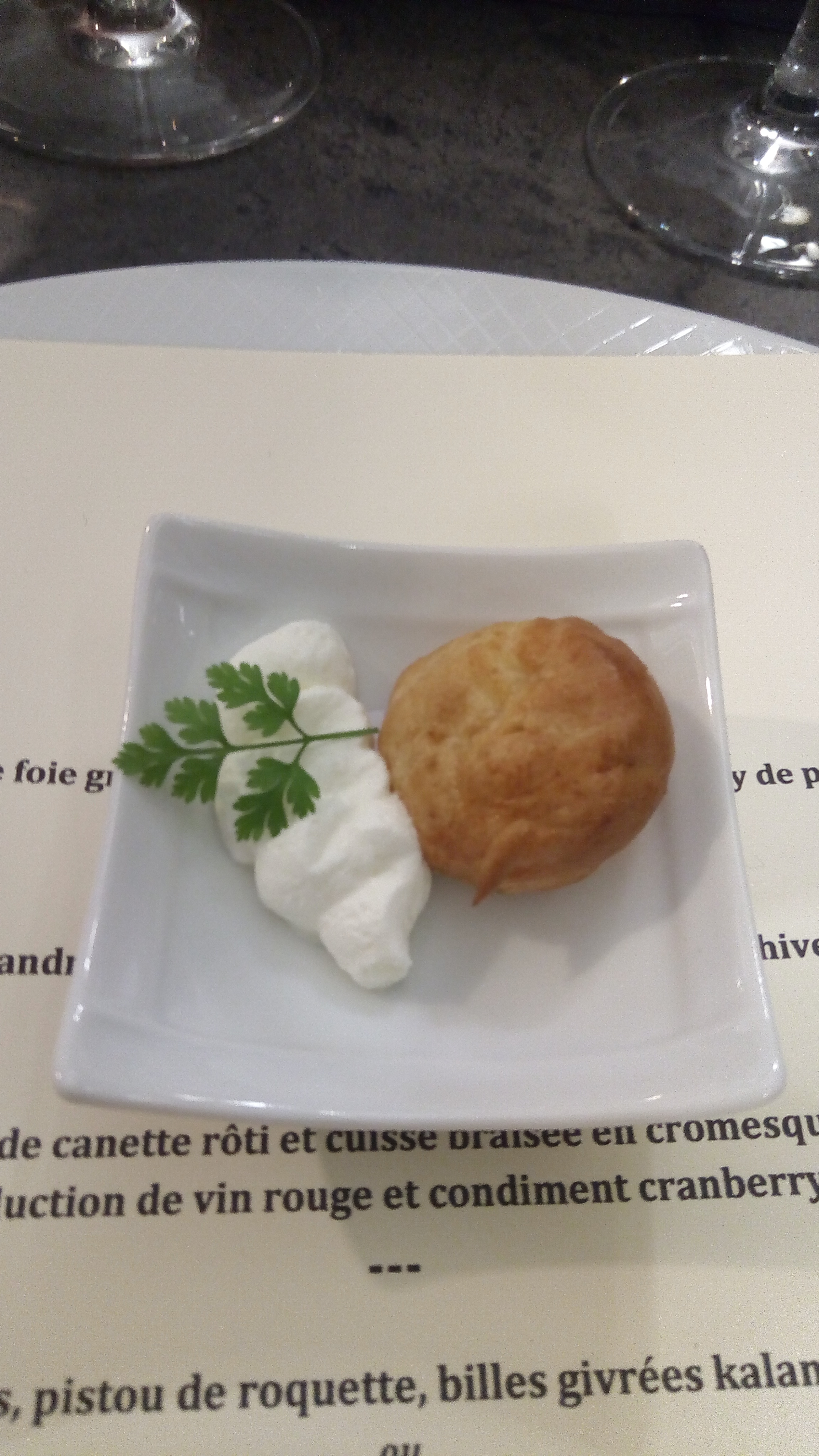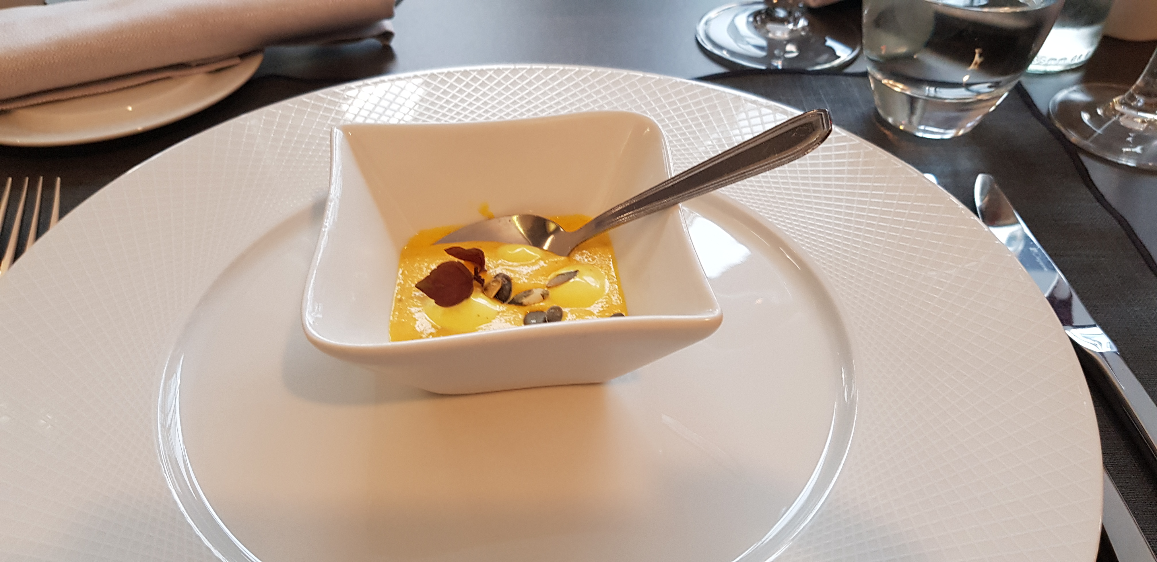 Du début à la fin du repas tout était très bien . De belles mises en bouche pour nous faire patienter ( petites bouchées chèvre et tomates , mini velouté de butternut ) Croustillant de ris de veau en entrée goûteux fin beau mariage des saveurs Pavé de maigre en plat principal poisson fin cuisson parfaite accompagné de sa purée de panais On a passé un très bon moment On reviendra et la prochaine fois on goûtera aux desserts ( ils étaient pas à nôtre goût riz au lait de coco et moelleux au chocolat pas fan)