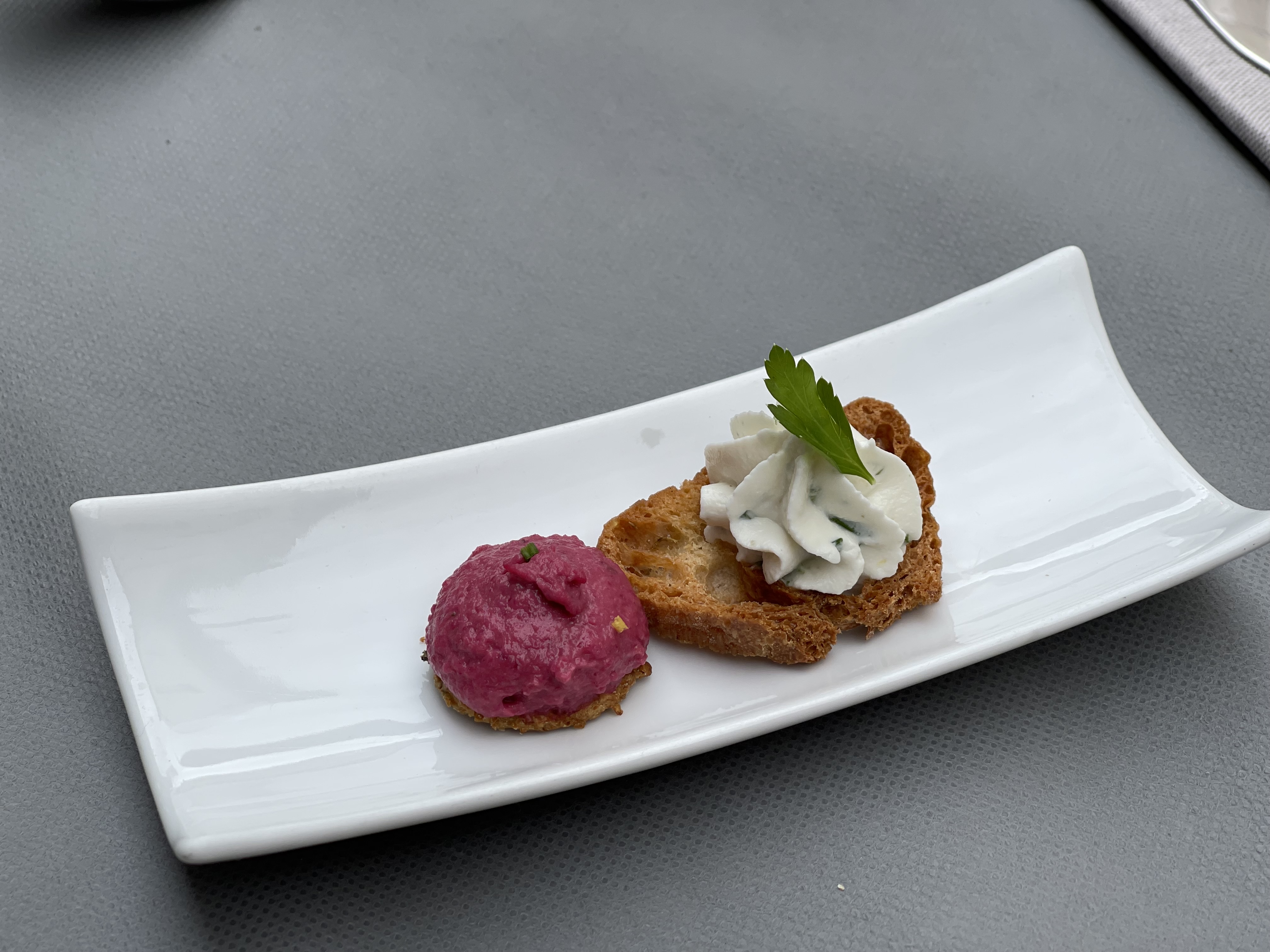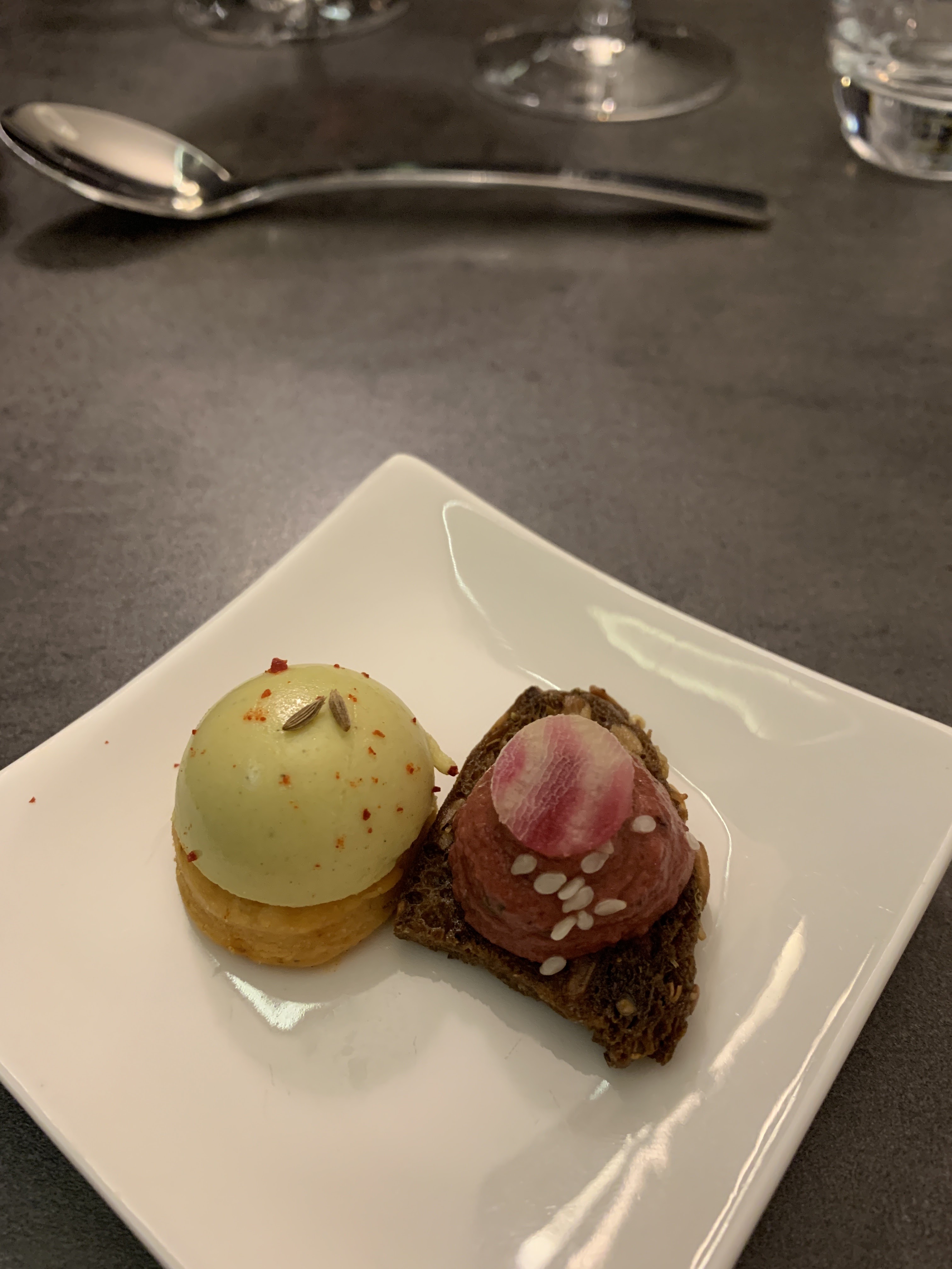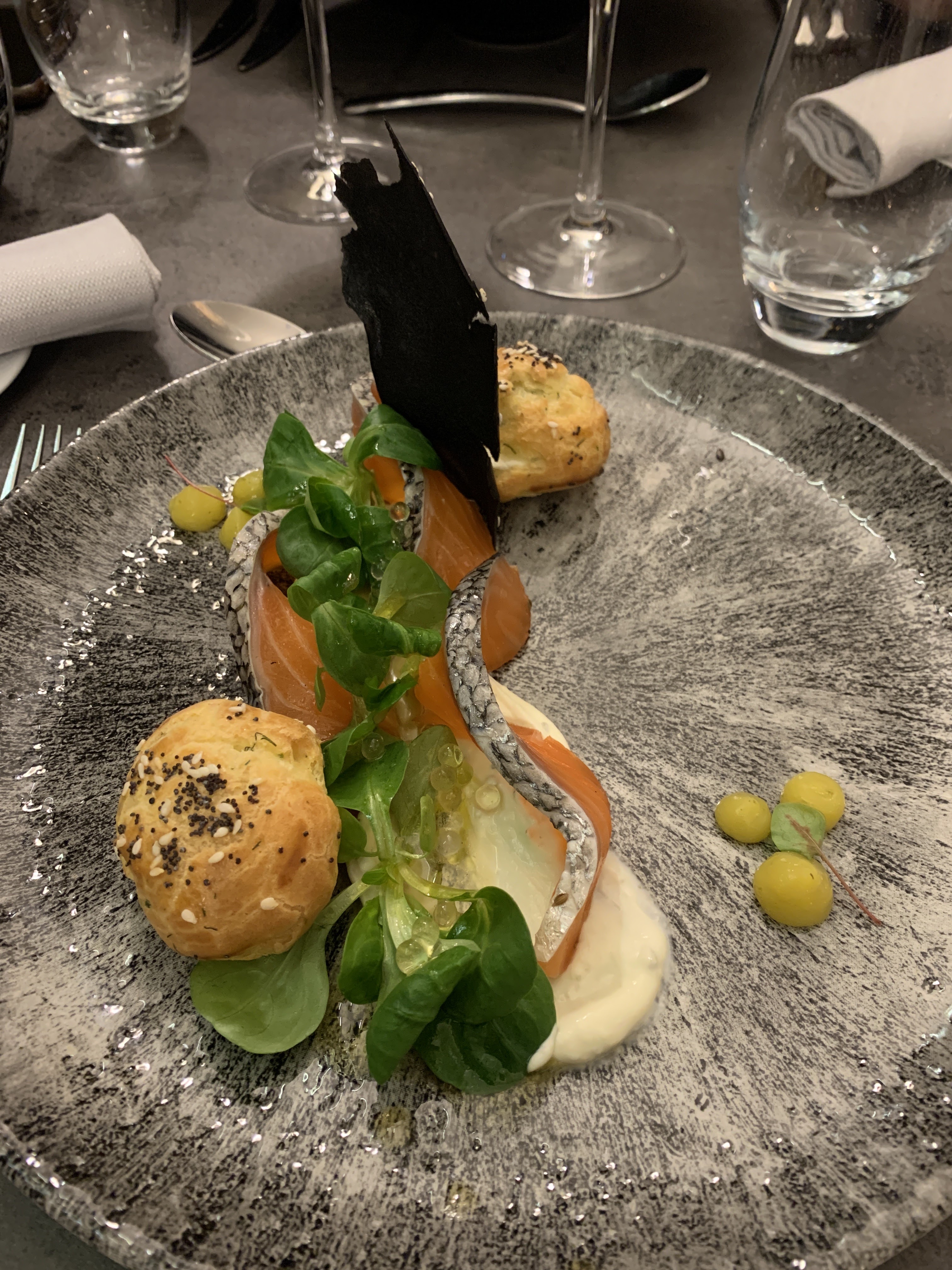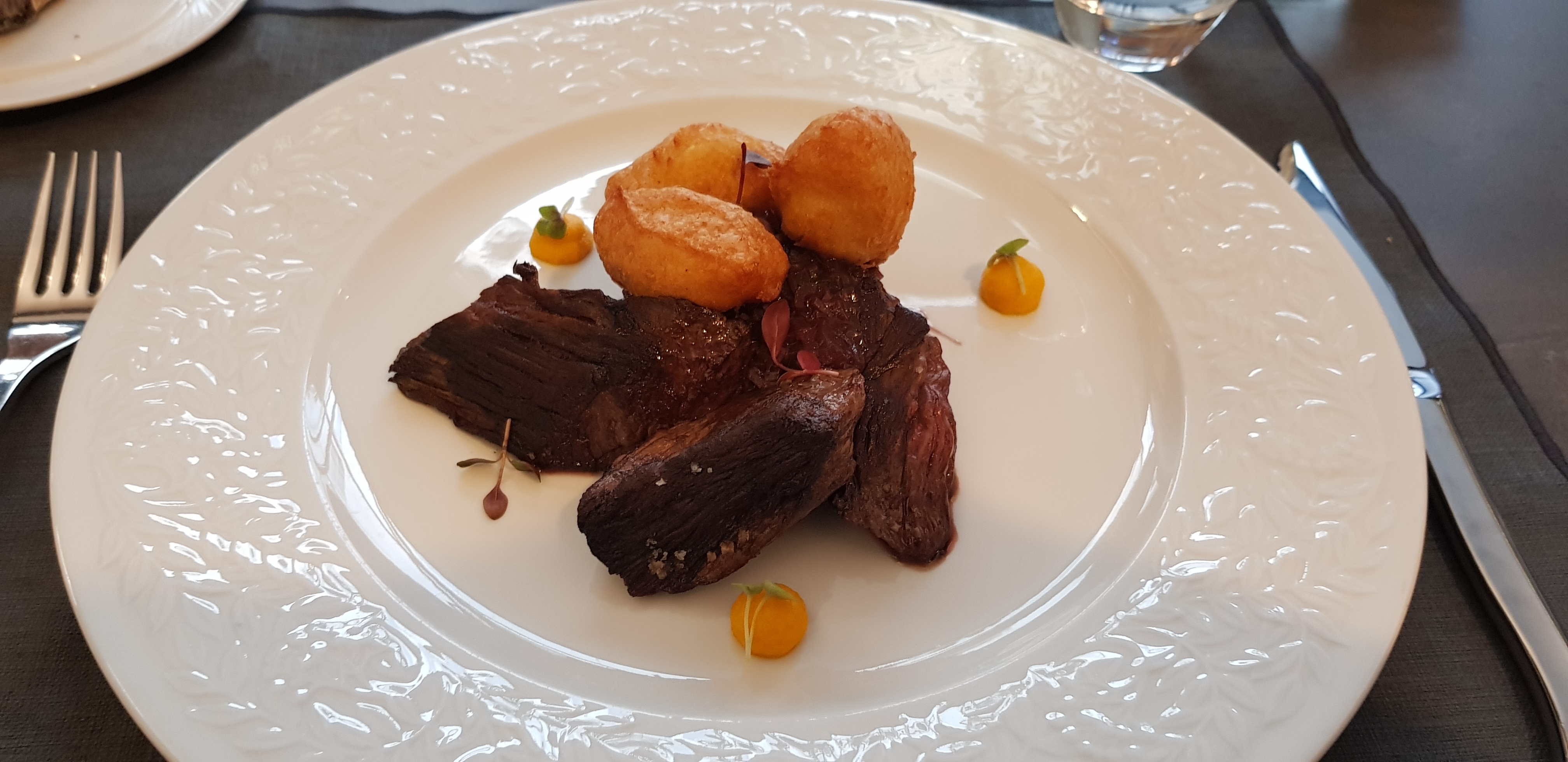 Du début à la fin du repas tout était très bien . De belles mises en bouche pour nous faire patienter ( petites bouchées chèvre et tomates , mini velouté de butternut ) Croustillant de ris de veau en entrée goûteux fin beau mariage des saveurs Pavé de maigre en plat principal poisson fin cuisson parfaite accompagné de sa purée de panais On a passé un très bon moment On reviendra et la prochaine fois on goûtera aux desserts ( ils étaient pas à nôtre goût riz au lait de coco et moelleux au chocolat pas fan)