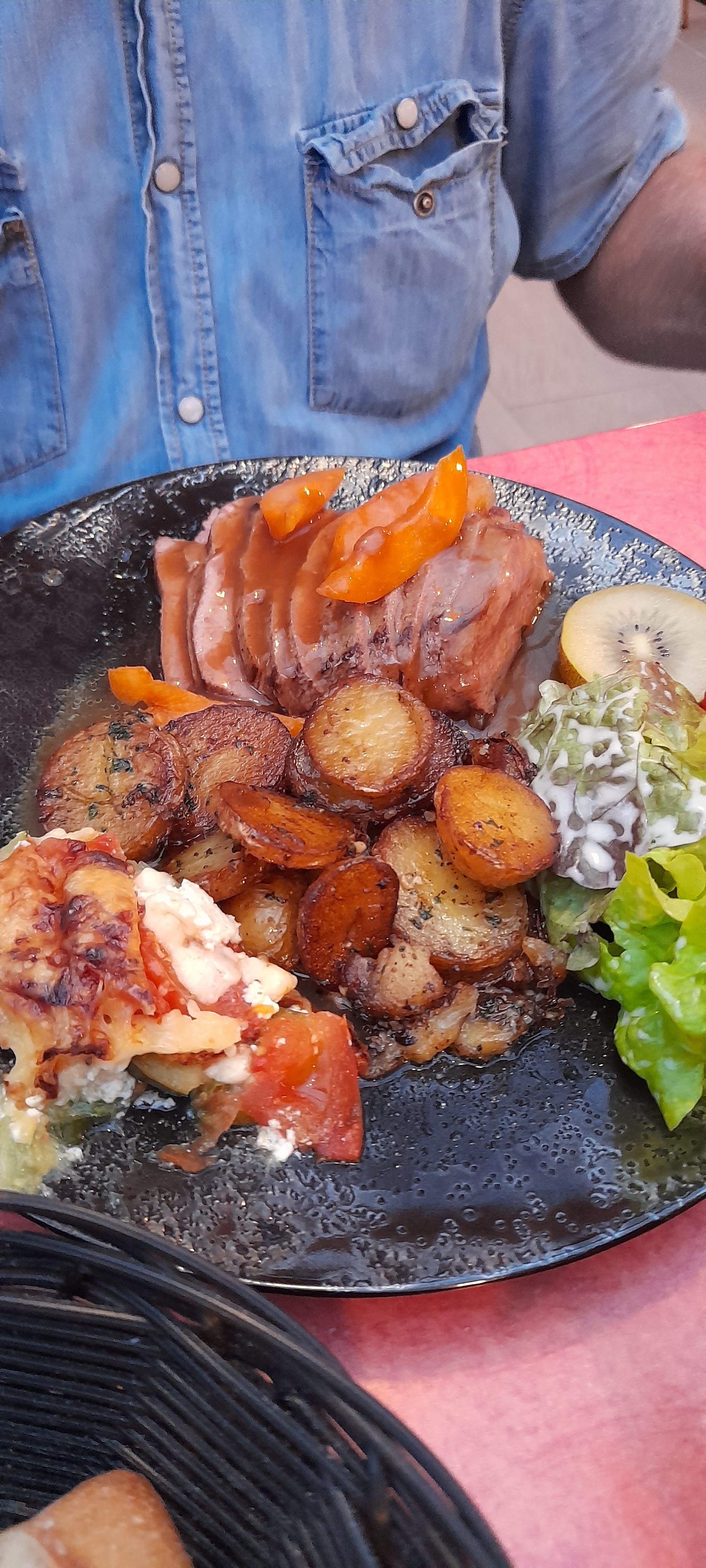 Très bien et très bonne restauration. Des plats à la fois de bonne qualité et fait maison avec goût et saveurs. Très bien présenté à l'assiette et en quantité. Nous avons souper en terrasse. Une balançoire et des jeux d'enfants sont présents sur la pelouse près des tables ce qui permet aux parents de se décontracter également. Des lampes sont également disponibles et agrementes le décor. Et surtout l'addition est très abordable ! Parfait