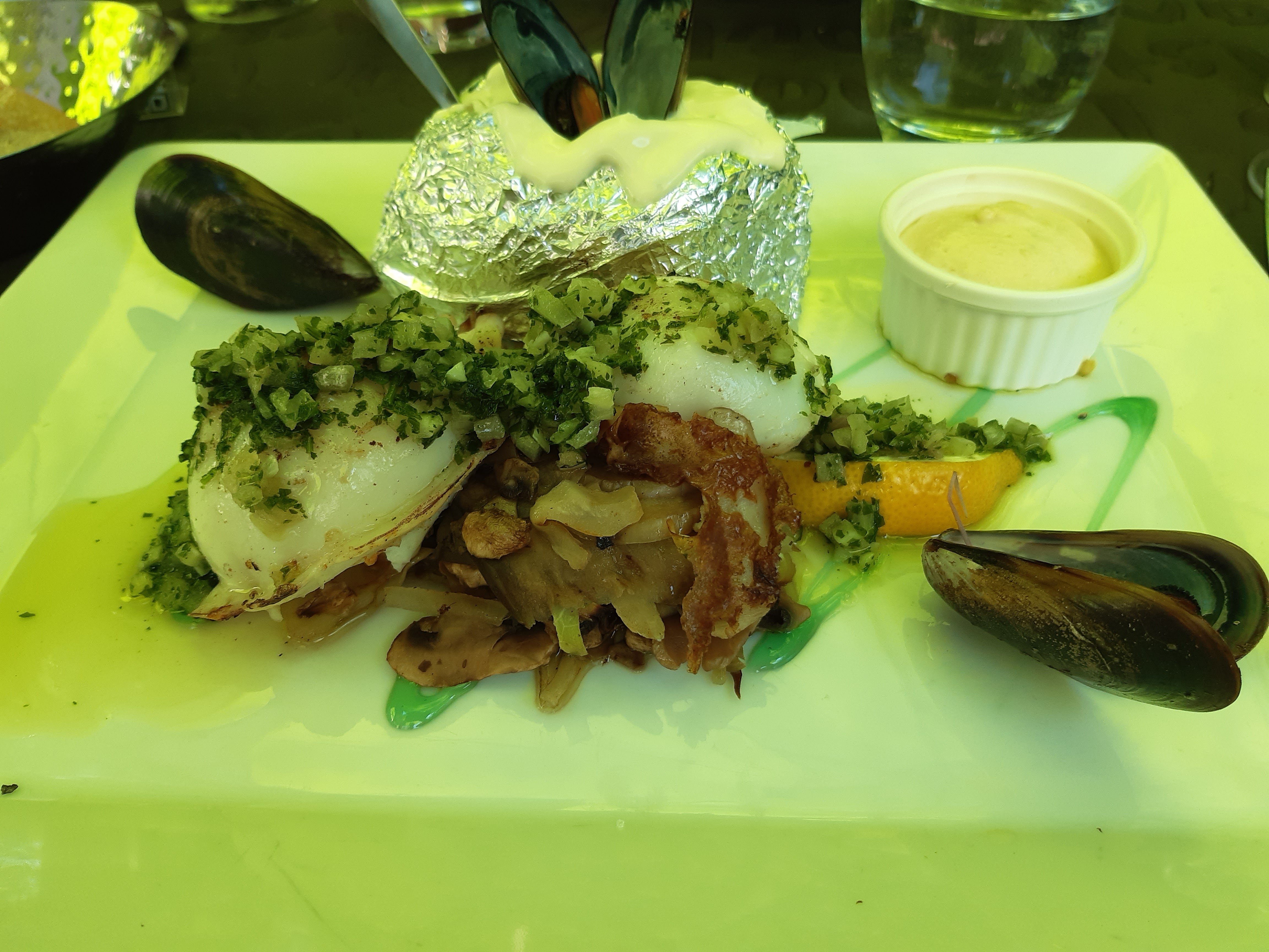 Très belle terrasse ombragée, calme, musique d'ambiance, plats goûteux très belles présentations.serveurs disponibles et agréables. Points d'améliorations : pas de changement de couverts entre l'entrée et le plat( permet d'éviter les mélanges de saveurs exemple poisson/viande). À refaire sans hésitation.
