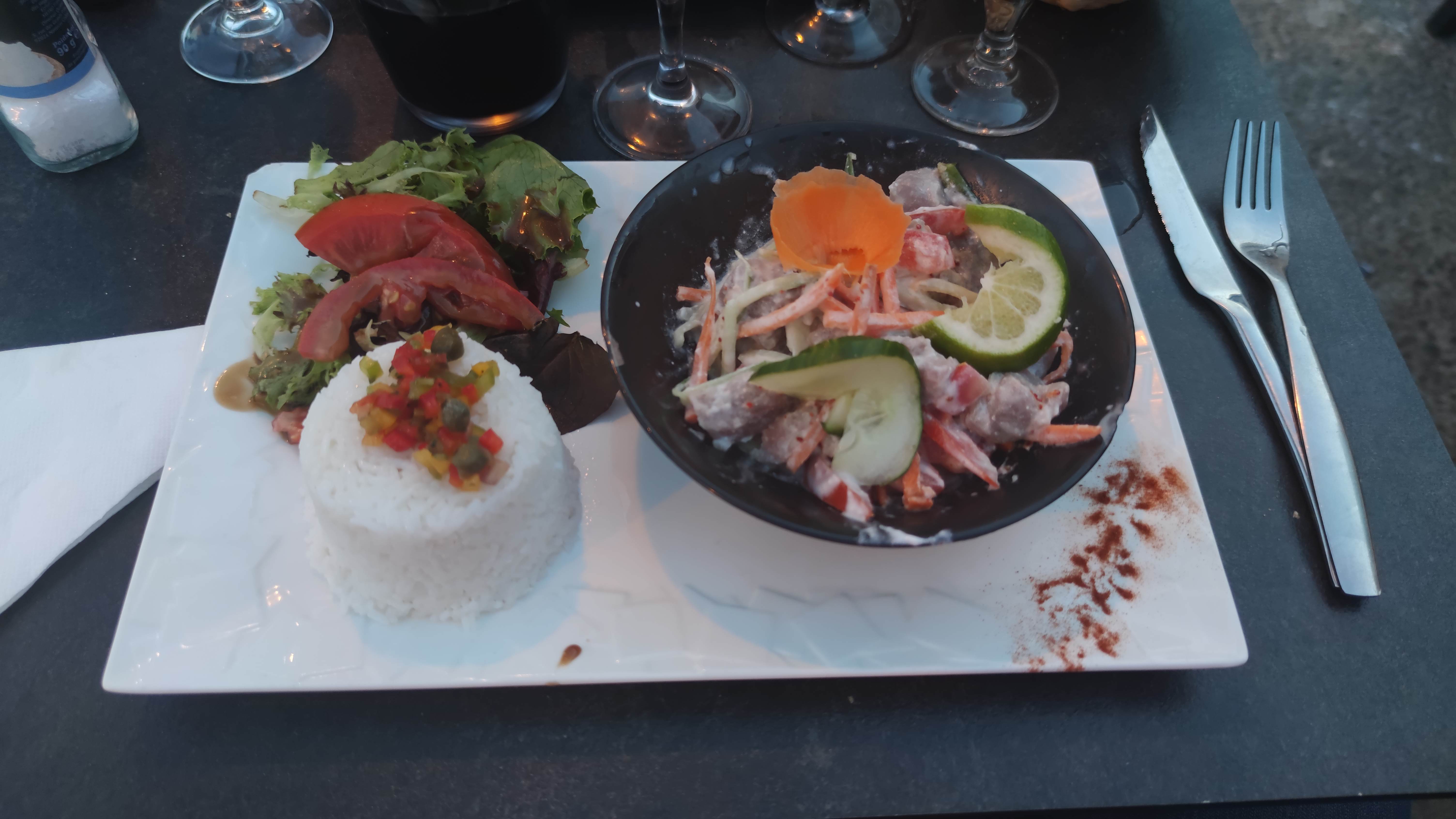 Magnifique repas, thon méthode Tahitien excellent, salade César bien chargée, service sympathique où l'on vous laisse savourer votre repas. Sûrement l'un des meilleurs de Saint Pierre..... Félicitations à votre personnel et cuistot. Bravo