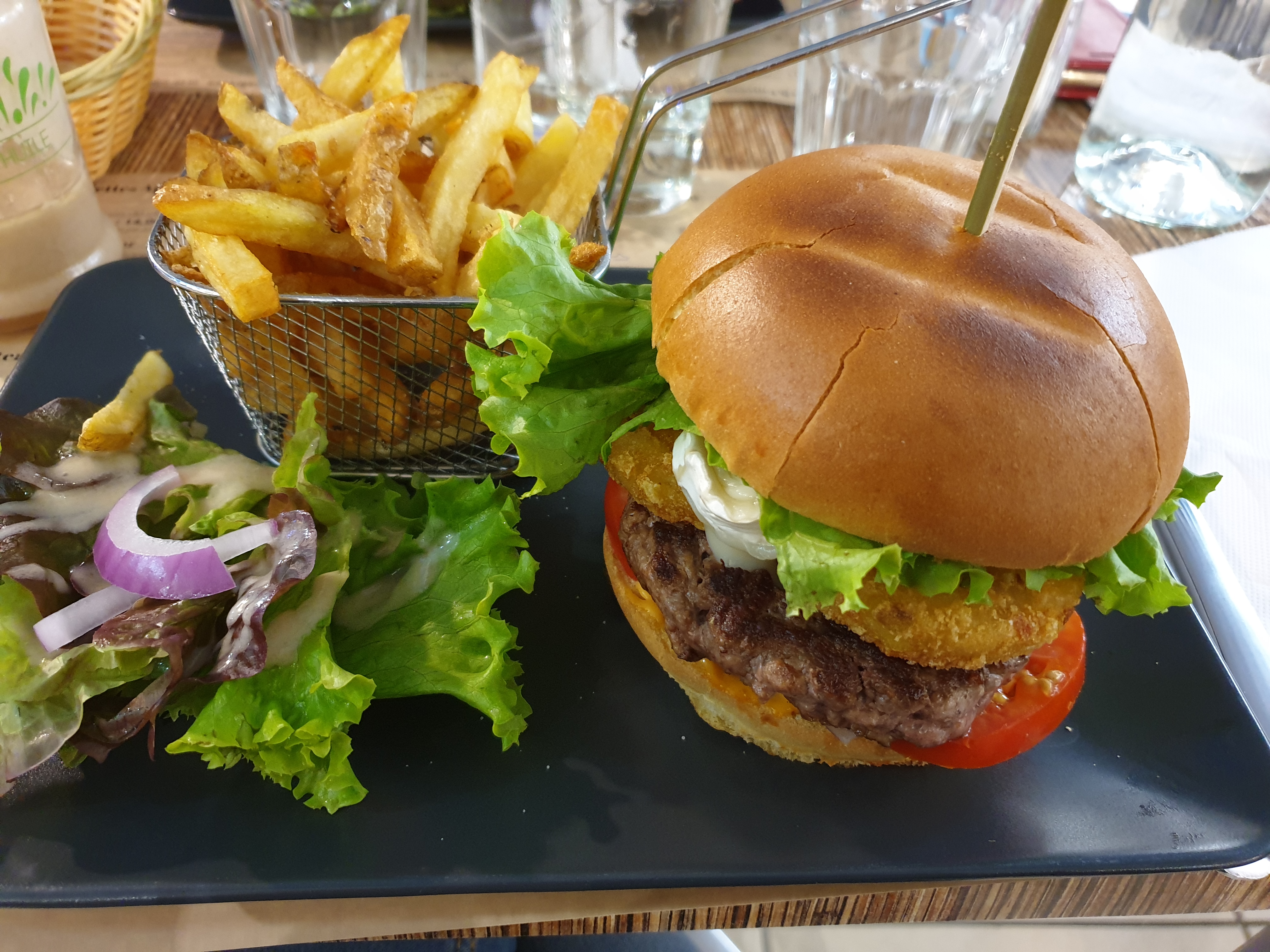 Très bonne cuisine et serveur sympa. Burger et moules frites, peut être mettre les frites dans un petit récipient afin de les maintenir chaude plus longtemps