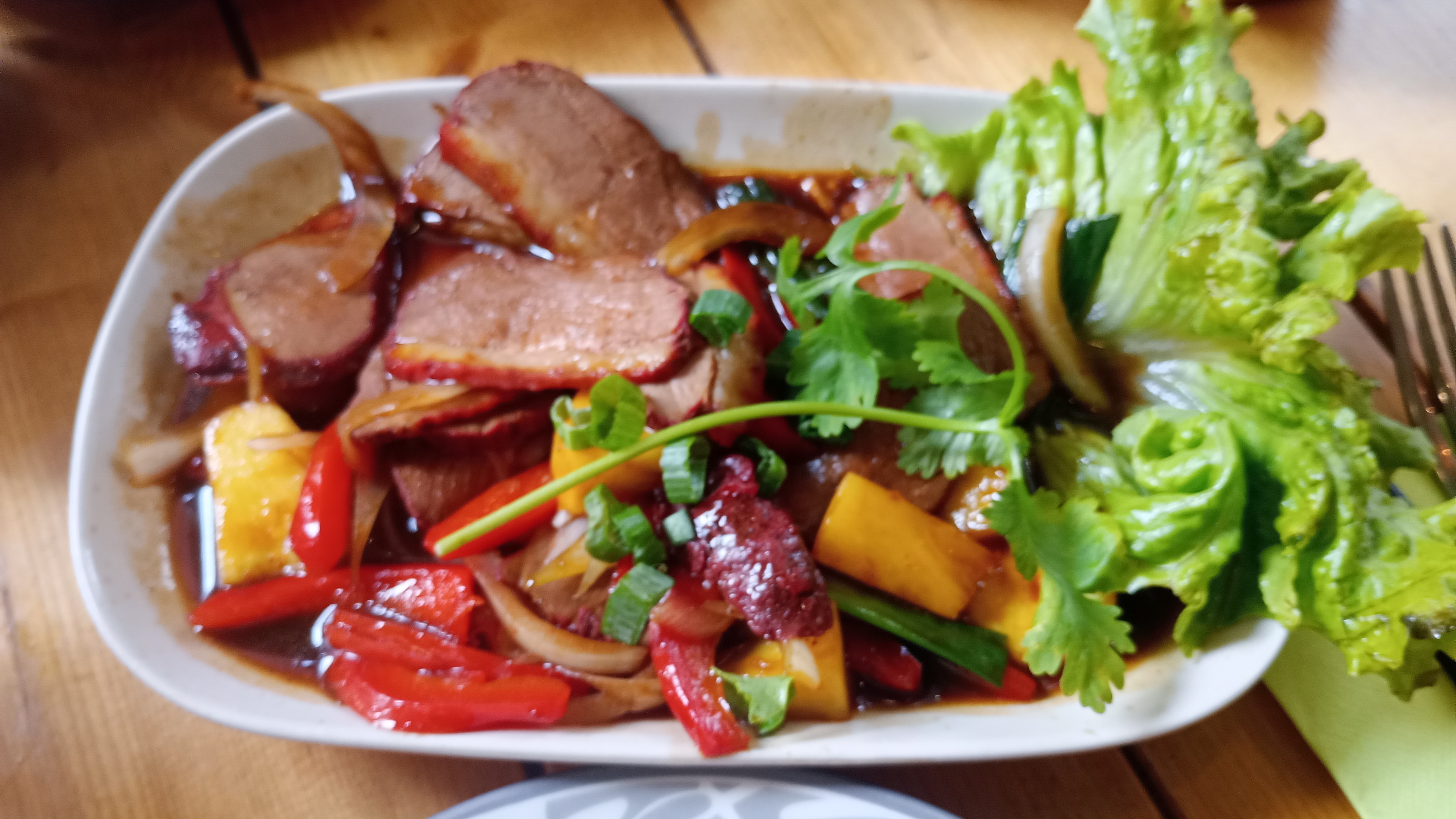 J'ai commandé le déjeuner spécial au curry et le canard aux légumes. Les deux étaient délicieux !! Les serveurs étaient accueillants et l'endroit était joliment décoré. Le seul inconvénient, c'était les moustiques à l'intérieur.