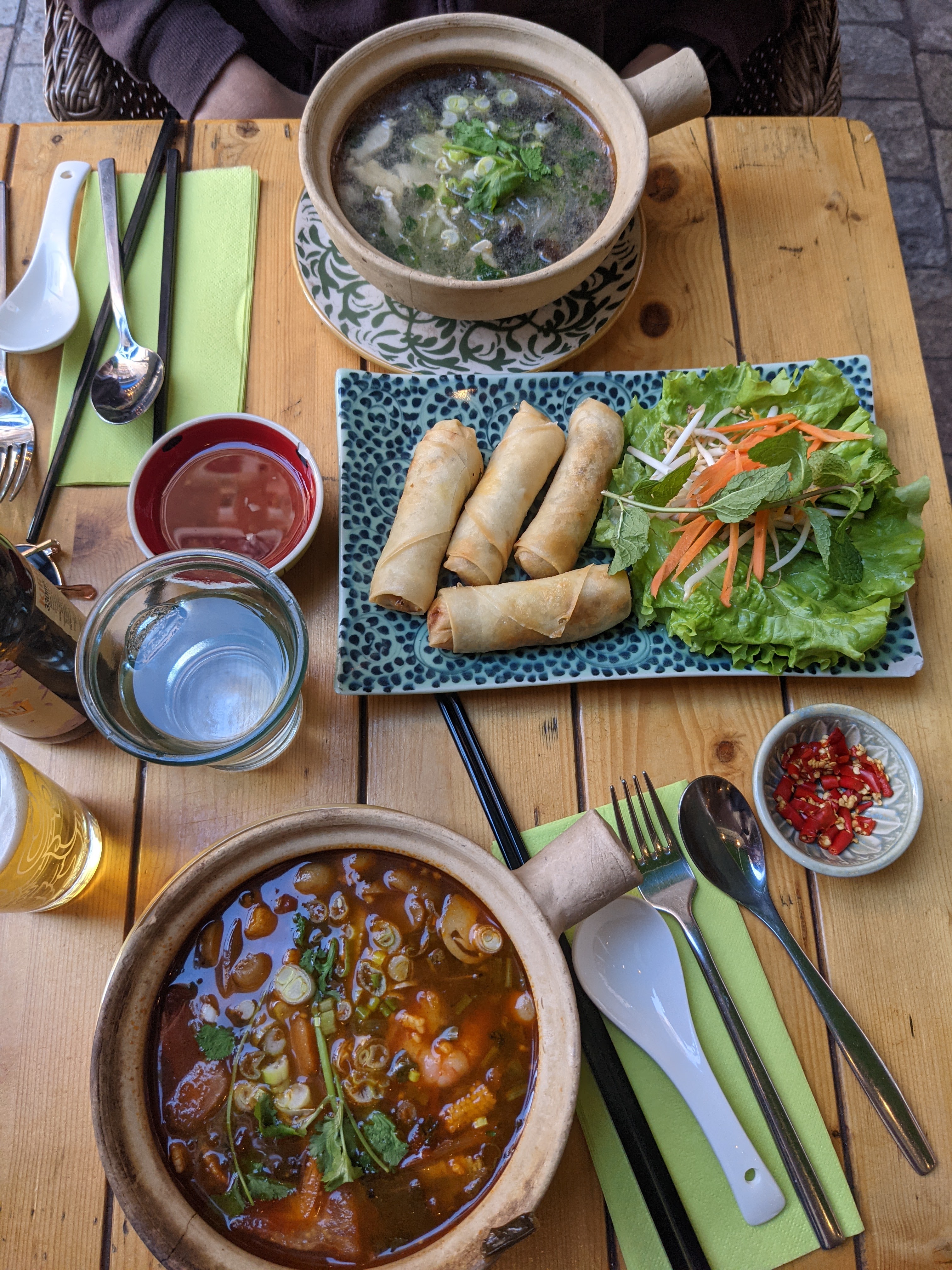 Un bon départ avec un mojito excellent sur une terrasse très agréable. Je n’ai jamais mangé un plat vietnamien aussi bon de toute ma vie. J’ai pris Poulet curry vert/ lait de coco, (ce plat était très relevé, presque un peu trop pour ceux qui craignent l’épicé léger) et des nouilles natures (on aurait dit qu’elles étaient pourtant cuisinées). Le serveur était vraiment très accueillant et le service s’est fait avec humour et attention. Si je n’avais pas été touriste, je serais revenue y manger dans la semaine ! J’en ai encore le goût sur les lèvres. Seul bémol : service un peu lent